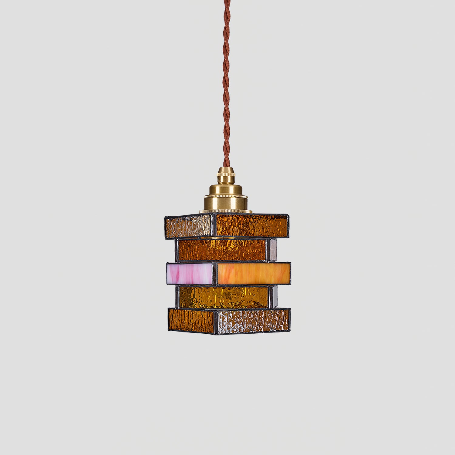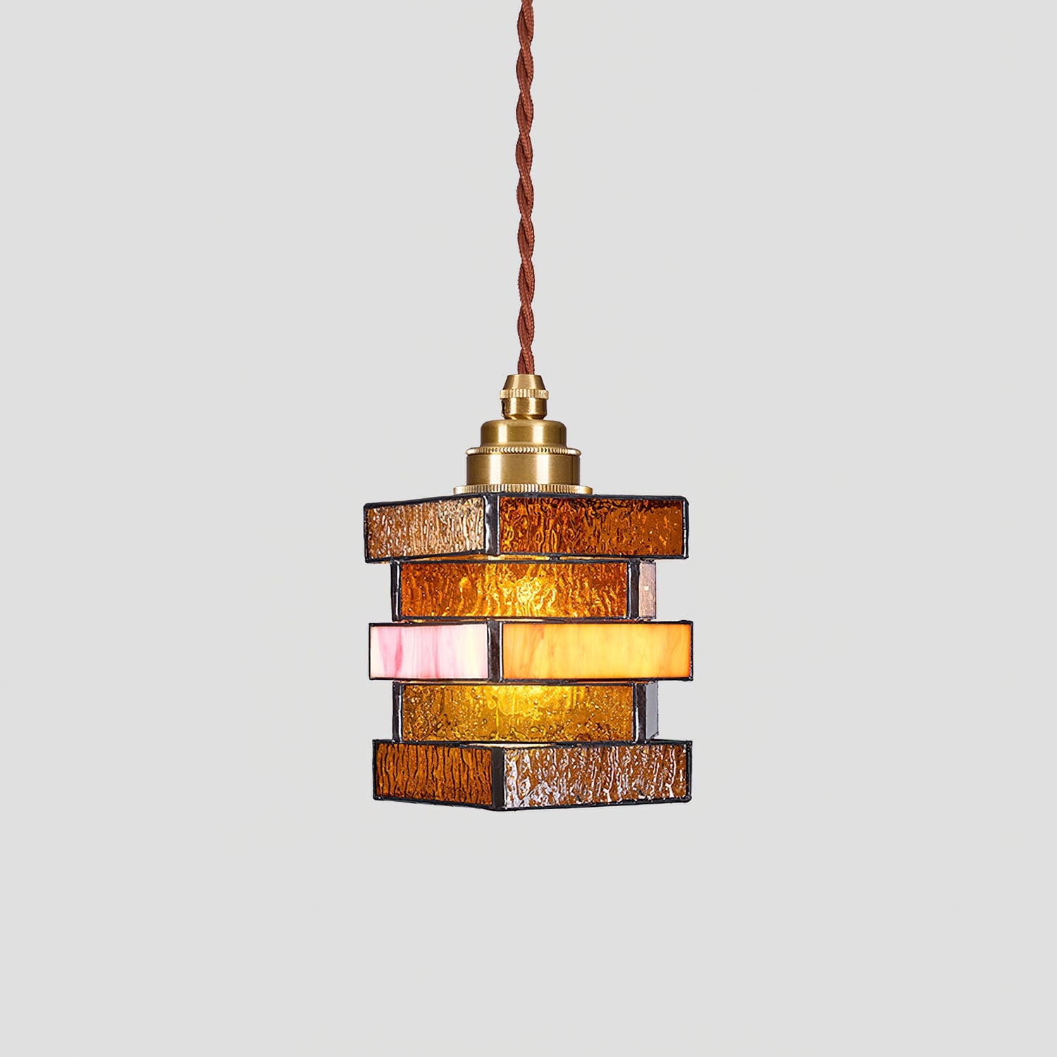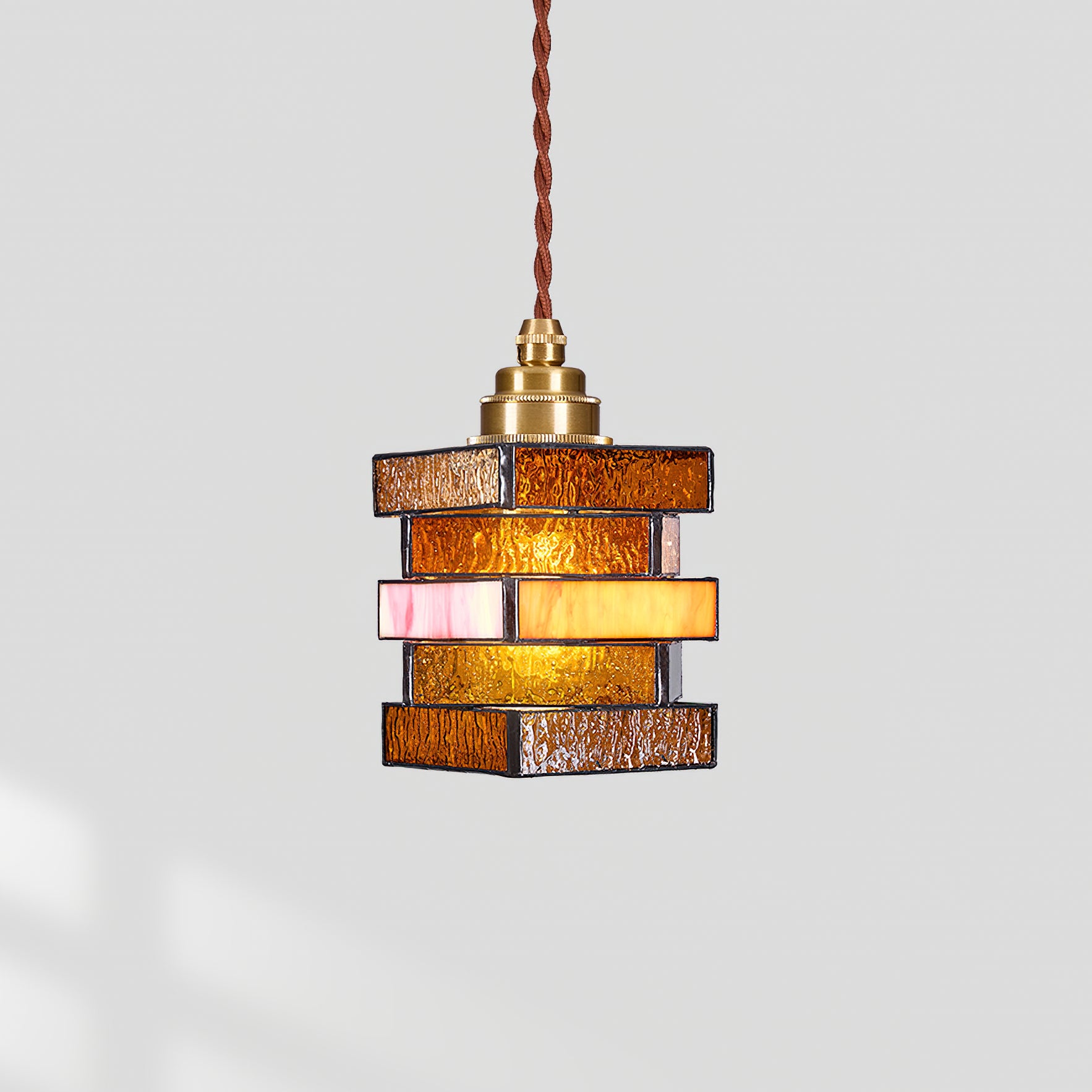 The Dale Glass Pendant Light from Mooijane blends iron and stained glass to create a warm, vintage-inspired aesthetic. Layered glass shades cast a soft, brown and pink-orange glow, evoking the charm of handcrafted stained glass art. Its sturdy metal base complements the elegant design, making it a striking decorative piece even when unlit.