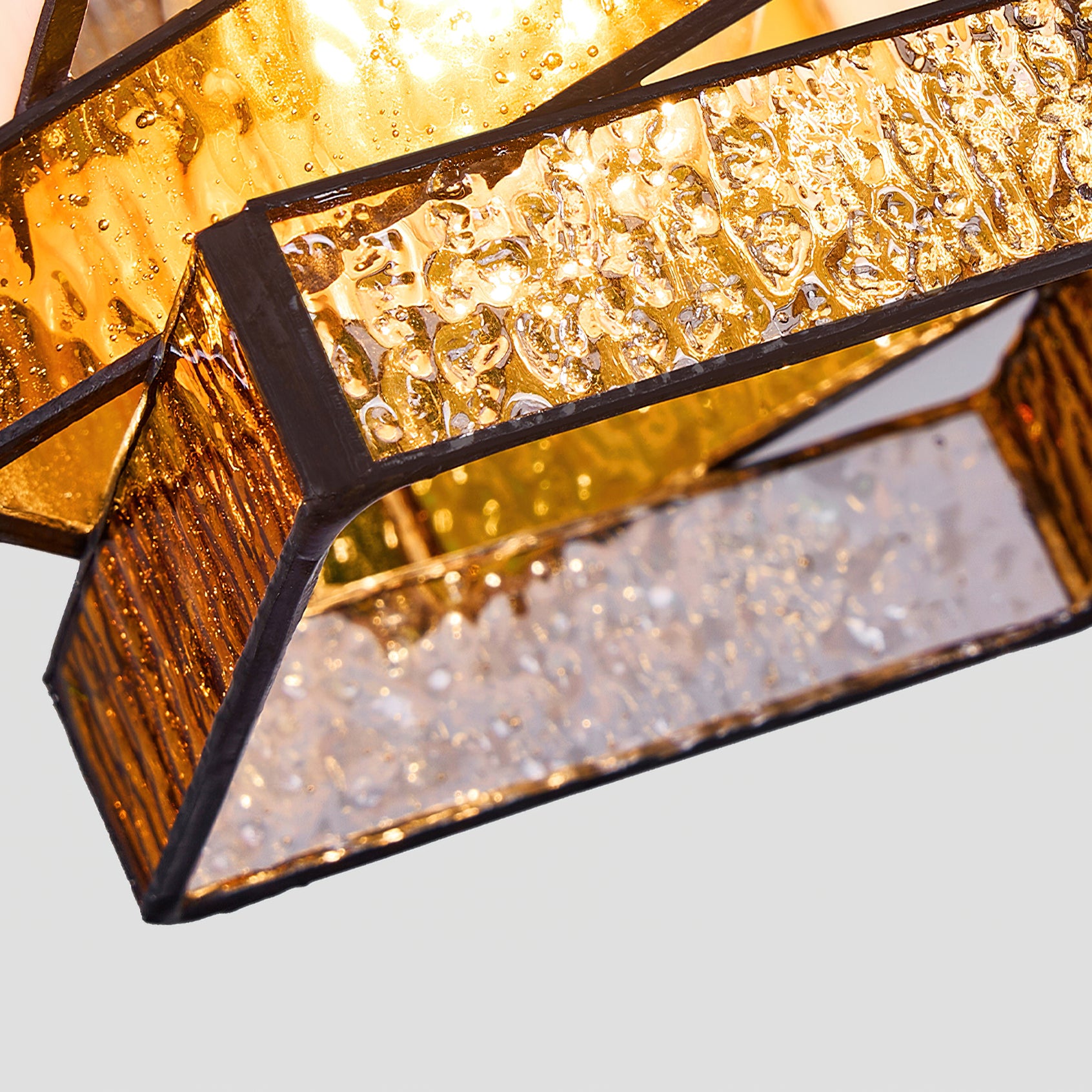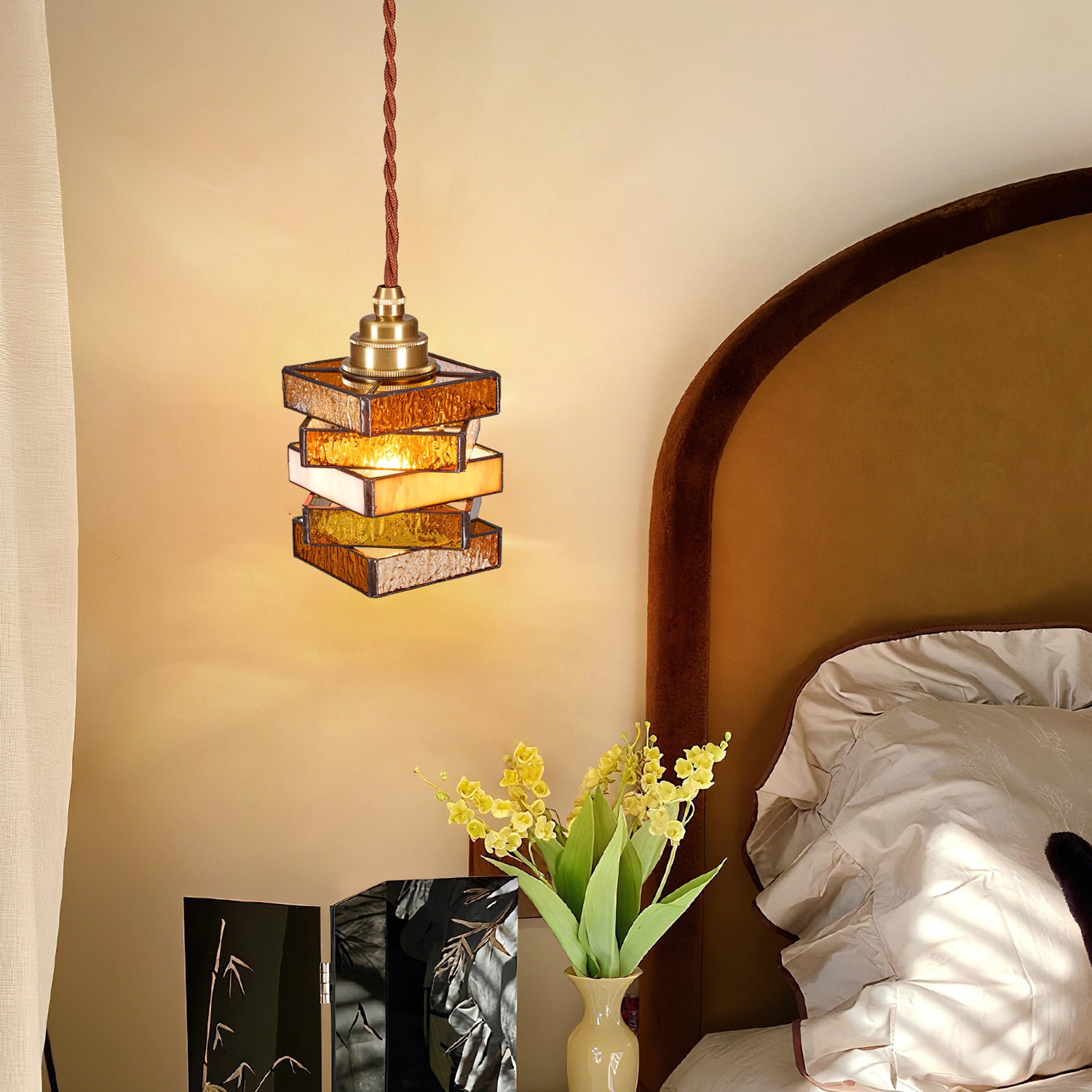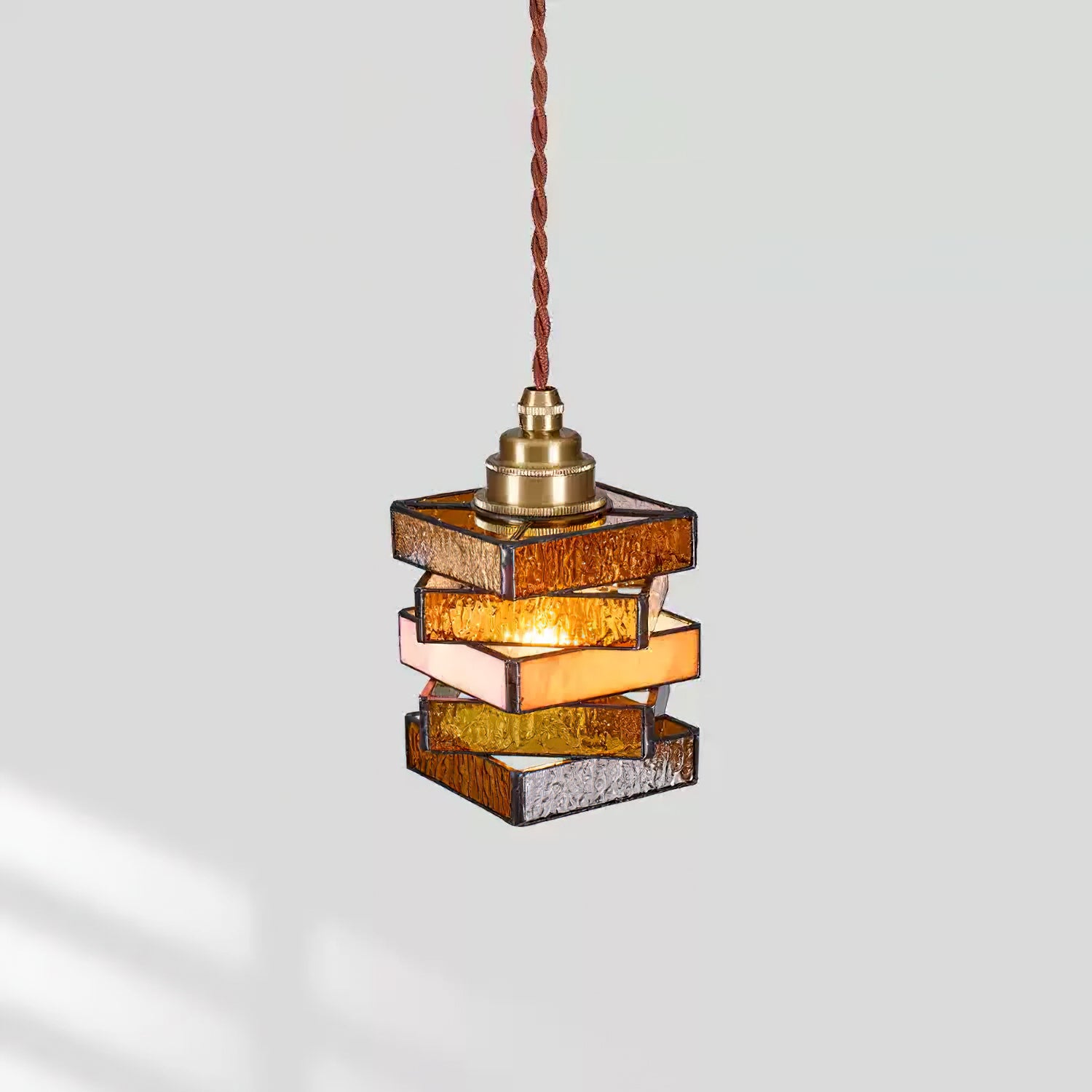 The Dale Glass Pendant Light from Mooijane blends iron and stained glass to create a warm, vintage-inspired aesthetic. Layered glass shades cast a soft, brown and pink-orange glow, evoking the charm of handcrafted stained glass art. Its sturdy metal base complements the elegant design, making it a striking decorative piece even when unlit.