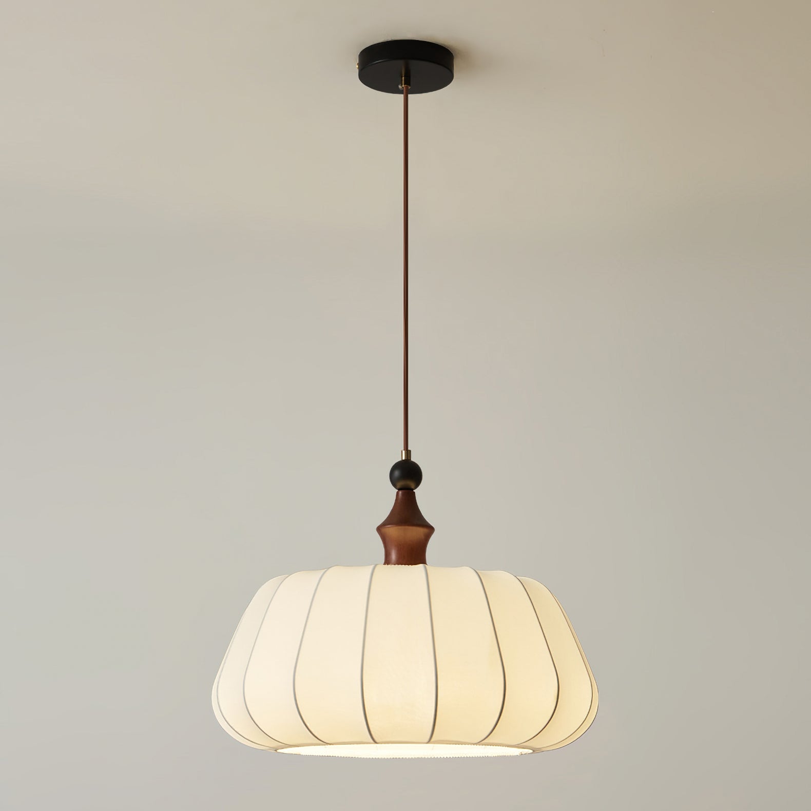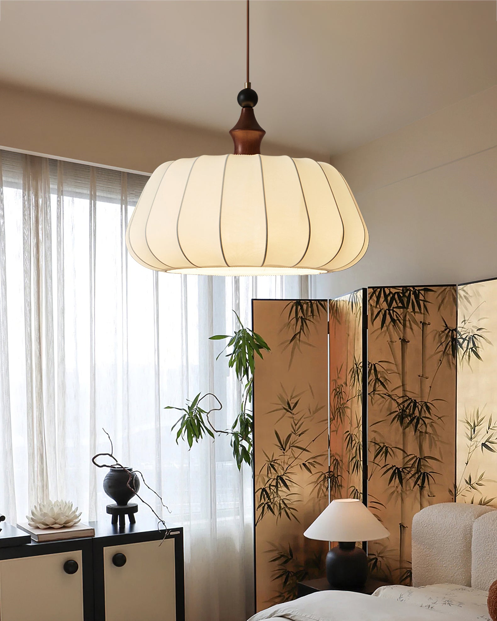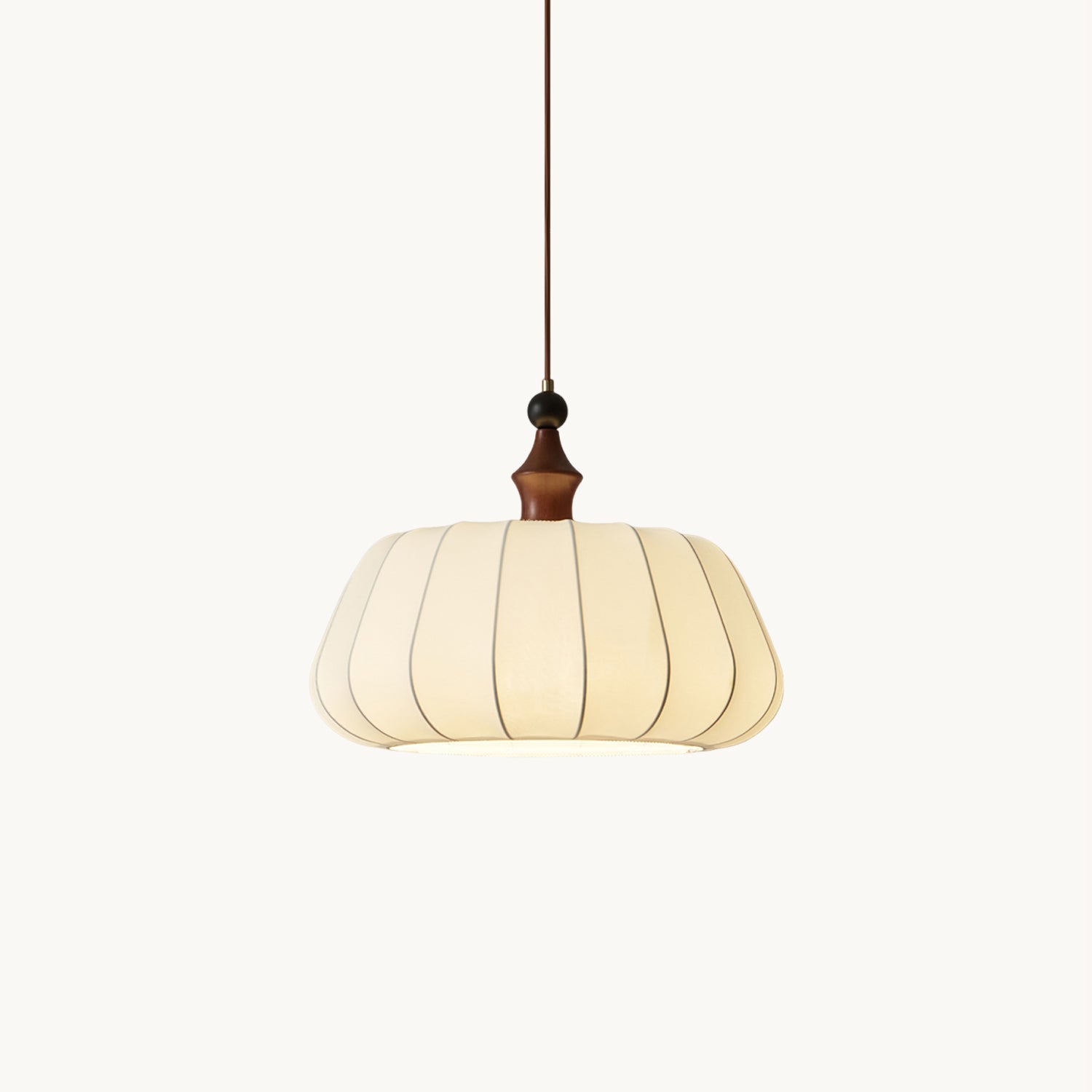 The Daynav Pendant Light from Mooijane blends natural materials with refined craftsmanship. Featuring a solid wood top that highlights the warm, organic grain, it’s paired with a hand-wrapped off-white fabric shade inspired by lanterns or pumpkins. Its soft, rounded silhouette evokes vintage charm while casting a warm, inviting glow.