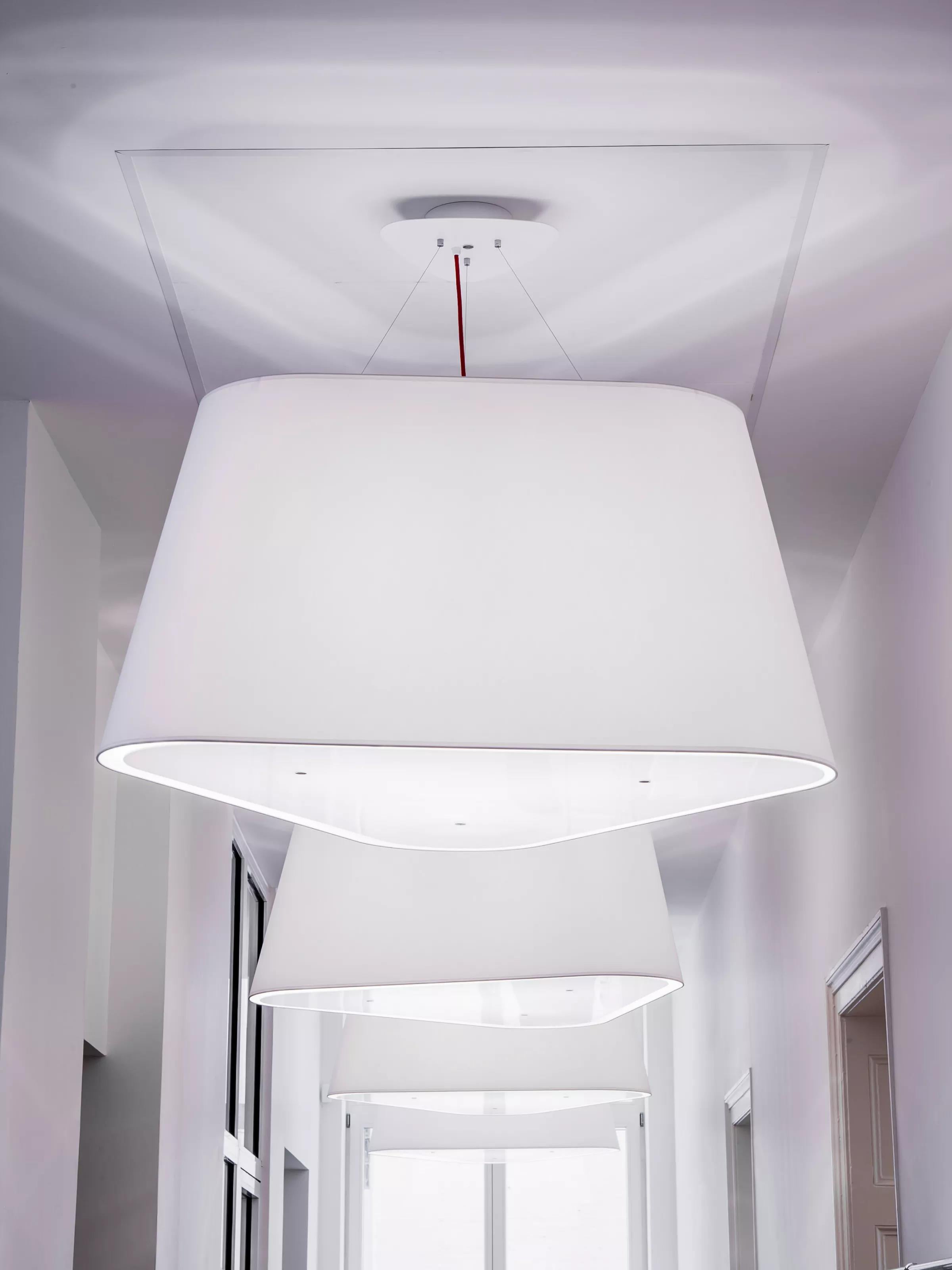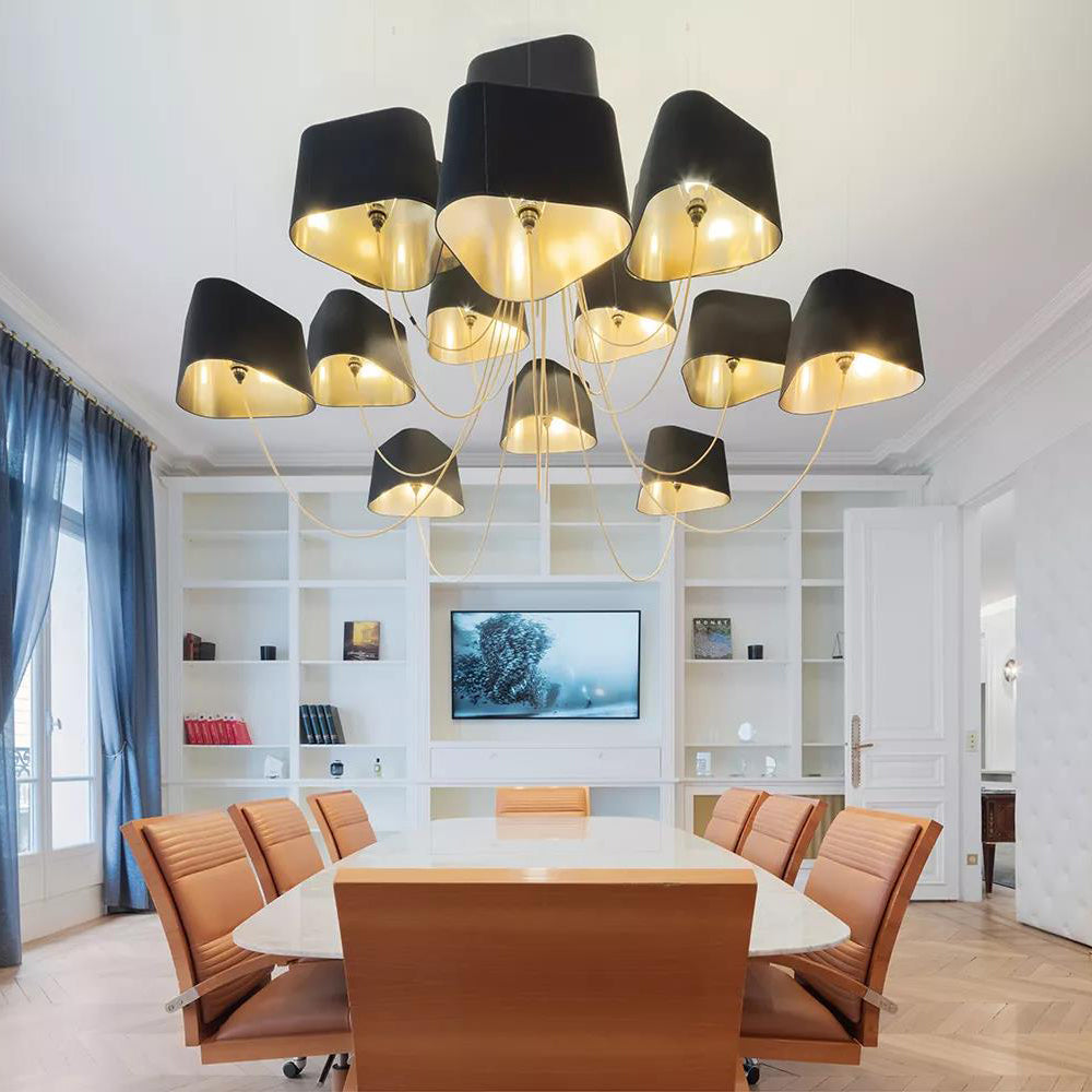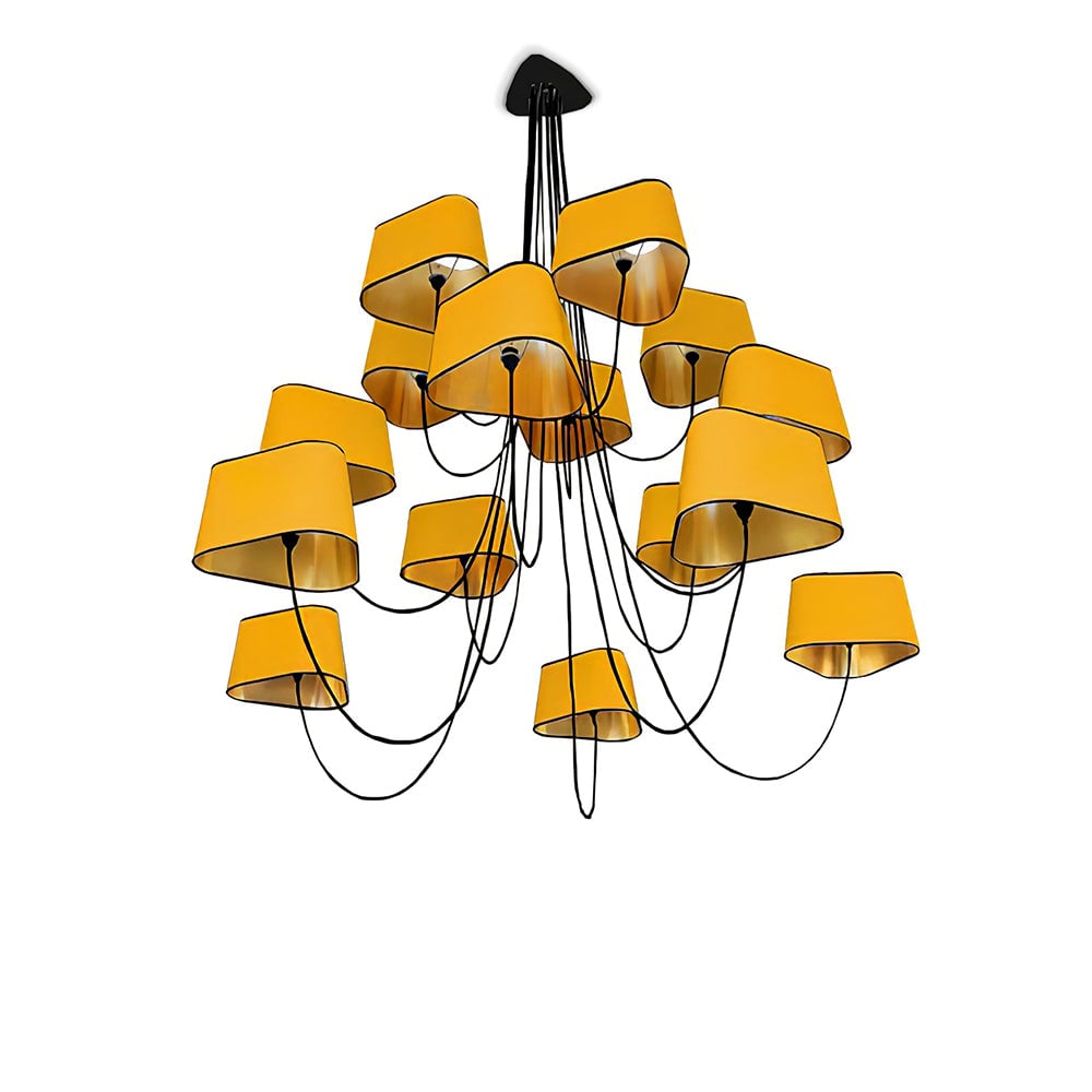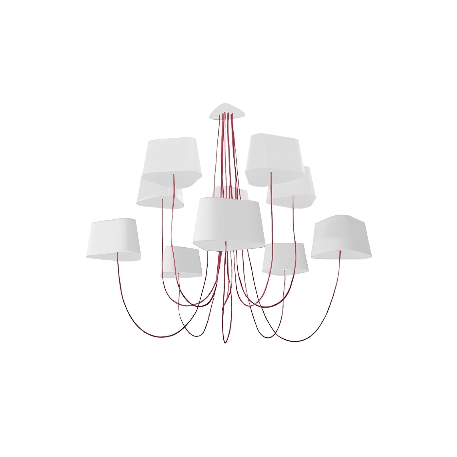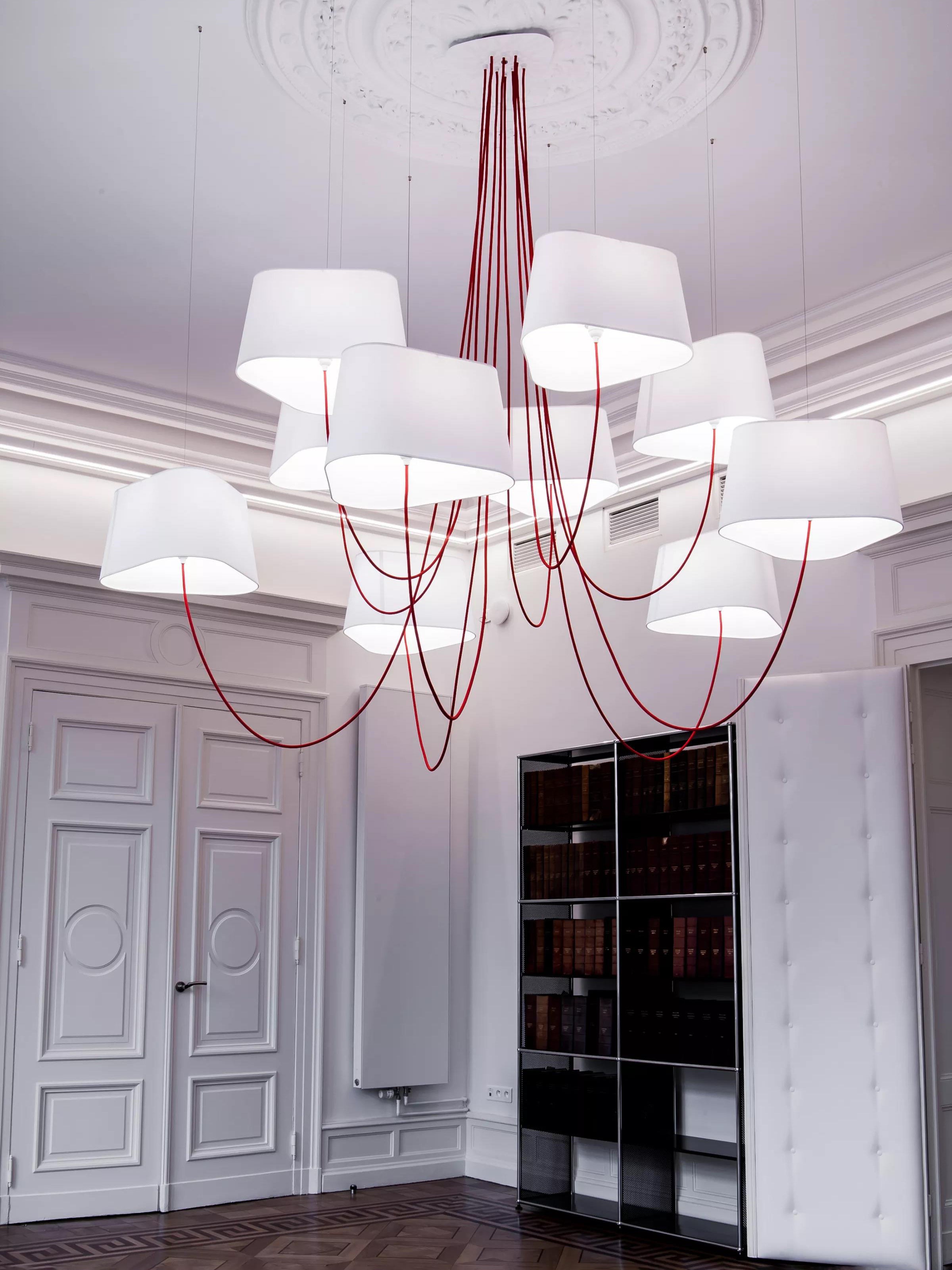 Available in two fixing systems, wall-mounted, or, suspended version. Attached to steel cables, the shades can be raised or lowered as required with a piston mechanism situated on the top. Adjustable in height, this chandelier is also adjustable in diameter and shape depending on the placement of the lampshades. Located under the lamp shades, colored textile cords also serve as decorative elements.