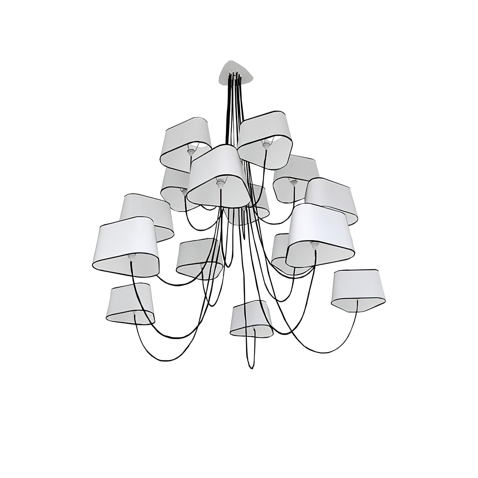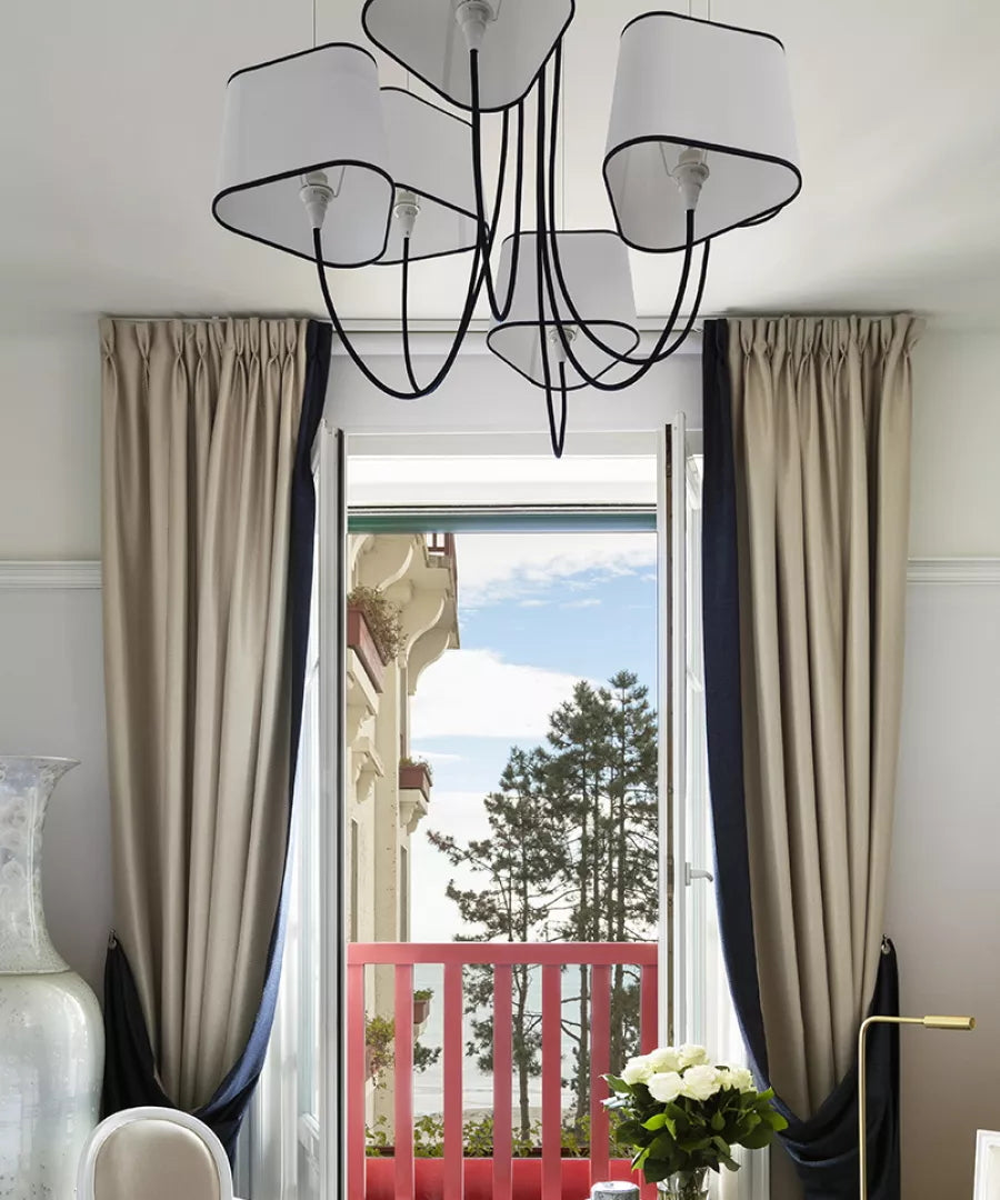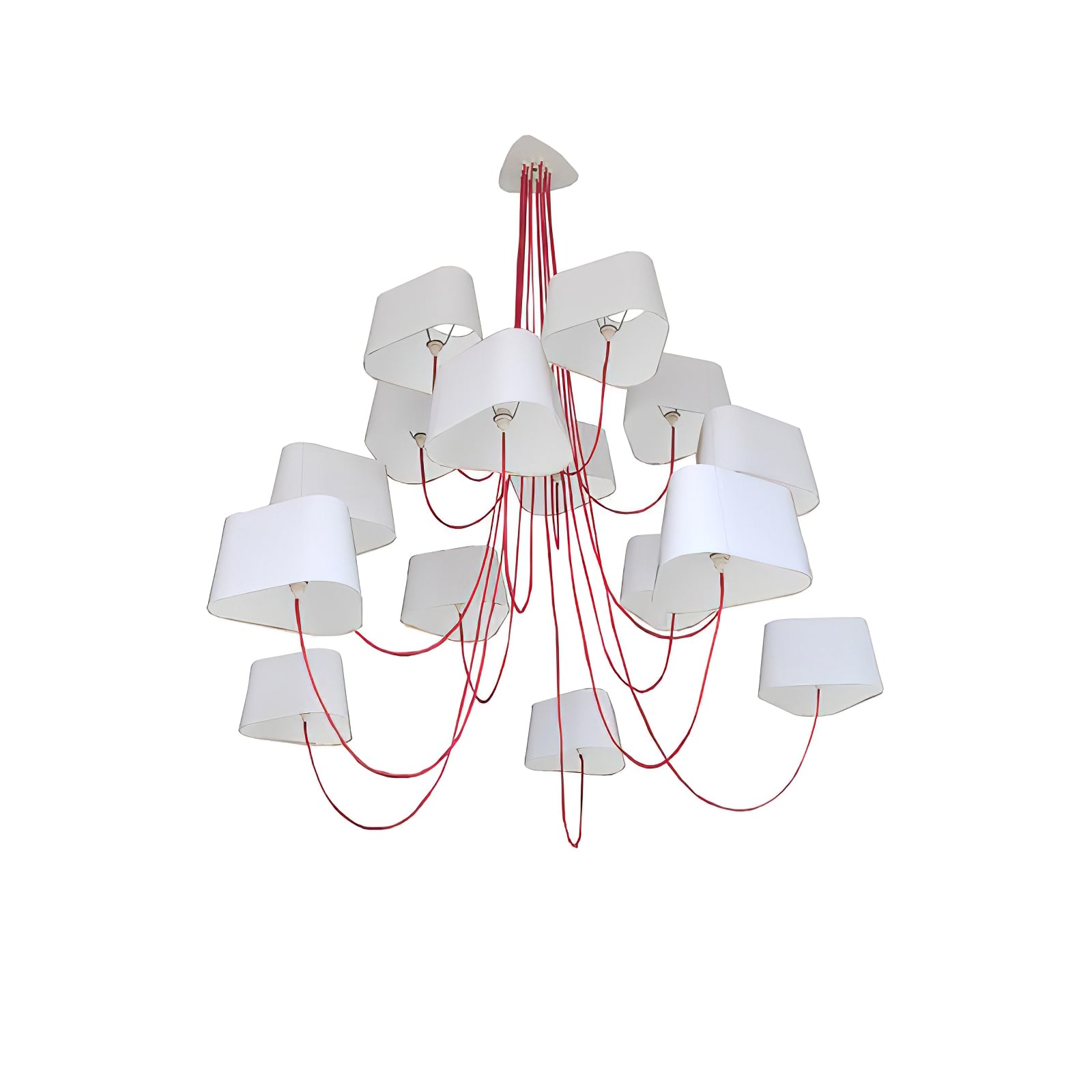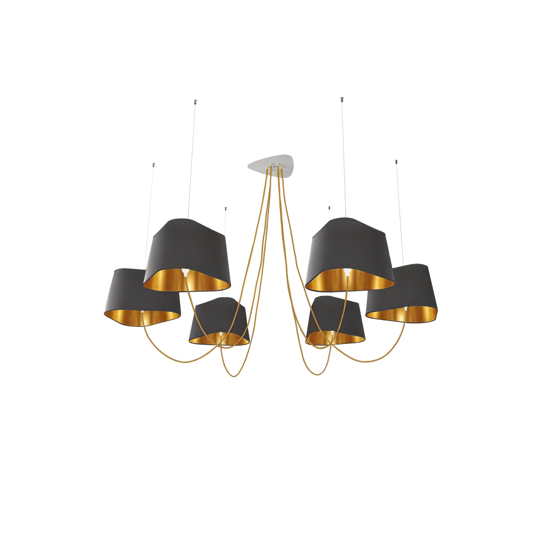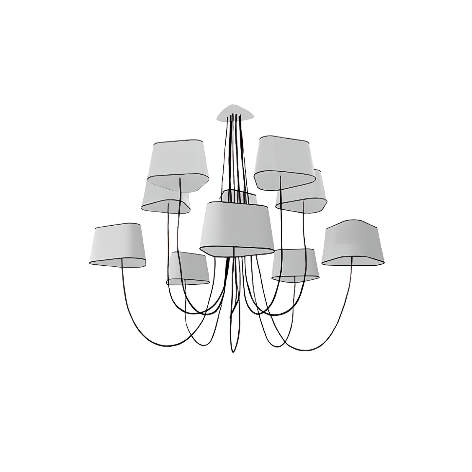 Available in two fixing systems, wall-mounted, or, suspended version. Attached to steel cables, the shades can be raised or lowered as required with a piston mechanism situated on the top. Adjustable in height, this chandelier is also adjustable in diameter and shape depending on the placement of the lampshades. Located under the lamp shades, colored textile cords also serve as decorative elements.