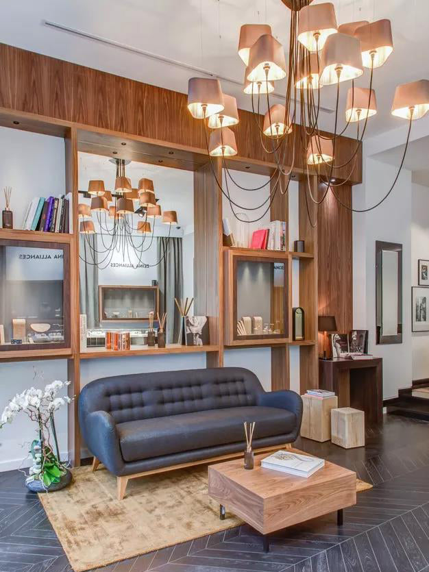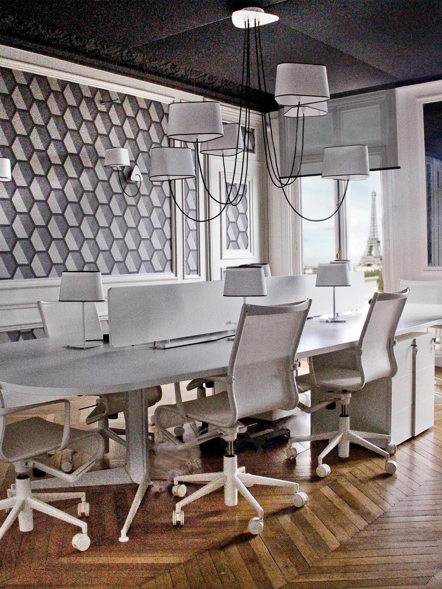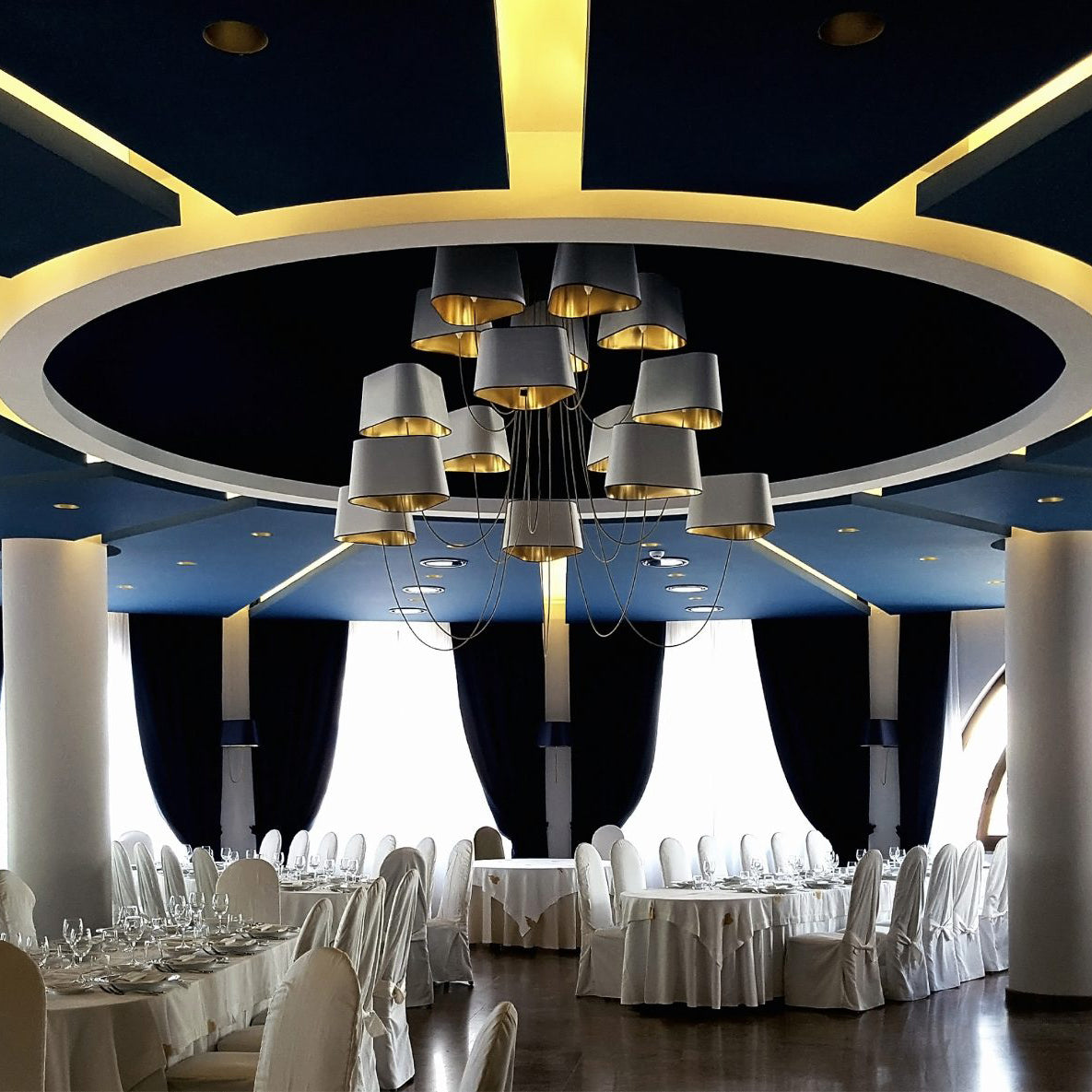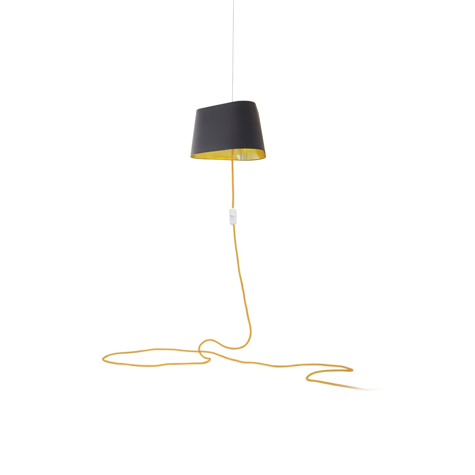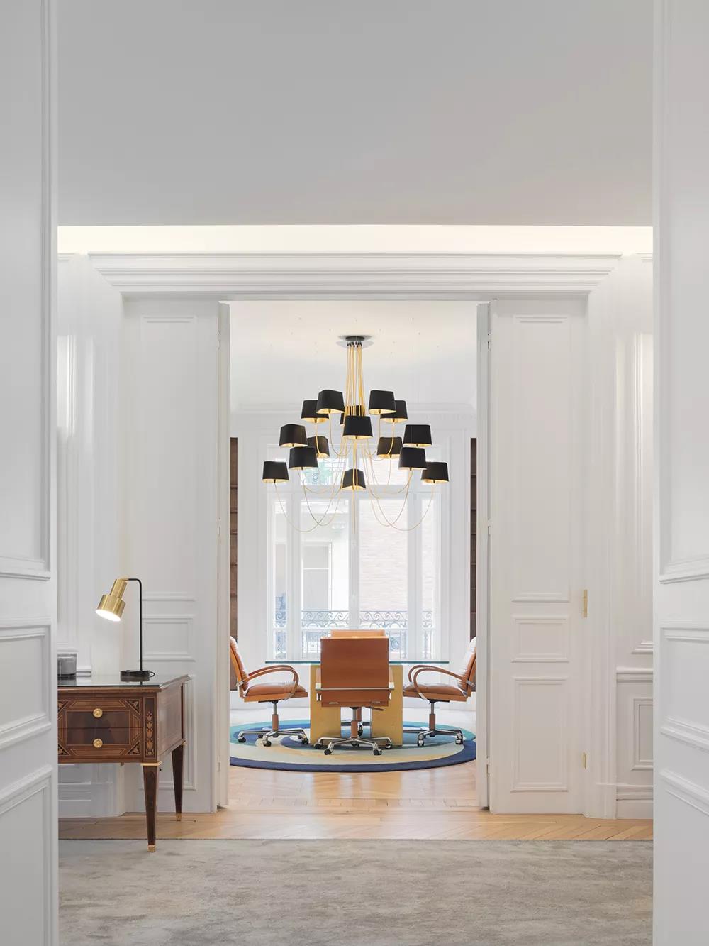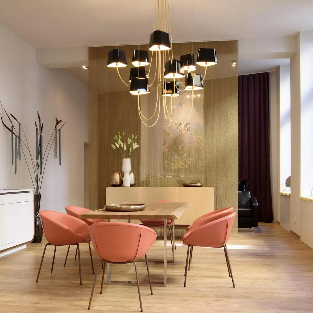 Available in two fixing systems, wall-mounted, or, suspended version. Attached to steel cables, the shades can be raised or lowered as required with a piston mechanism situated on the top. Adjustable in height, this chandelier is also adjustable in diameter and shape depending on the placement of the lampshades. Located under the lamp shades, colored textile cords also serve as decorative elements.