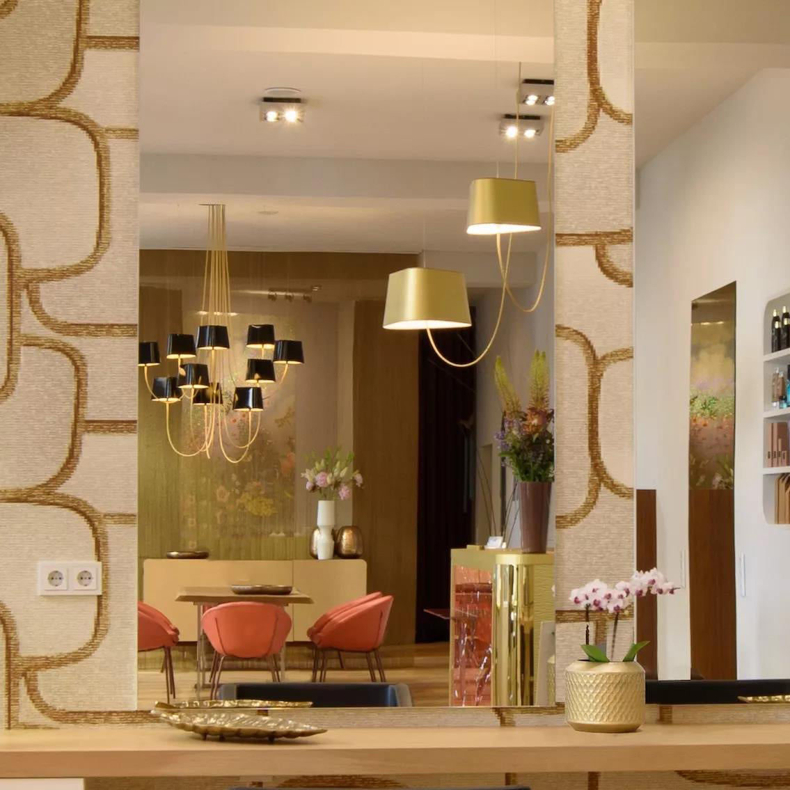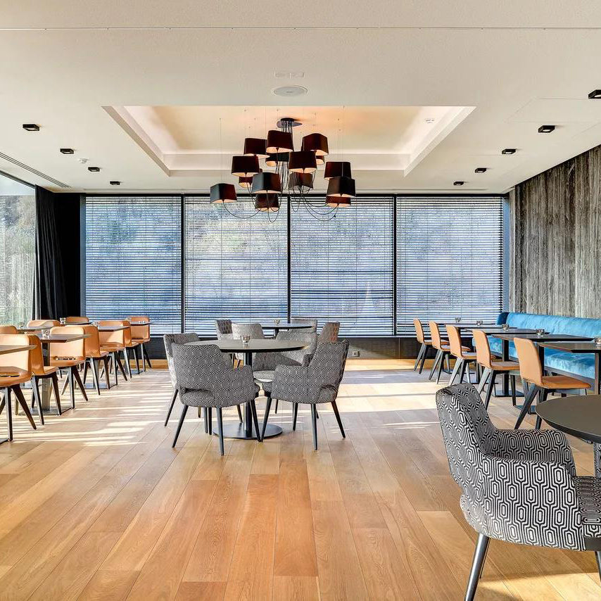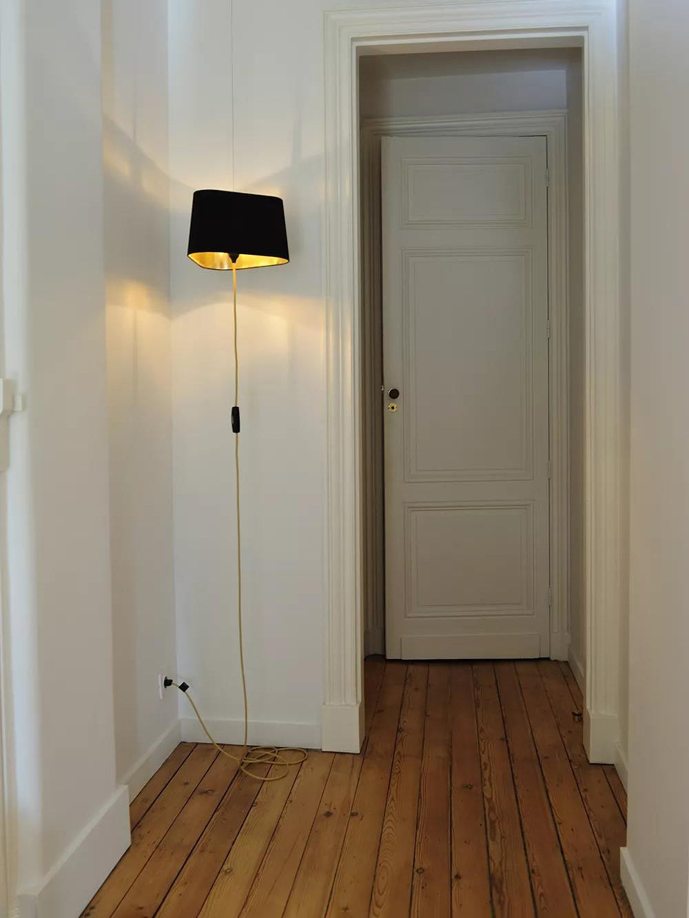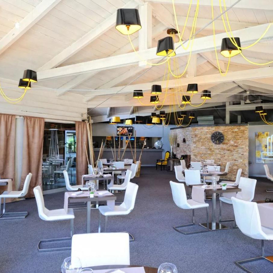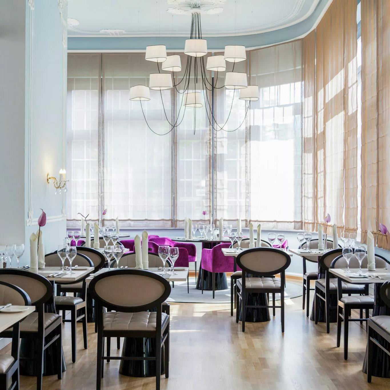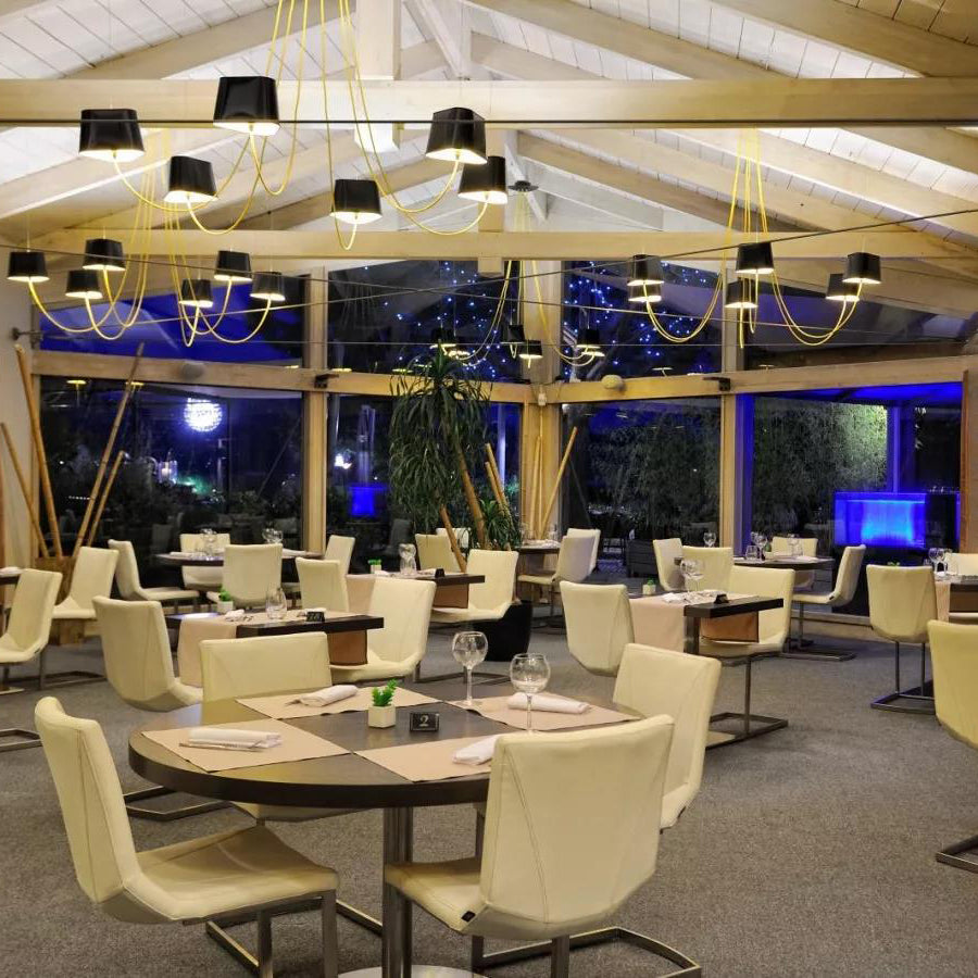 Available in two fixing systems, wall-mounted, or, suspended version. Attached to steel cables, the shades can be raised or lowered as required with a piston mechanism situated on the top. Adjustable in height, this chandelier is also adjustable in diameter and shape depending on the placement of the lampshades. Located under the lamp shades, colored textile cords also serve as decorative elements.