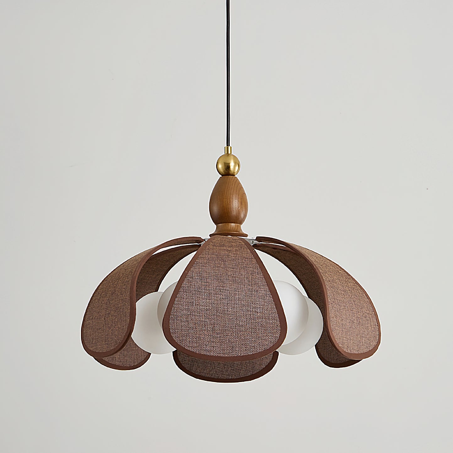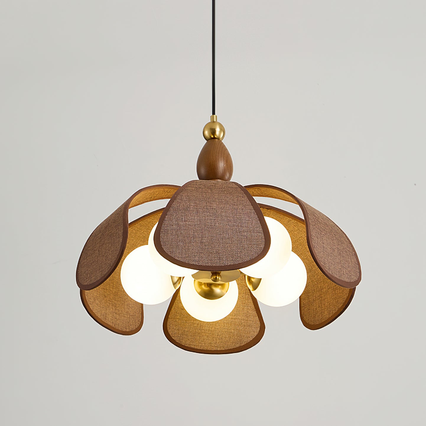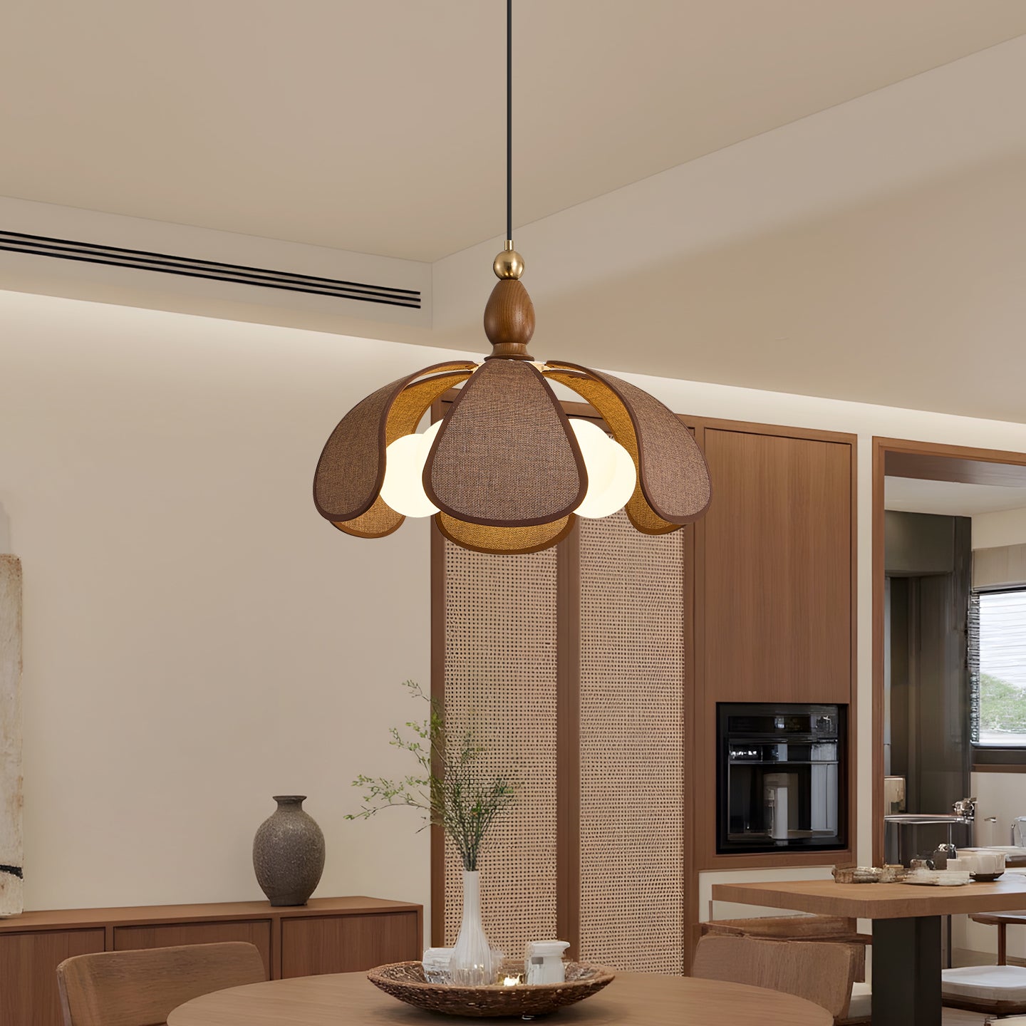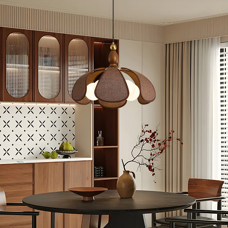 The Delfina Pendant Lamp from Mooijane blends raffia, glass, and wood for a natural yet sophisticated design. The warm wooden base, accented with a golden ball detail, complements the flower petal-shaped raffia shade, while the glass bulbs cast a soft, inviting glow. Perfect for dining rooms, living spaces, or bedrooms, it brings a touch of elegance and comfort to any room.