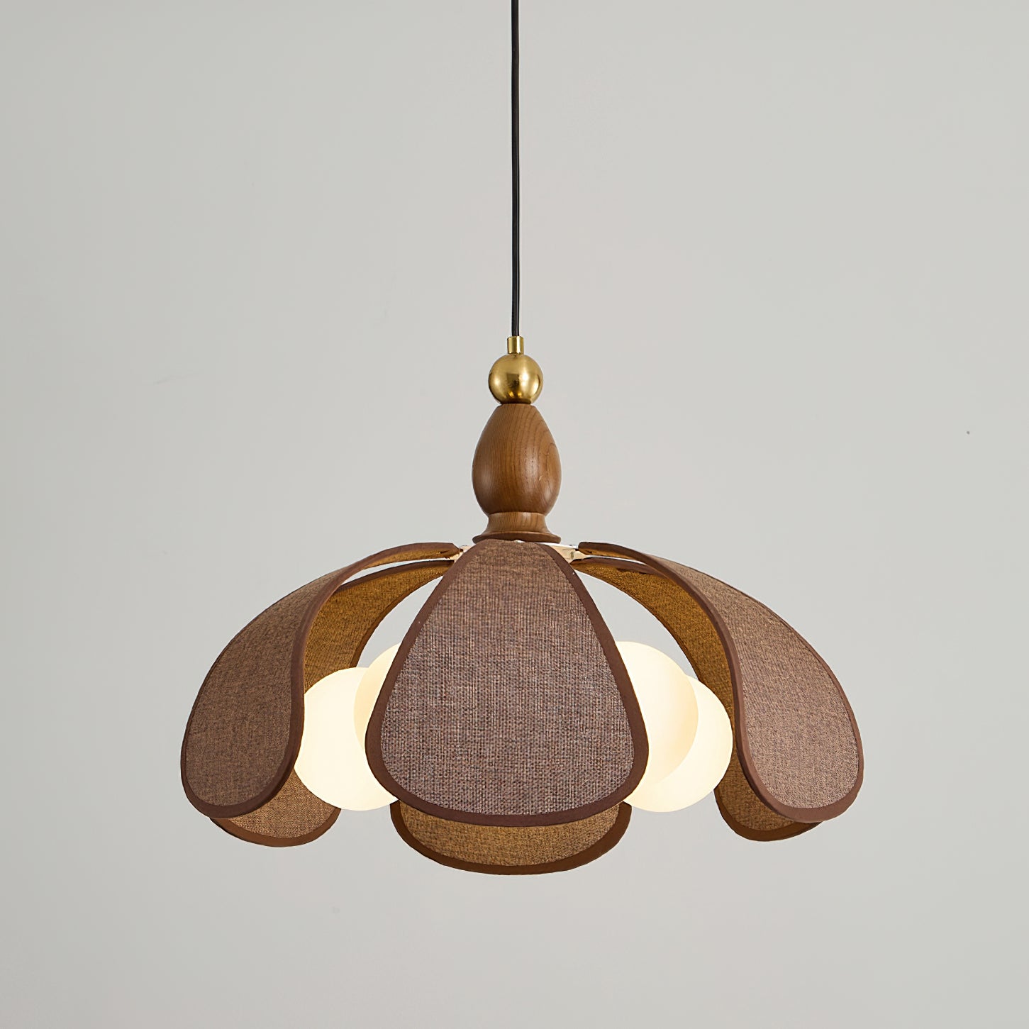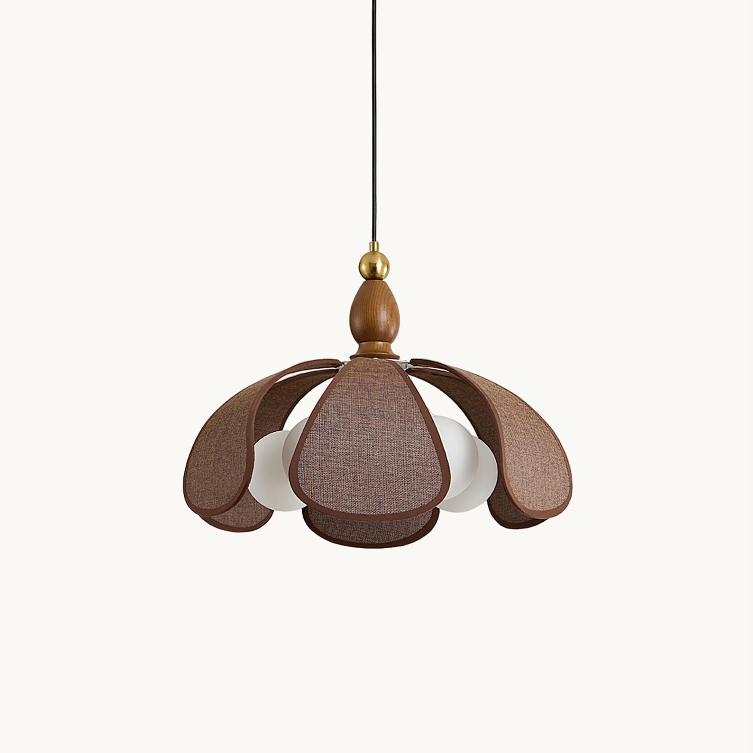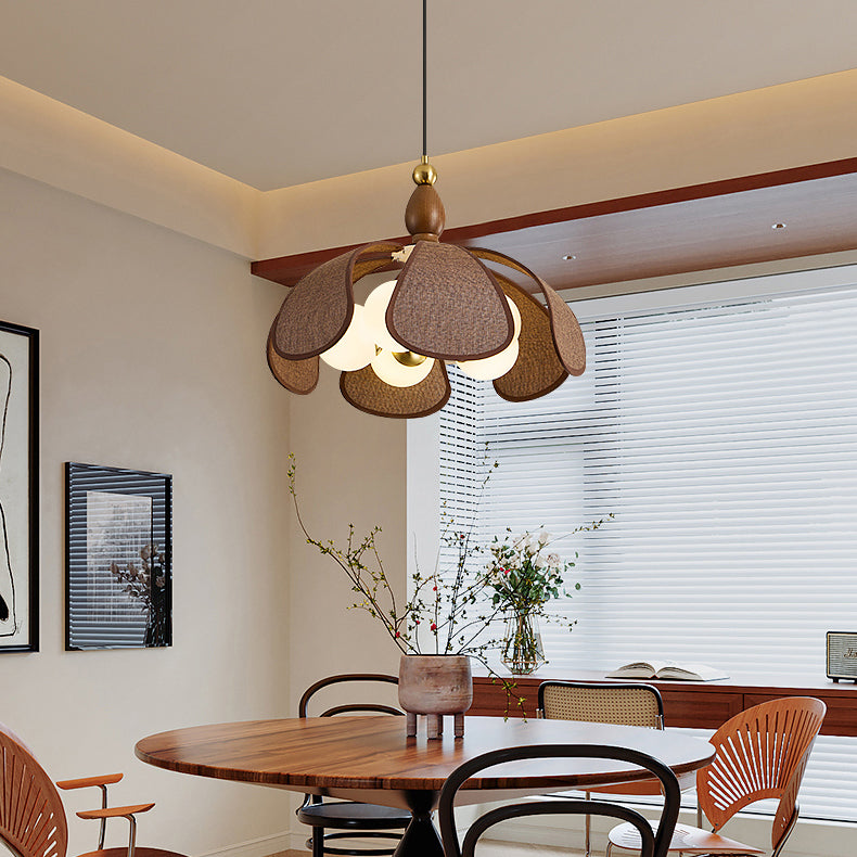 The Delfina Pendant Lamp from Mooijane blends raffia, glass, and wood for a natural yet sophisticated design. The warm wooden base, accented with a golden ball detail, complements the flower petal-shaped raffia shade, while the glass bulbs cast a soft, inviting glow. Perfect for dining rooms, living spaces, or bedrooms, it brings a touch of elegance and comfort to any room.