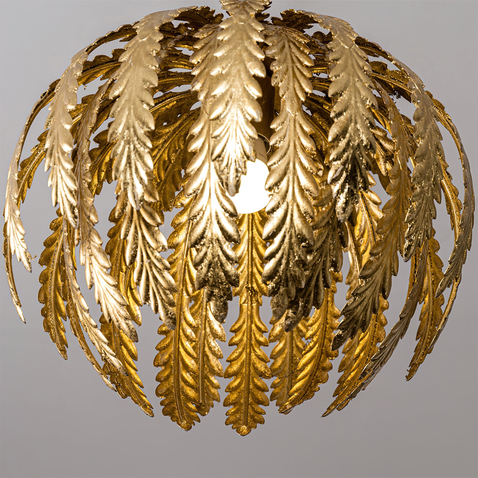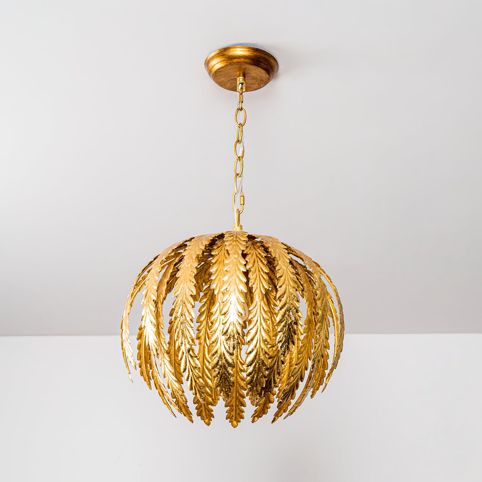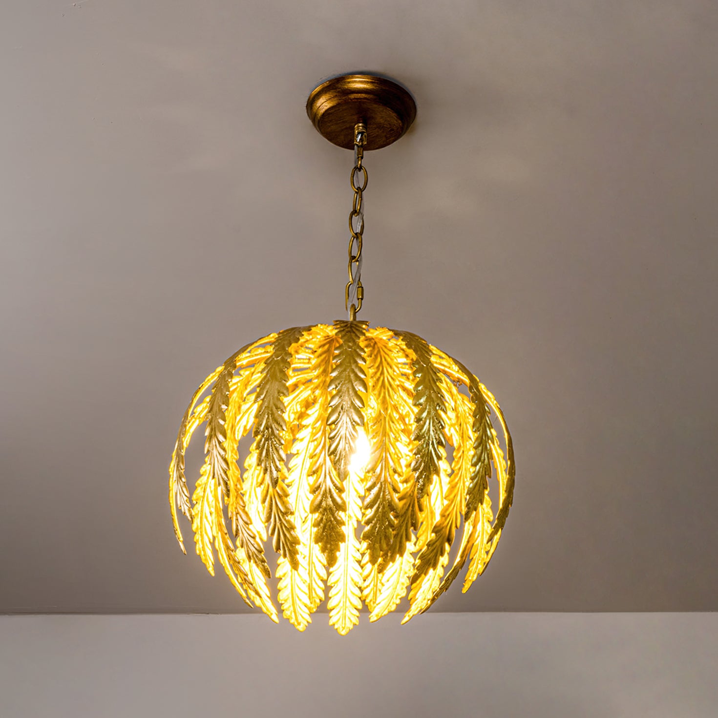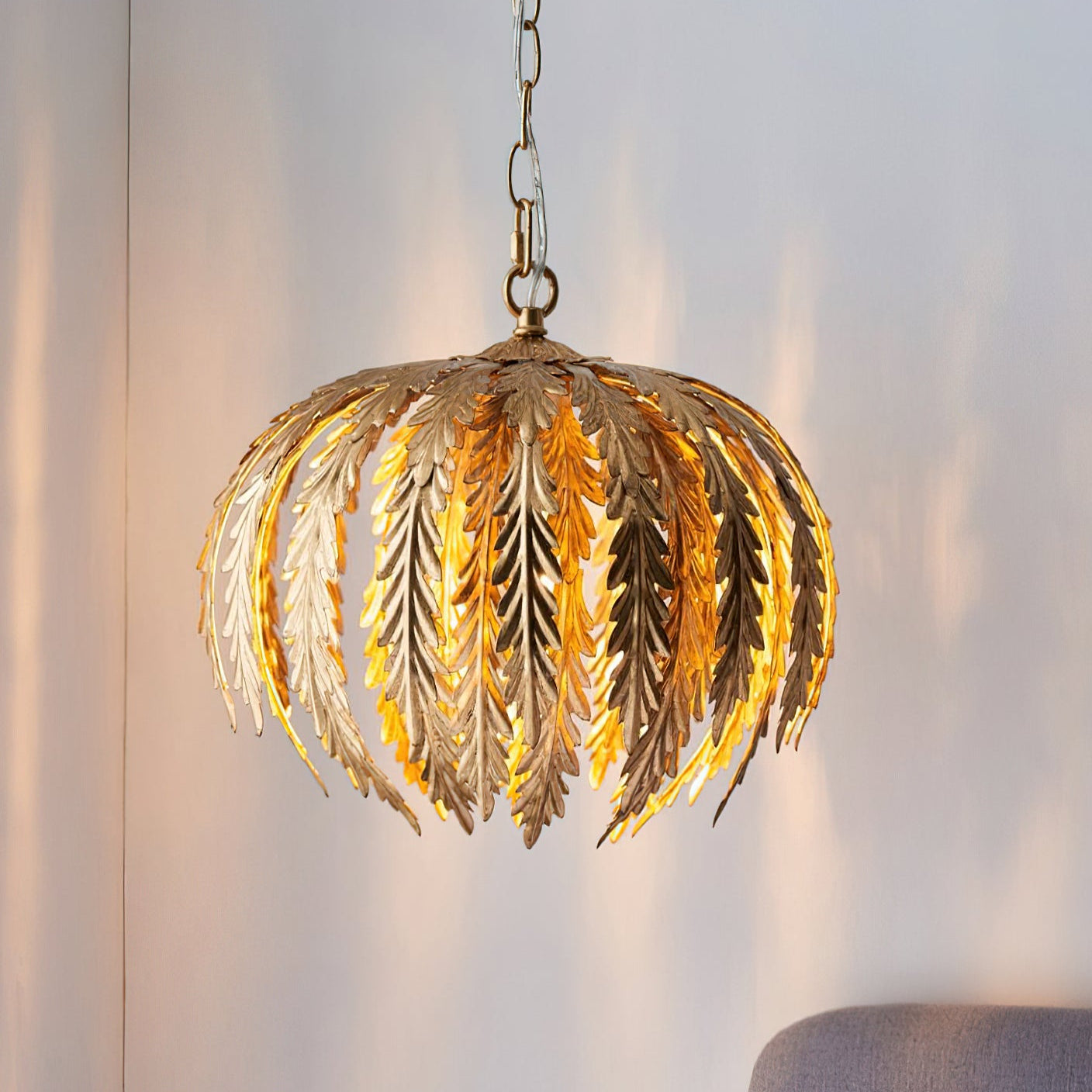 Transform your living space with the Delphine Pendant Lamp by Mooijane. This stunning chandelier features intricately designed golden feathers that dance in the light, while the height-adjustable chains allow for a customizable and enchanting ambiance. Elevate your decor with this opulent and exclusive piece.