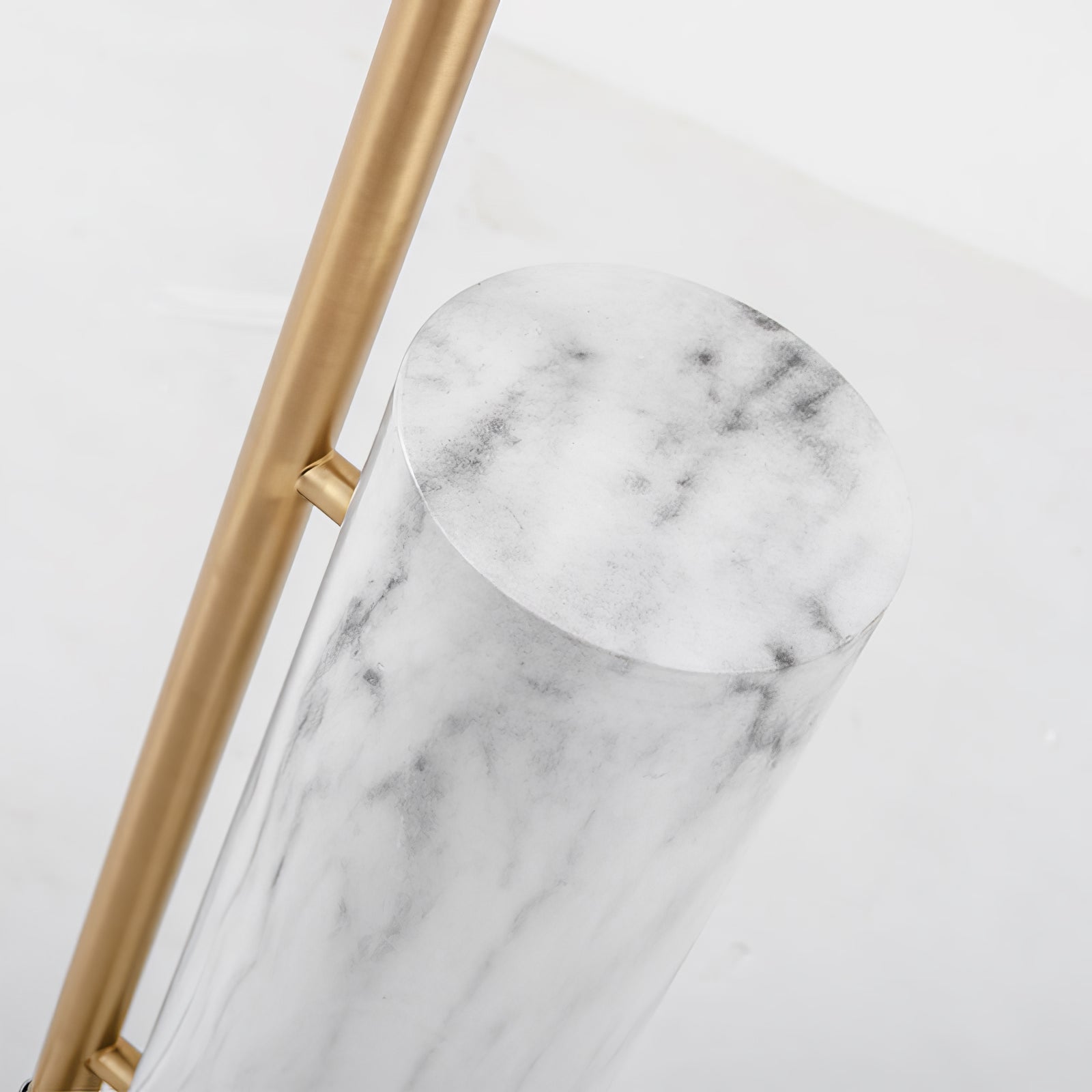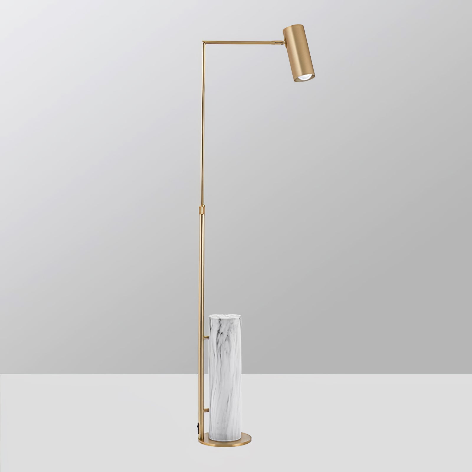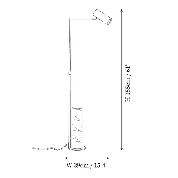 Sleek, Mid-Century modern design inspires the Dien floor lamp. A streamlined metal frame in an iron finish, holds the single bulb outwards on an arm, allowing the function of this piece to take precedence. Featuring a white marble base for stability, the Dien focuses light through a metal, cylindrical shade. This floor lamp brings ambient lighting to corners or convenient reading light to seating areas. The light can be operated with a convenient foot switch.