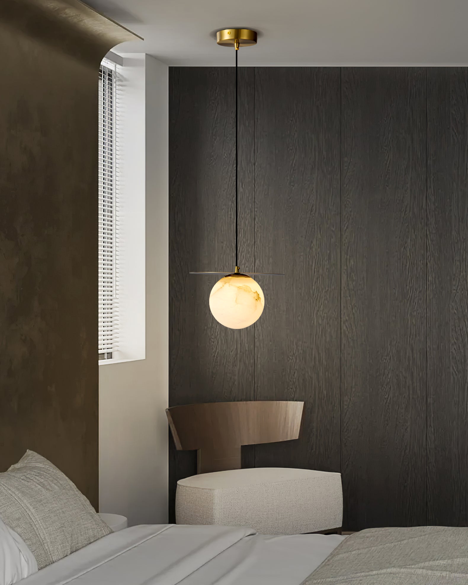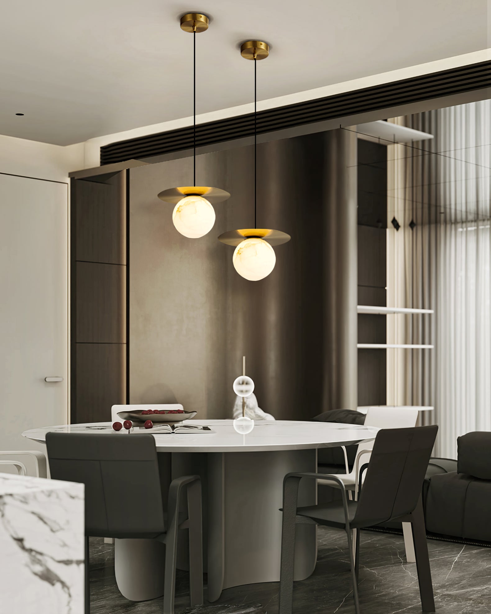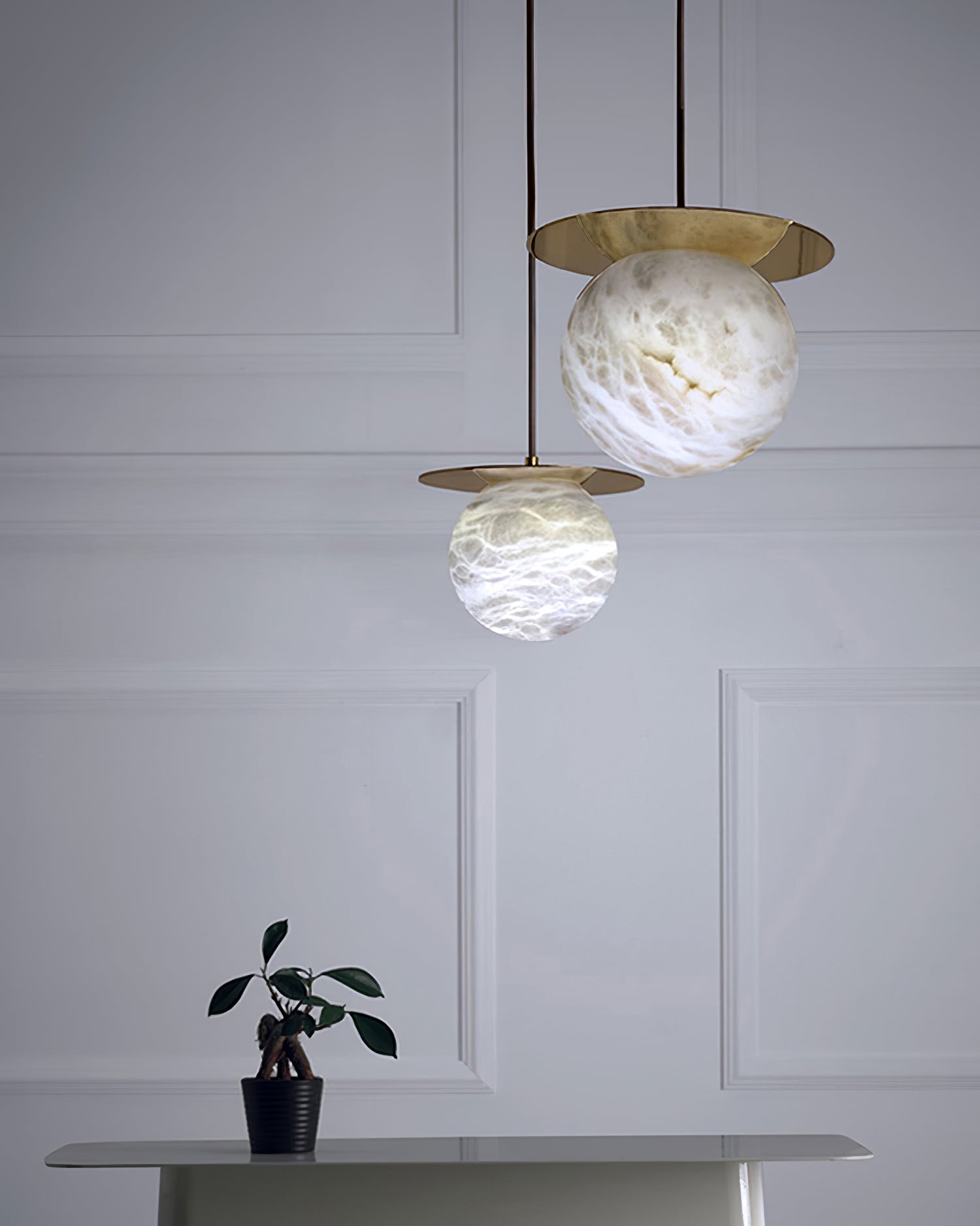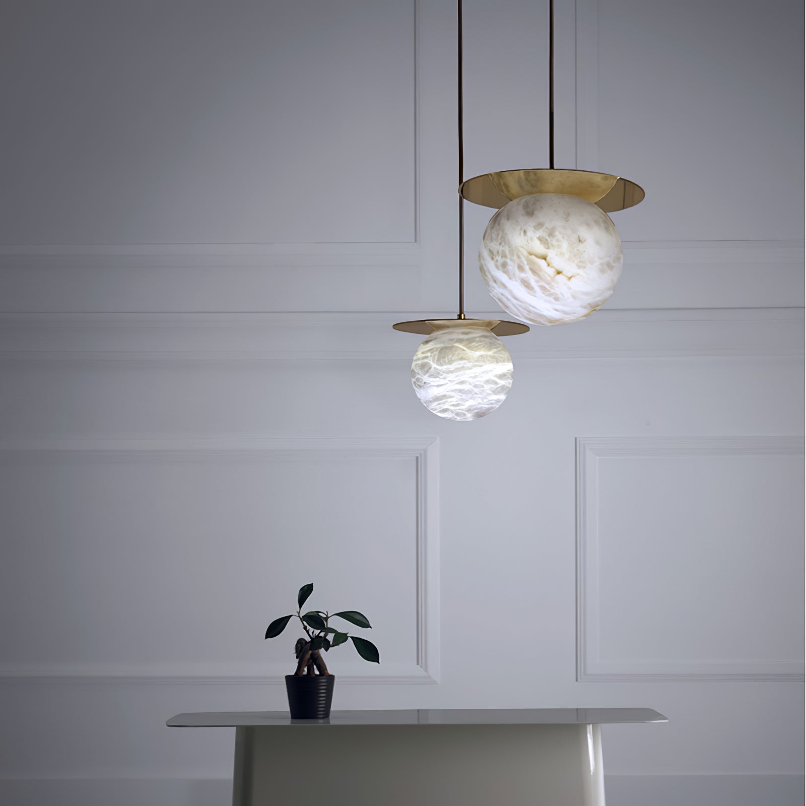 Elevate your decor with the Disc Alabaster Pendant Light from liootrlamp. This contemporary pendant light features a striking alabaster sphere suspended beneath a sleek, golden disc, creating a stunning visual contrast. Perfect for modern interiors, it adds a touch of elegance and sophistication to any room. Ideal for dining areas, kitchens, or living spaces, this pendant light combines artistic design with functional lighting to enhance your home beautifully.
