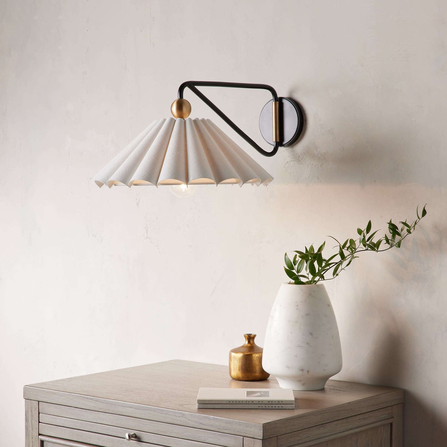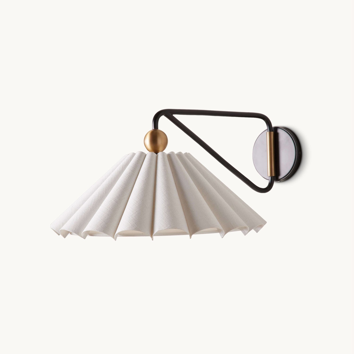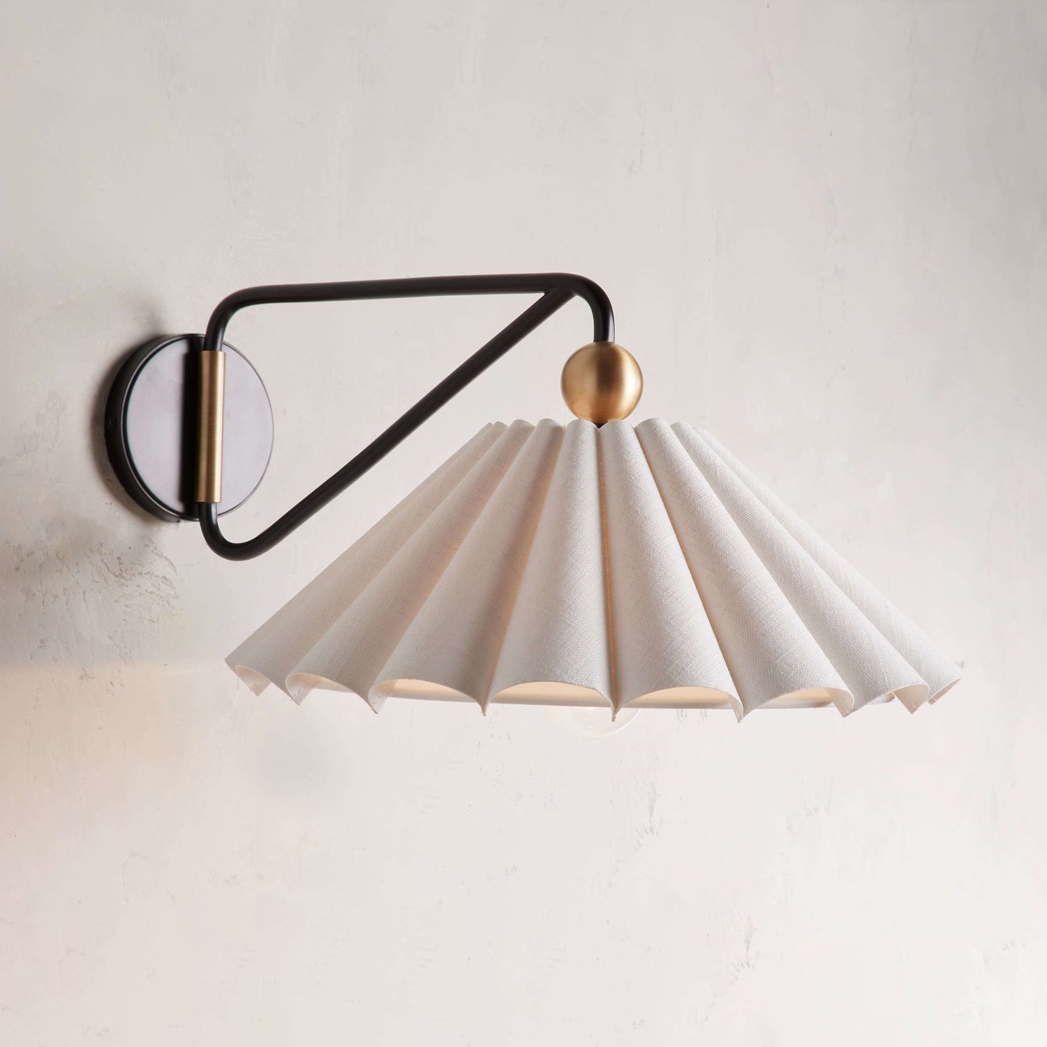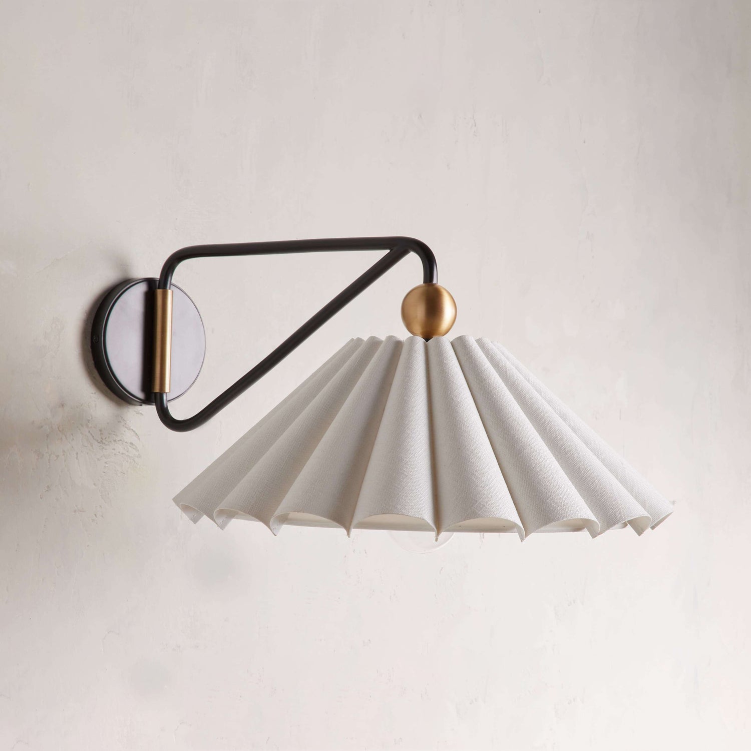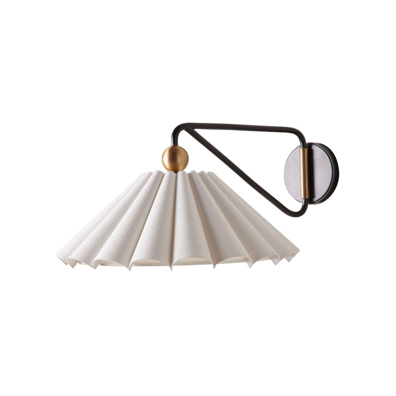 The Dorset Wall Light by Mooijane combines a two-tone brass finish with a natural linen pleated shade for understated elegance. Its swiveling arm allows the light to swing left or right, filling any space with a warm, relaxing glow.