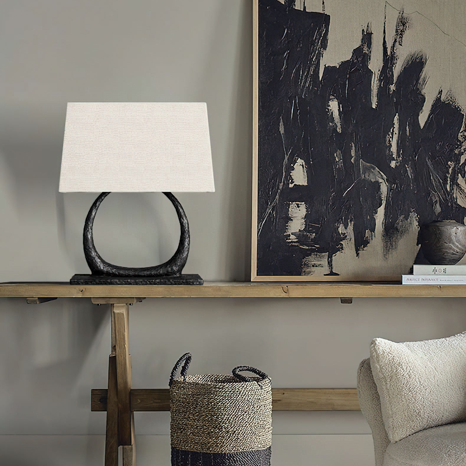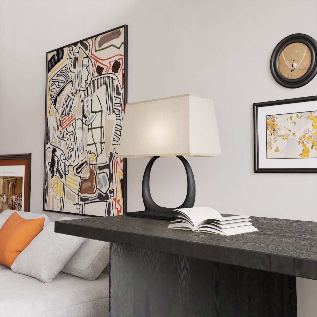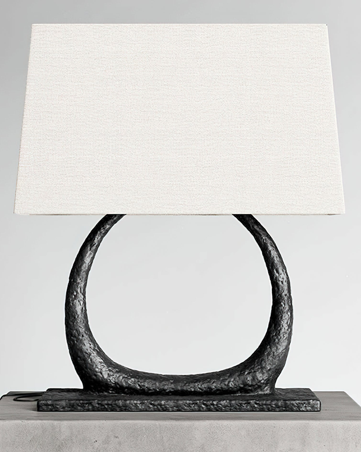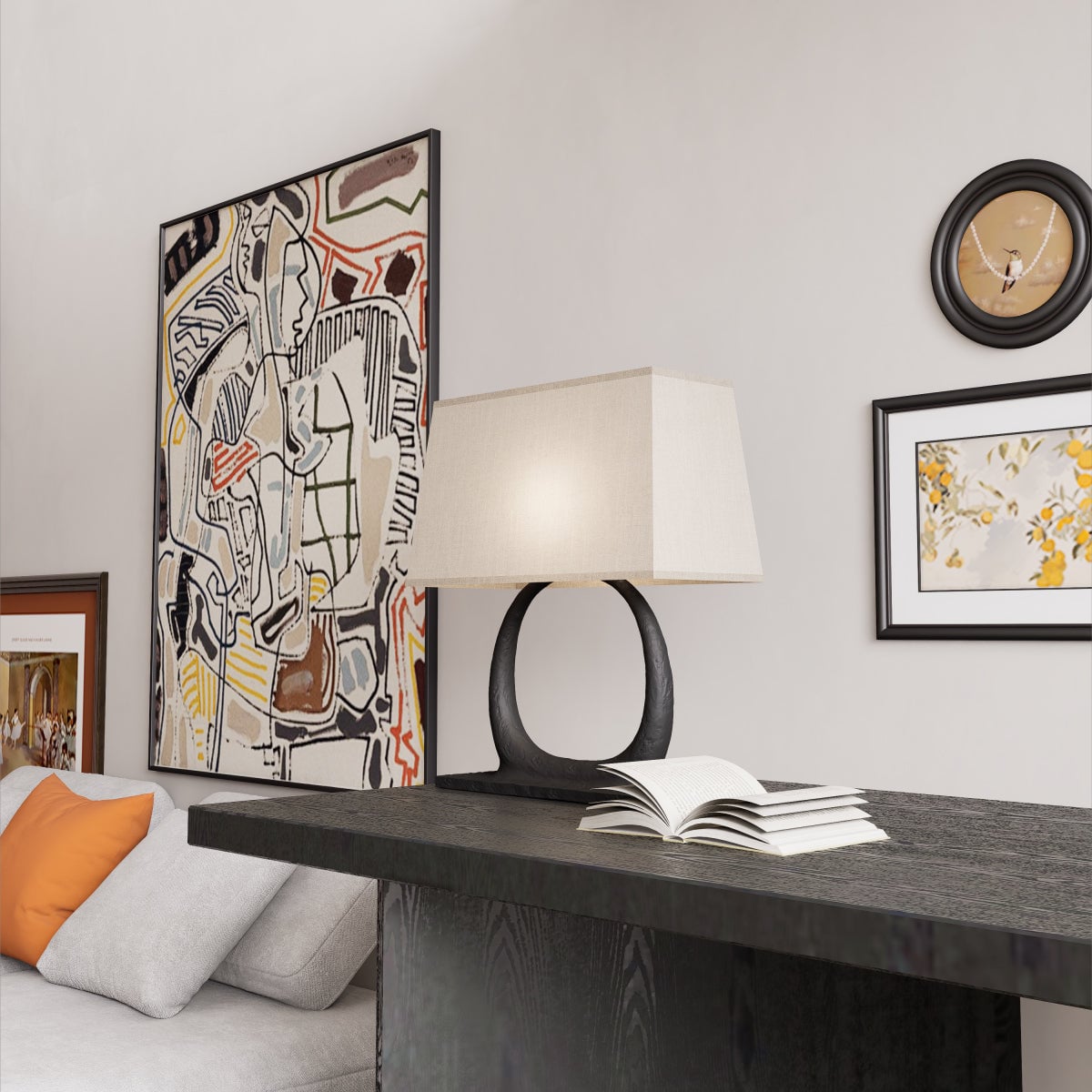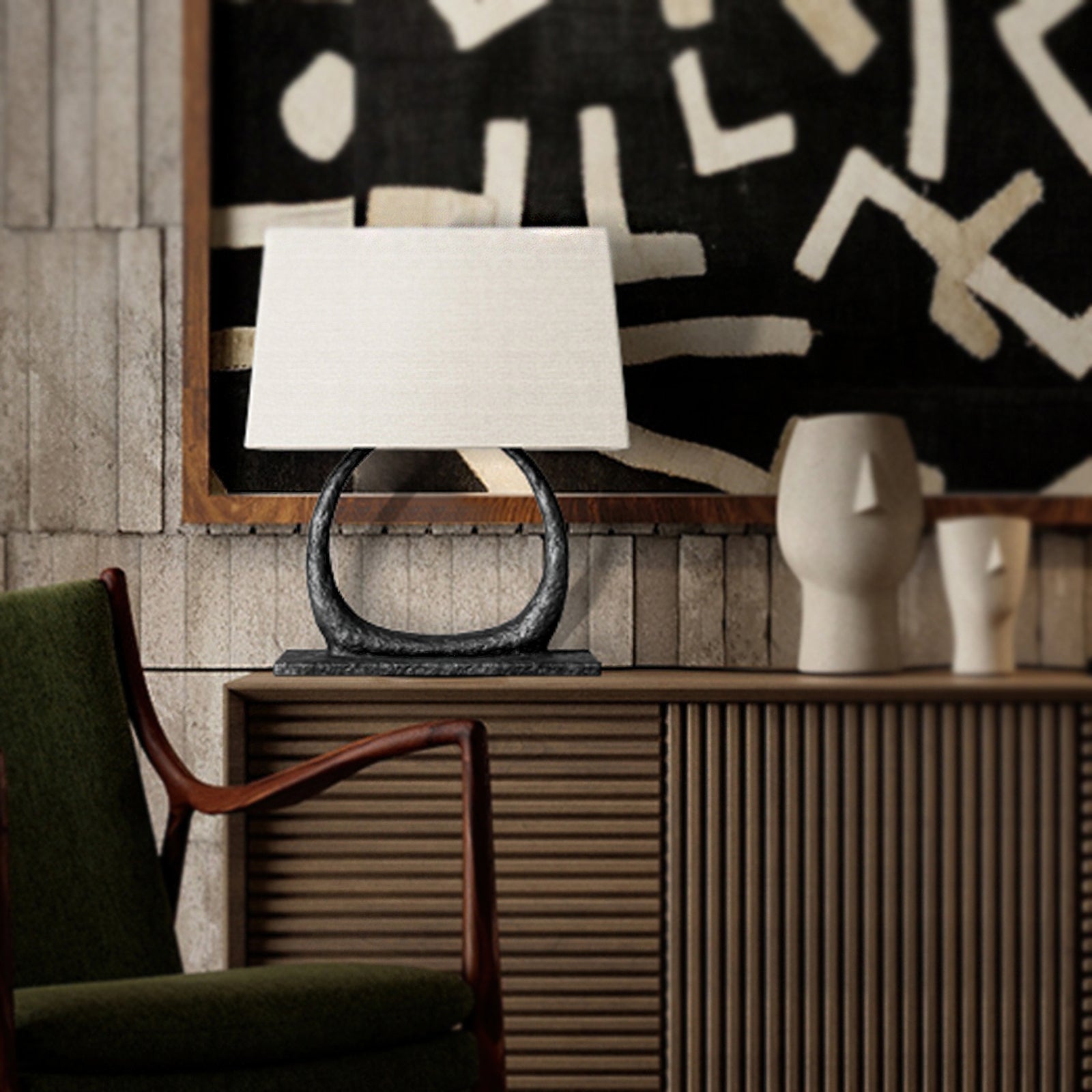 The Easton Table Lamp from Mooijane features a minimalist, sculptural design that blends bold form with refined materials. Its matte black copper body, cast in a striking arc-like ring, offers a sense of strength and artisanal texture. A crisp, square fabric shade contrasts beautifully with the metal base, balancing softness and structure. Ideal for modern, industrial, or minimalist interiors, this lamp serves as both a functional light source and a statement piece.