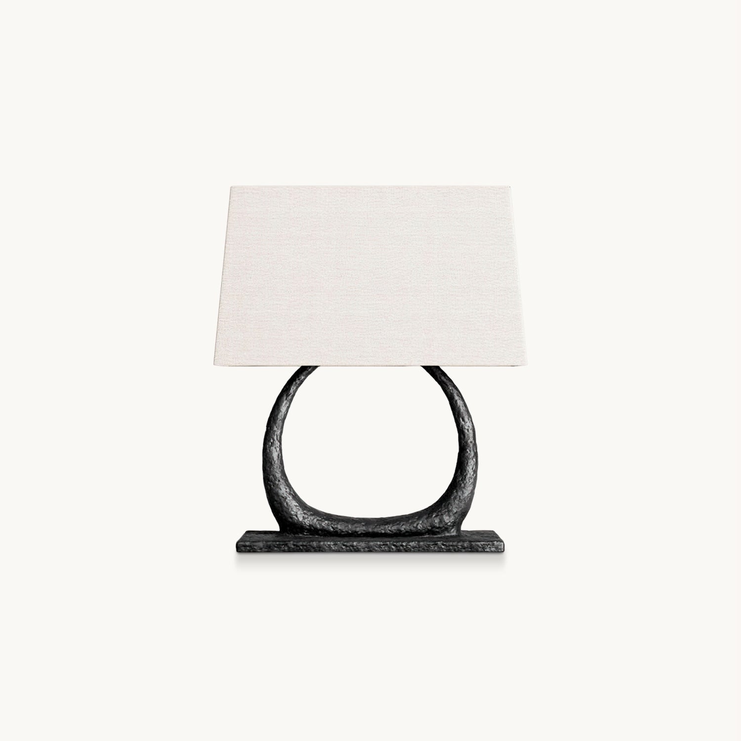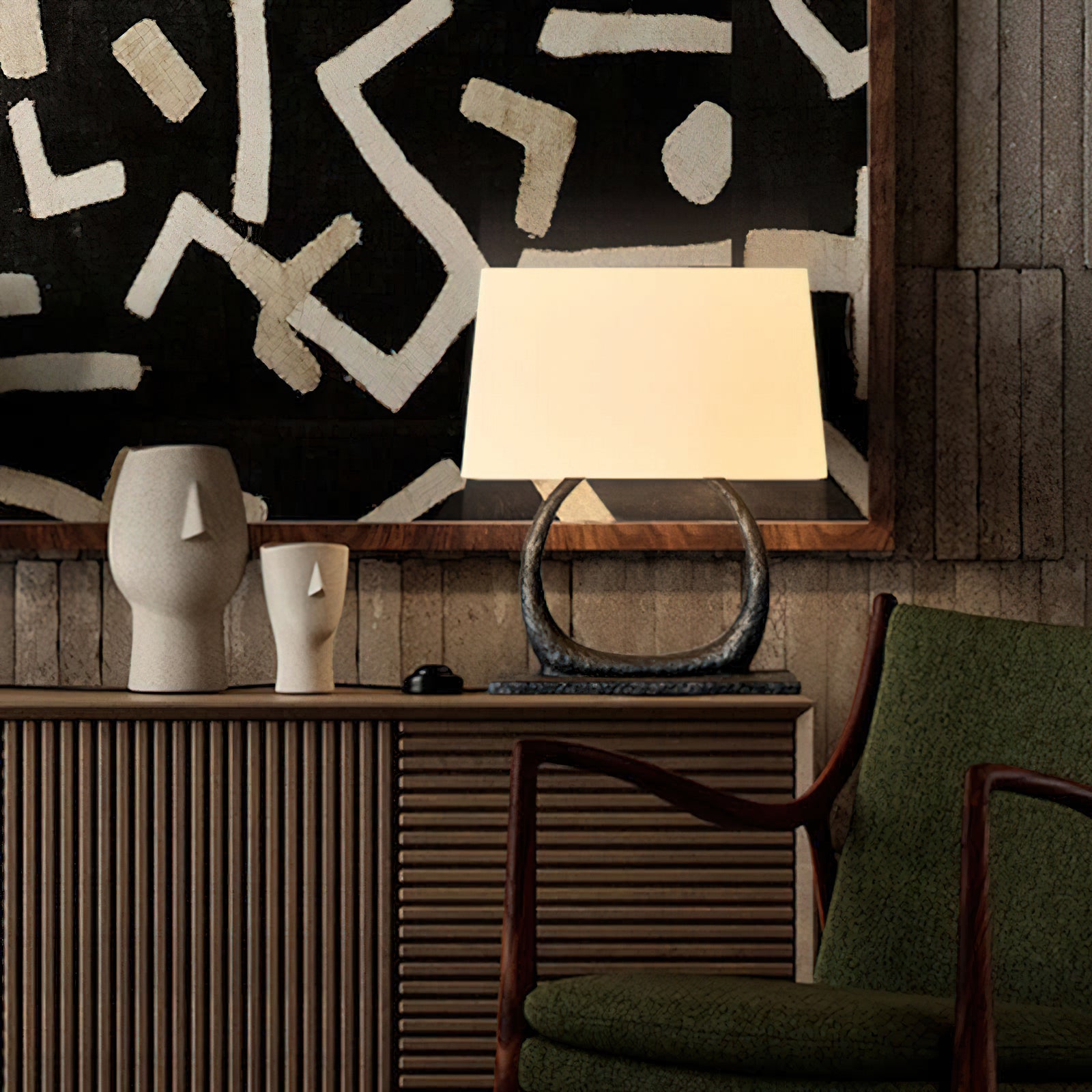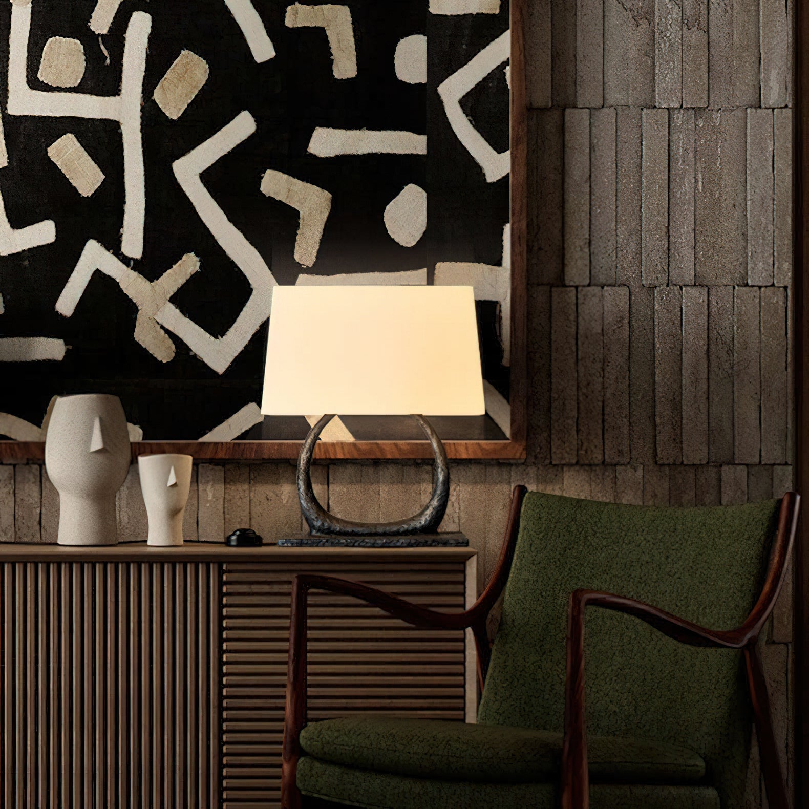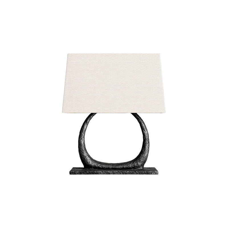 The Easton Table Lamp from Mooijane features a minimalist, sculptural design that blends bold form with refined materials. Its matte black copper body, cast in a striking arc-like ring, offers a sense of strength and artisanal texture. A crisp, square fabric shade contrasts beautifully with the metal base, balancing softness and structure. Ideal for modern, industrial, or minimalist interiors, this lamp serves as both a functional light source and a statement piece.