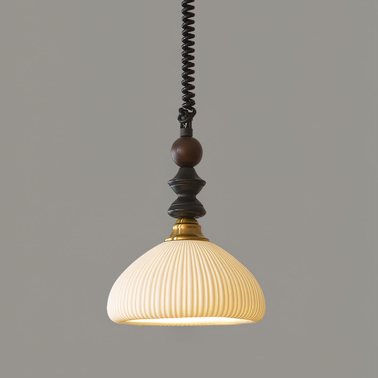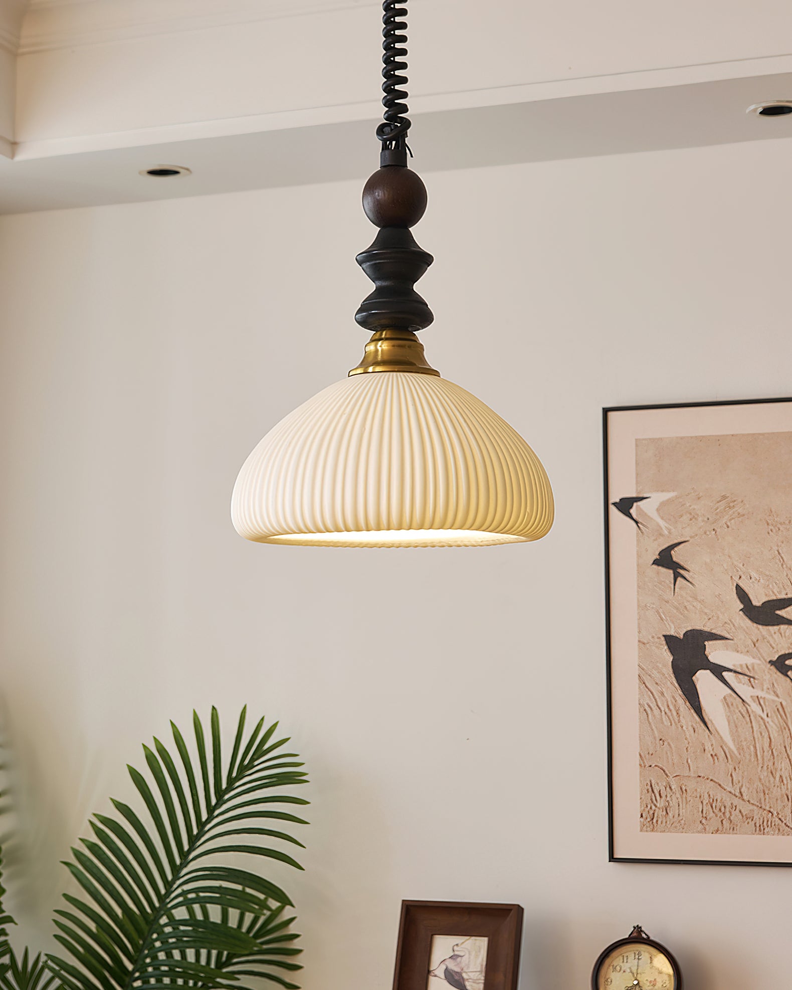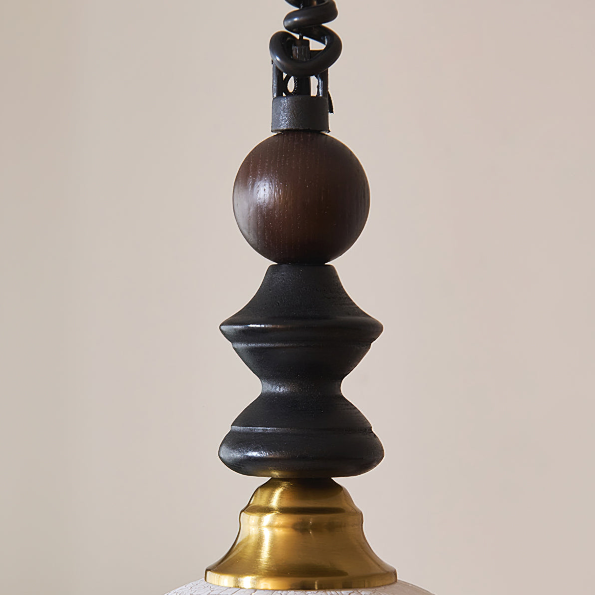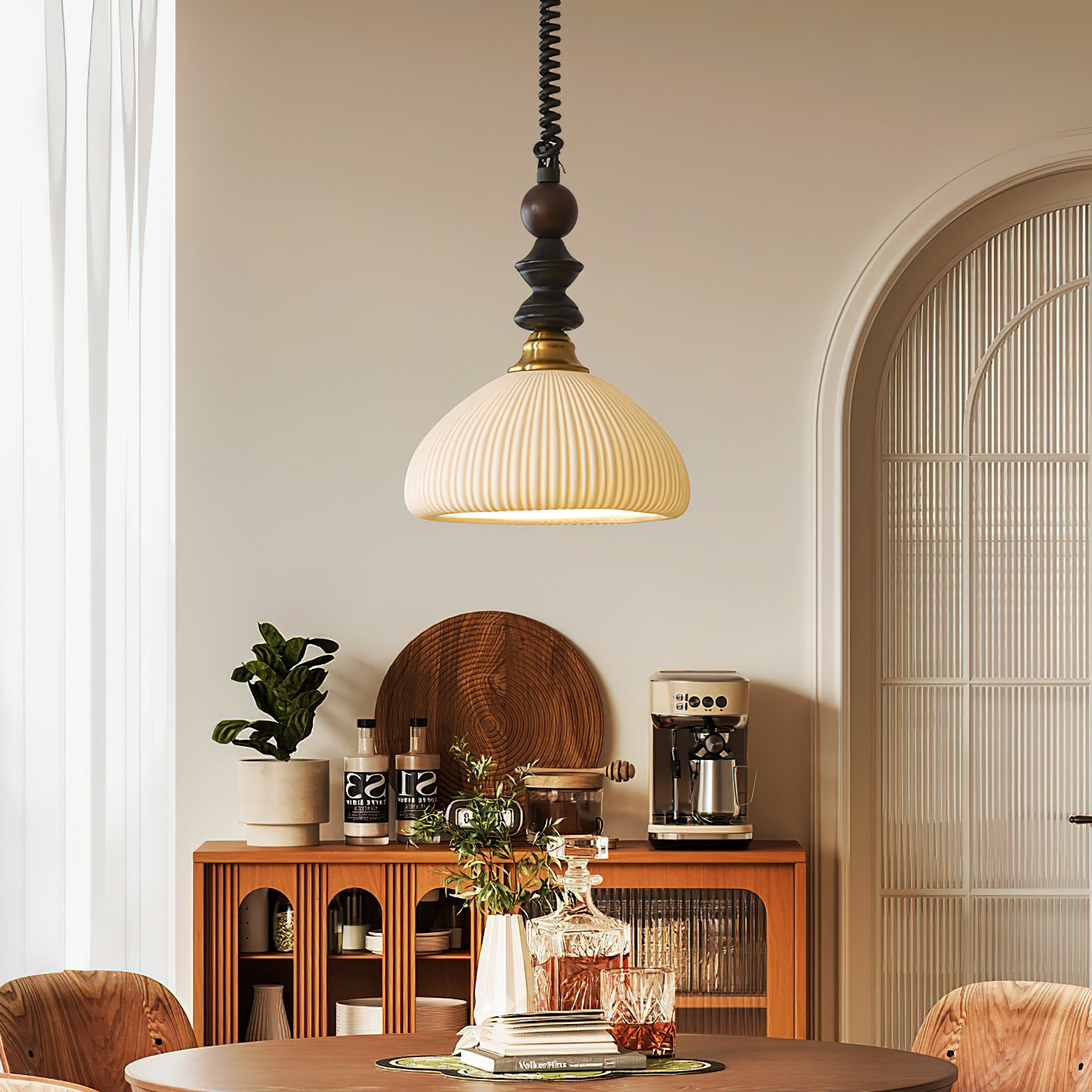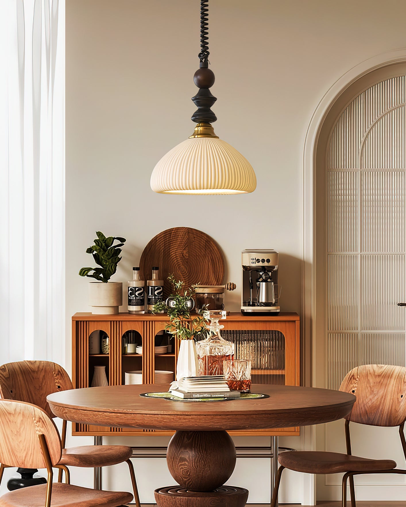 Elevate your space with the Econiko Pendant Lamp from Mooijane. Featuring a soft white finish for a warm and gentle glow, this elegant chandelier adds rustic charm with a carved wood beaded stem and metal accent fixture. The soft ridges on the shade create a touch of sophistication to any room.