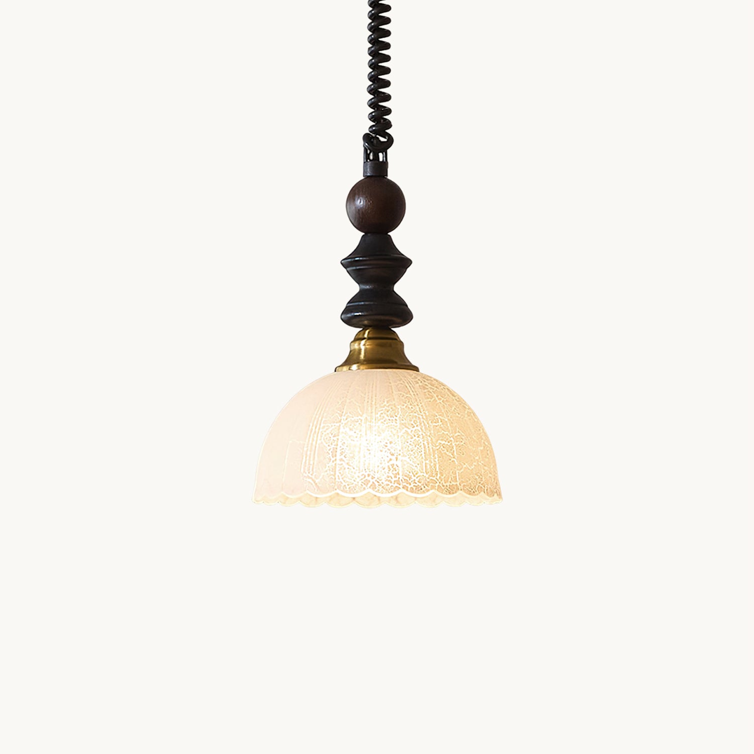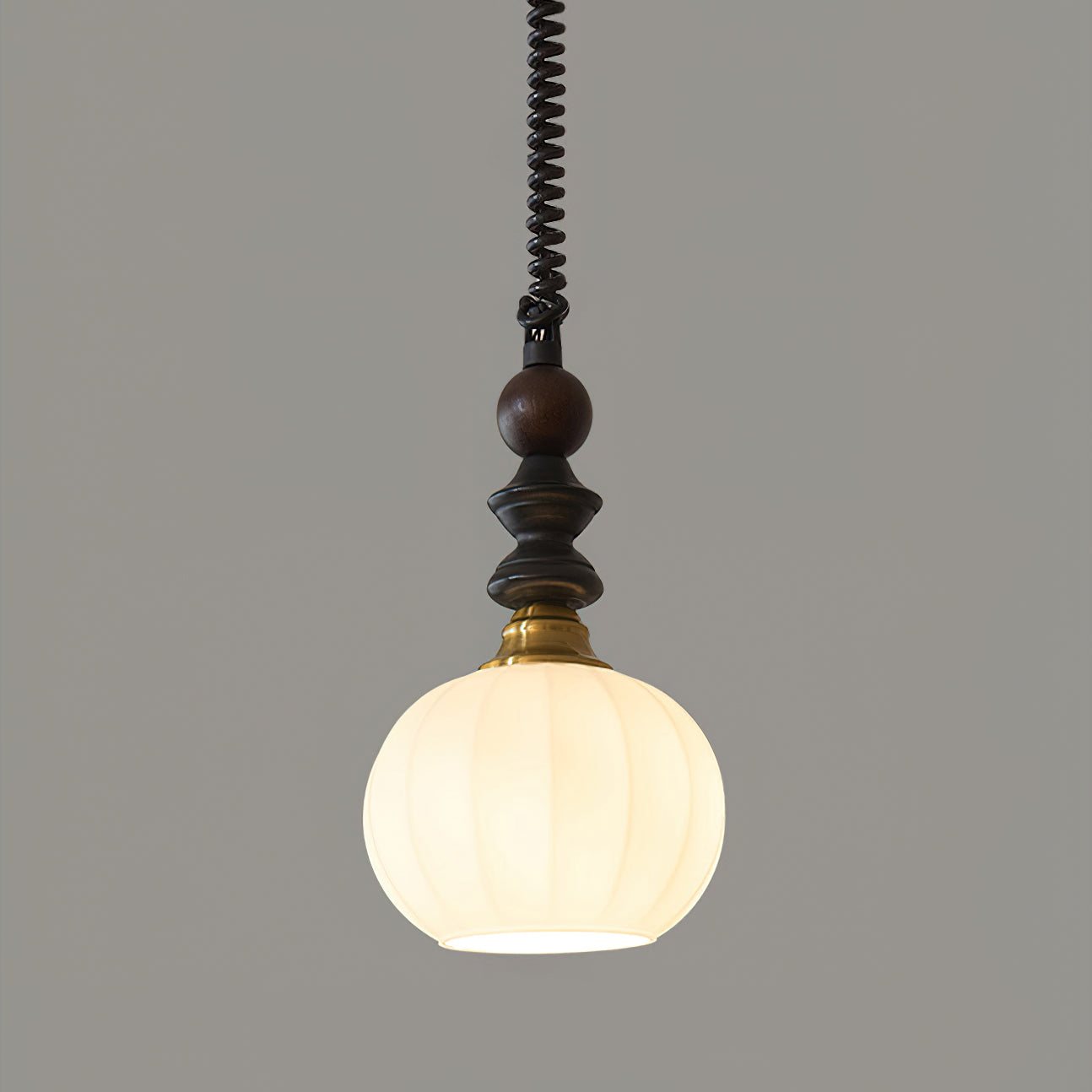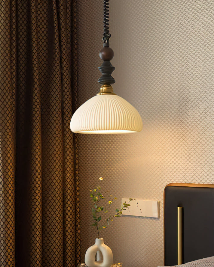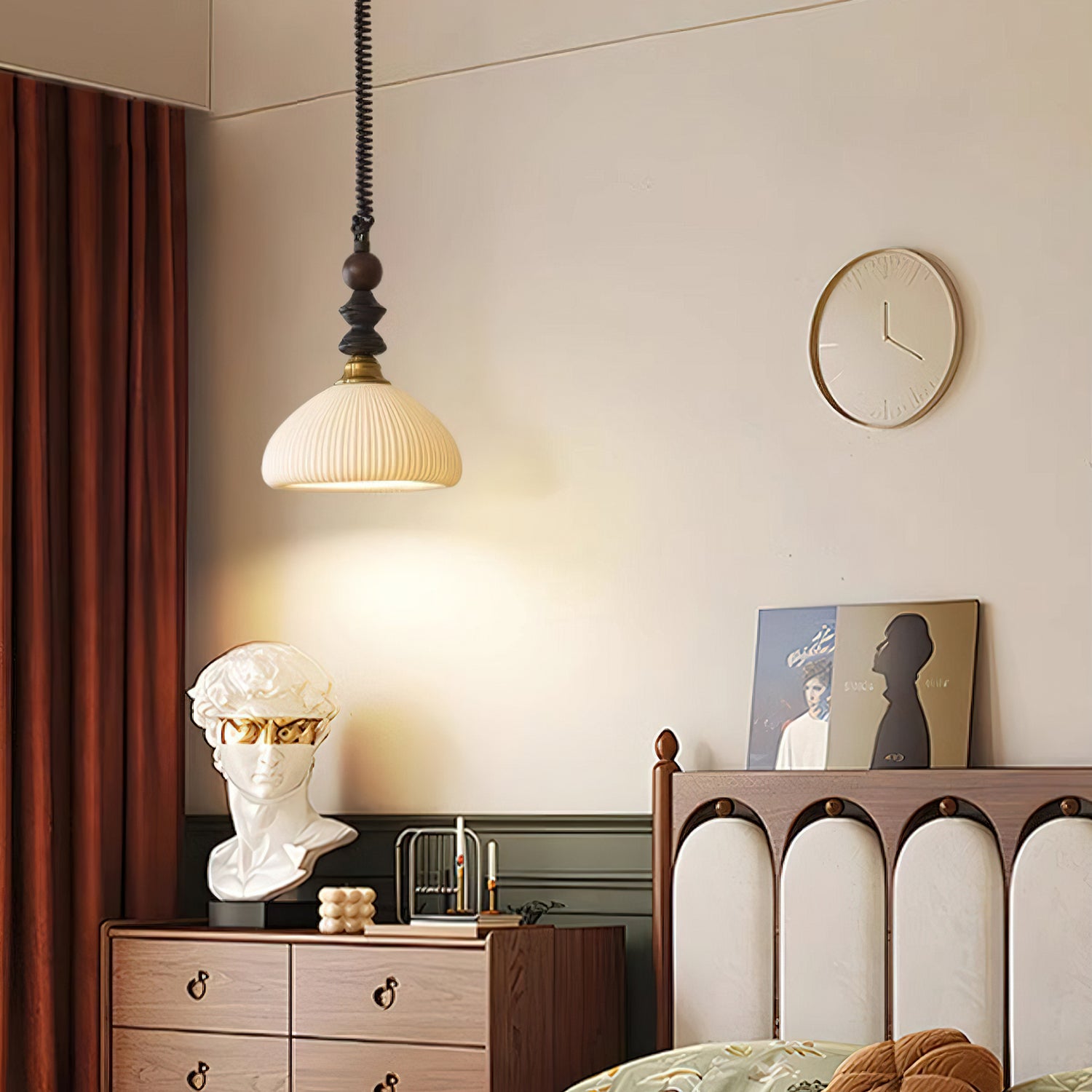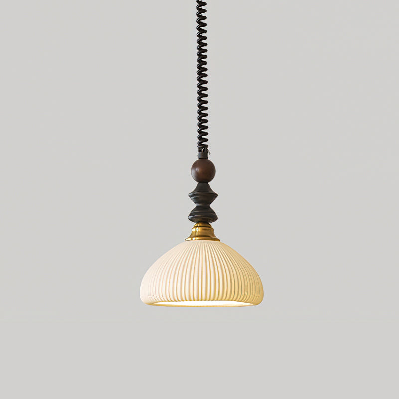 Elevate your space with the Econiko Pendant Lamp from Mooijane. Featuring a soft white finish for a warm and gentle glow, this elegant chandelier adds rustic charm with a carved wood beaded stem and metal accent fixture. The soft ridges on the shade create a touch of sophistication to any room.