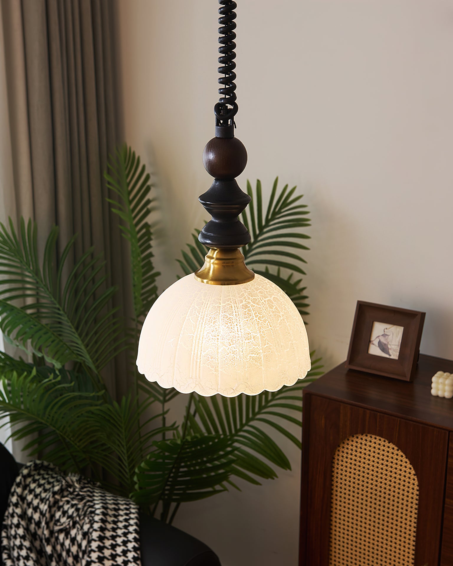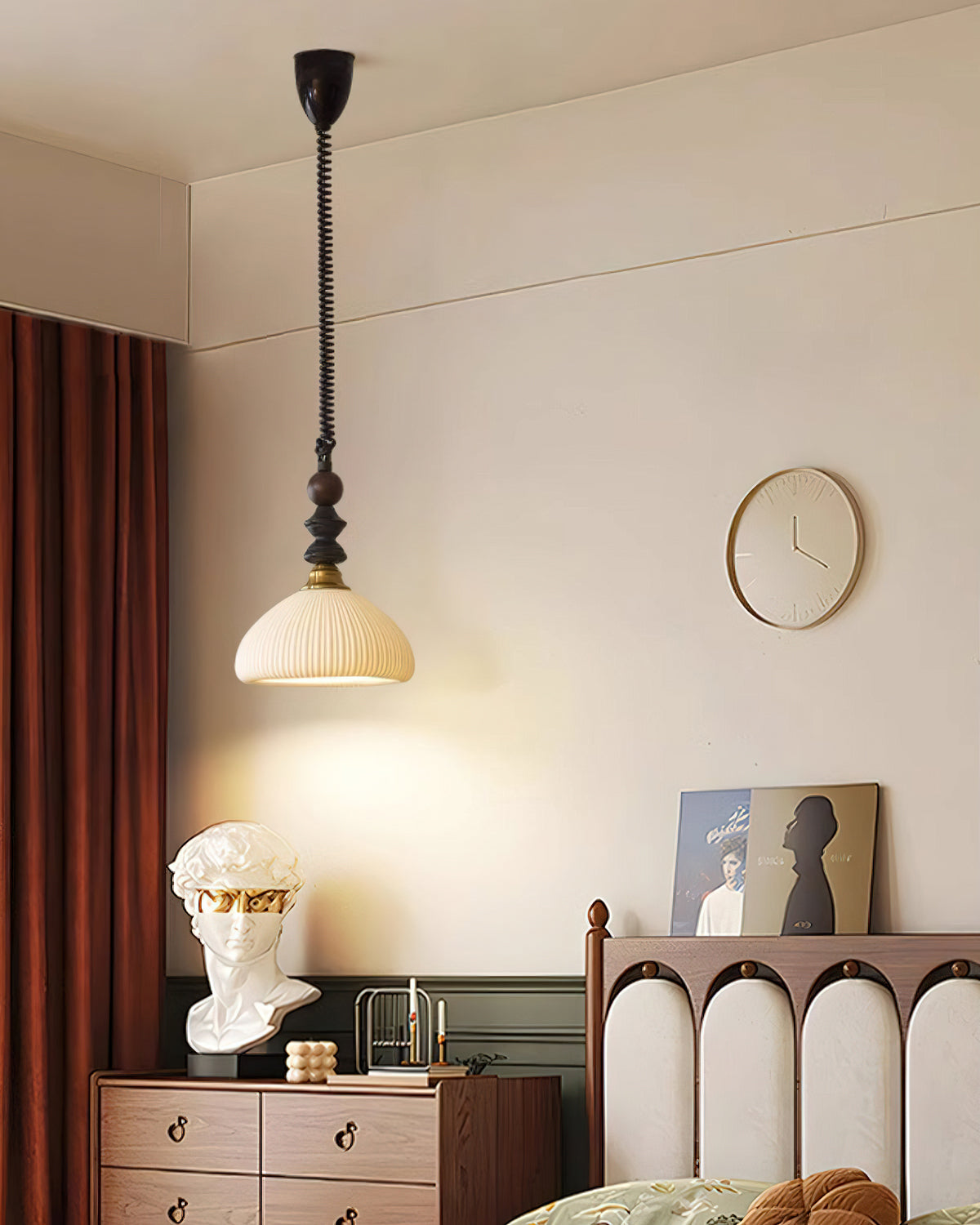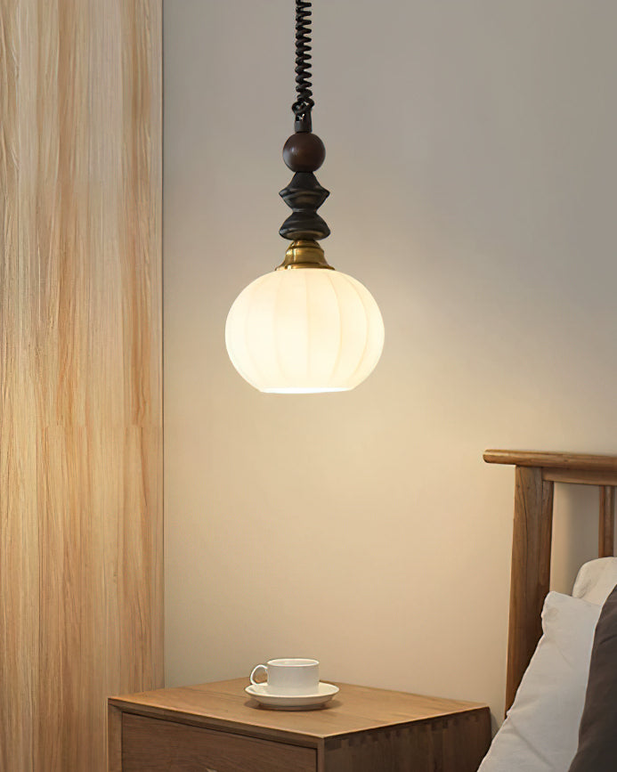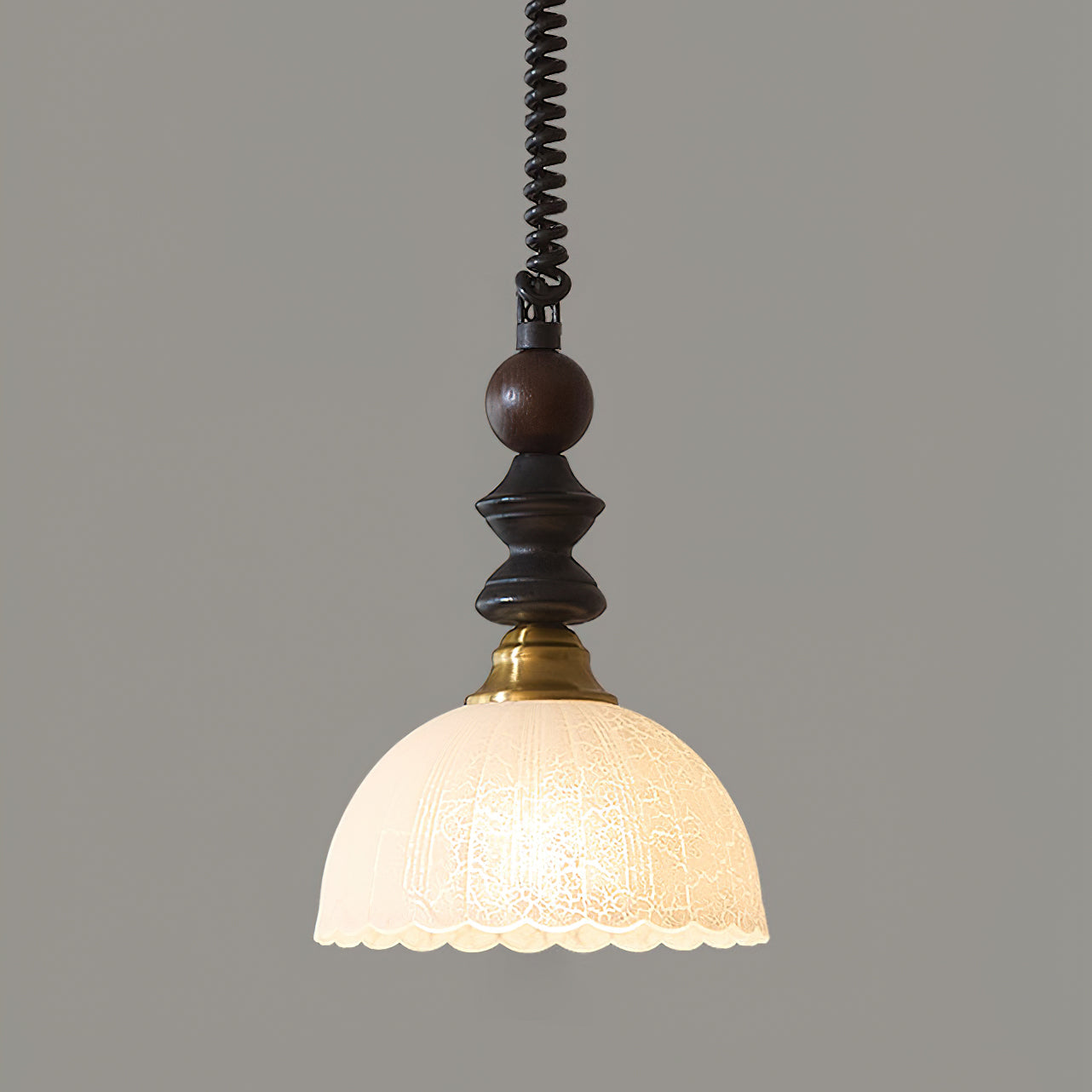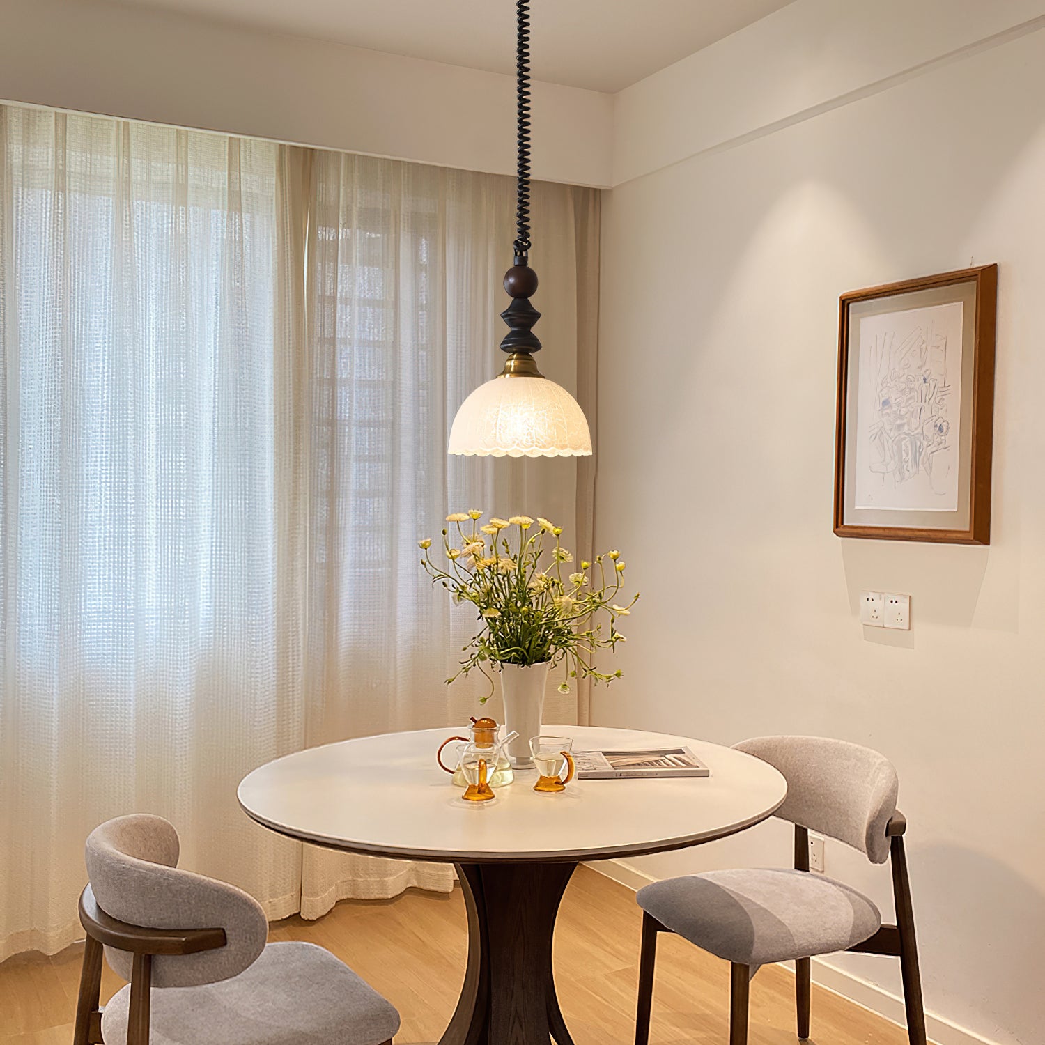 Elevate your space with the Econiko Pendant Lamp from Mooijane. Featuring a soft white finish for a warm and gentle glow, this elegant chandelier adds rustic charm with a carved wood beaded stem and metal accent fixture. The soft ridges on the shade create a touch of sophistication to any room.