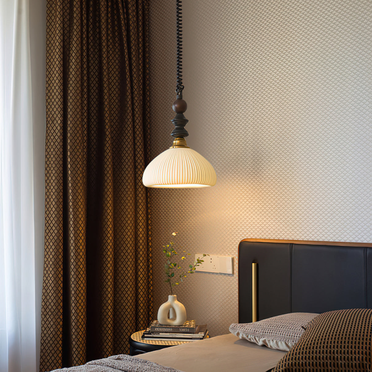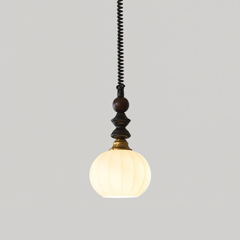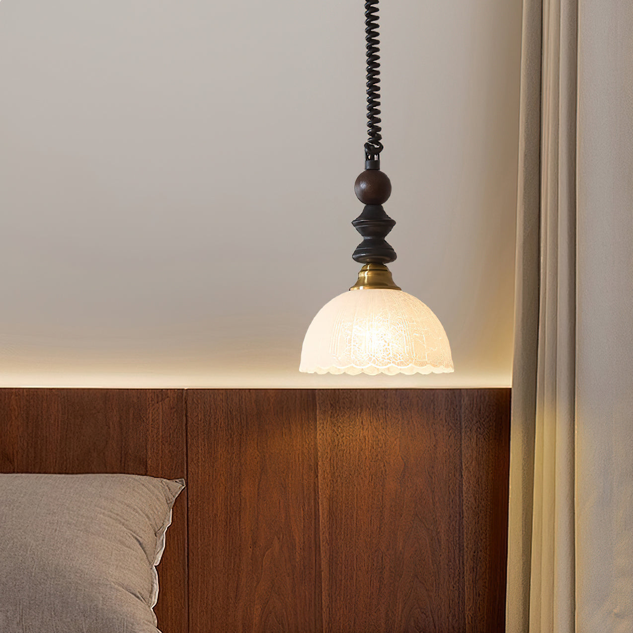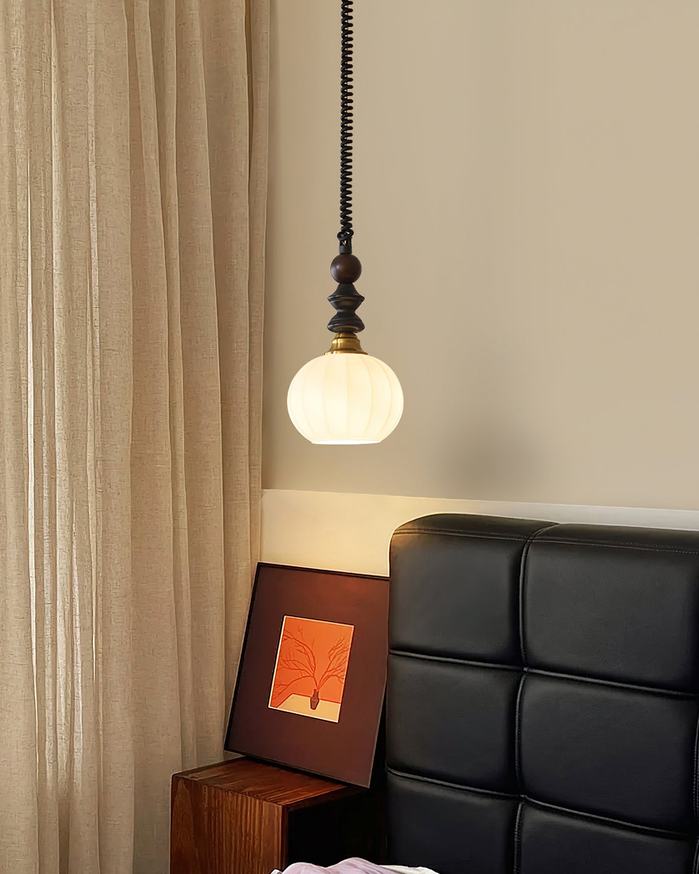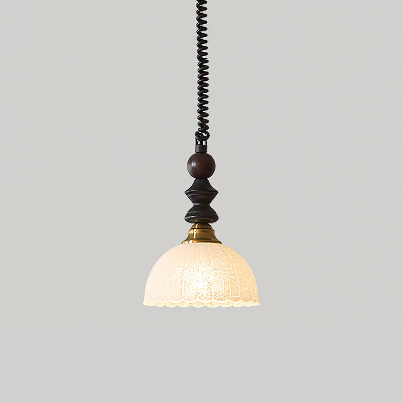 Elevate your space with the Econiko Pendant Lamp from Mooijane. Featuring a soft white finish for a warm and gentle glow, this elegant chandelier adds rustic charm with a carved wood beaded stem and metal accent fixture. The soft ridges on the shade create a touch of sophistication to any room.