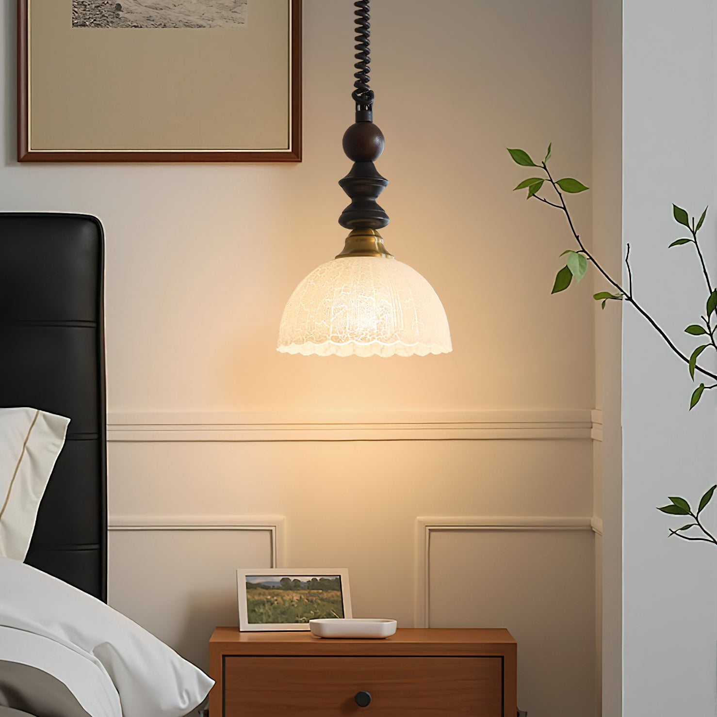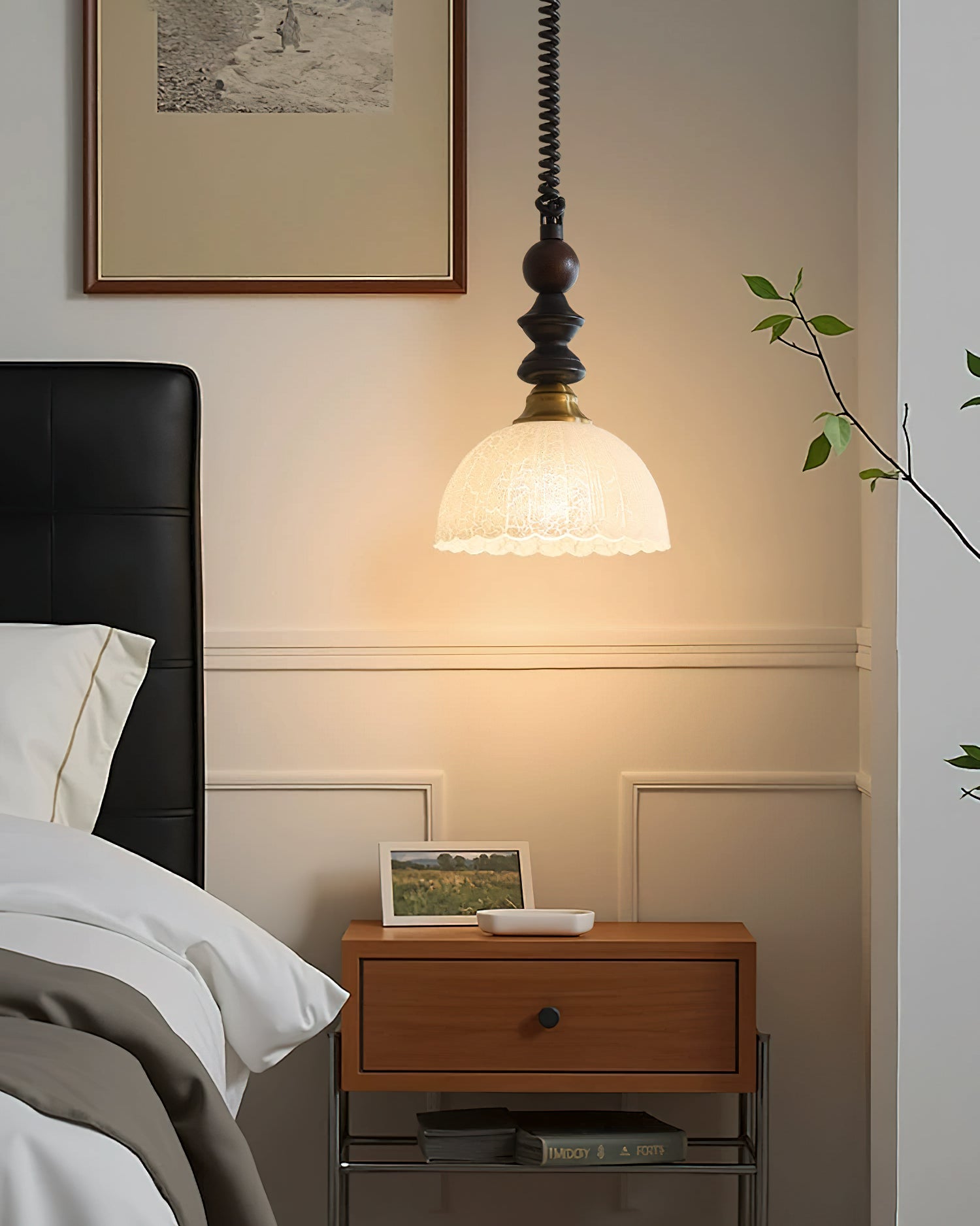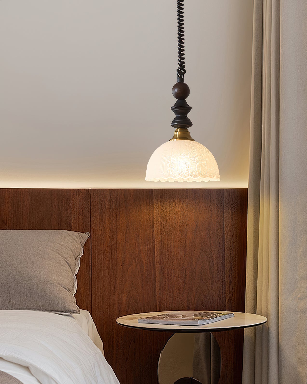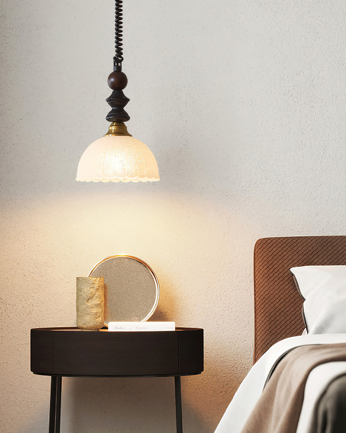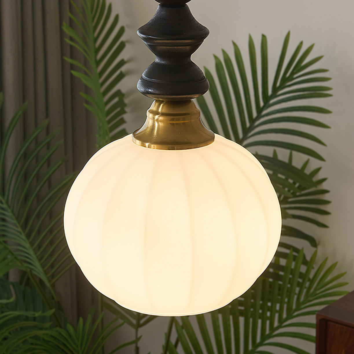 Elevate your space with the Econiko Pendant Lamp from Mooijane. Featuring a soft white finish for a warm and gentle glow, this elegant chandelier adds rustic charm with a carved wood beaded stem and metal accent fixture. The soft ridges on the shade create a touch of sophistication to any room.