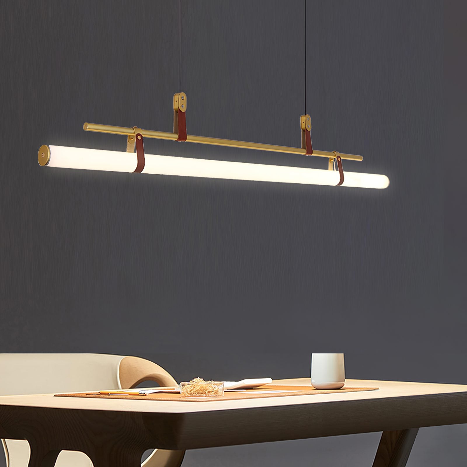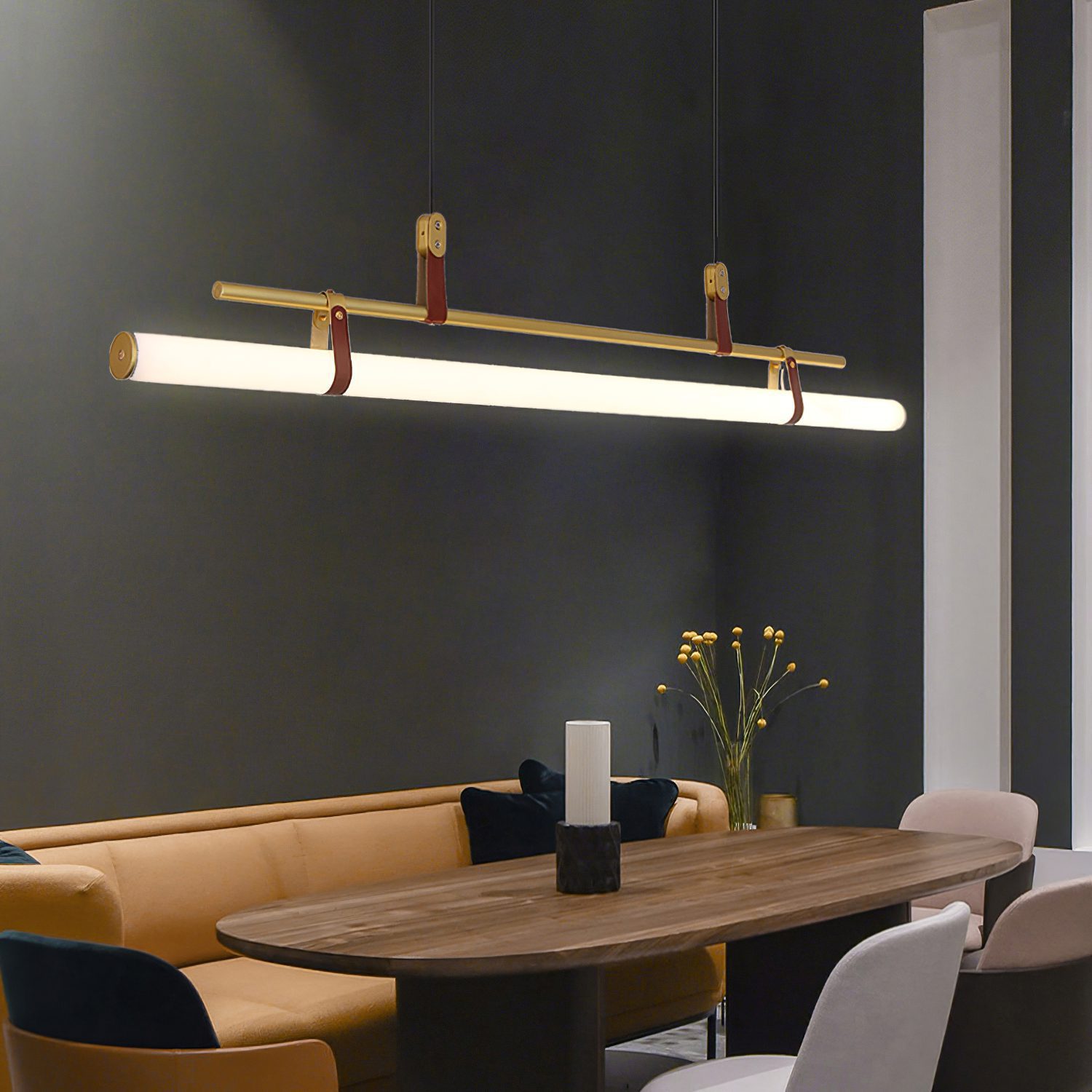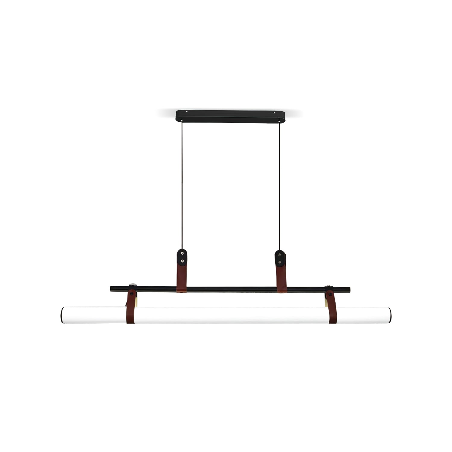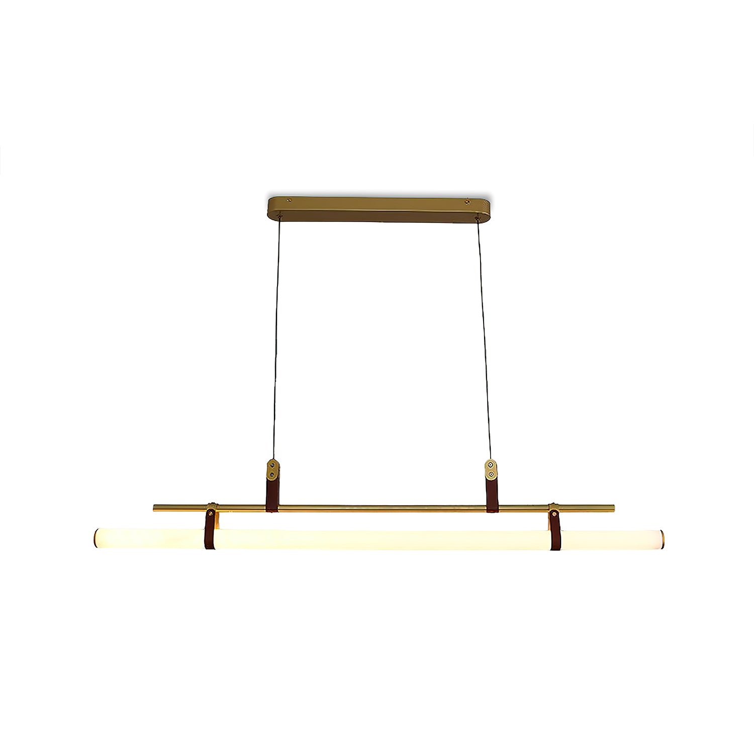 Enhance your space with the Eden Linear Pendant Light. This modern lamp features a sleek design and luxurious materials such as leather and metal to add a touch of elegance. Integrated LEDs provide energy-efficient lighting and generate almost no heat, showing a better quality of life. Elevate your style with this modern pendant light.