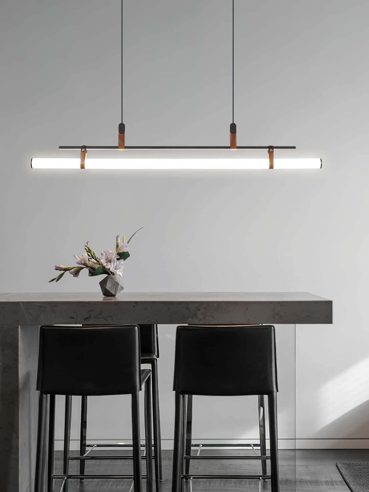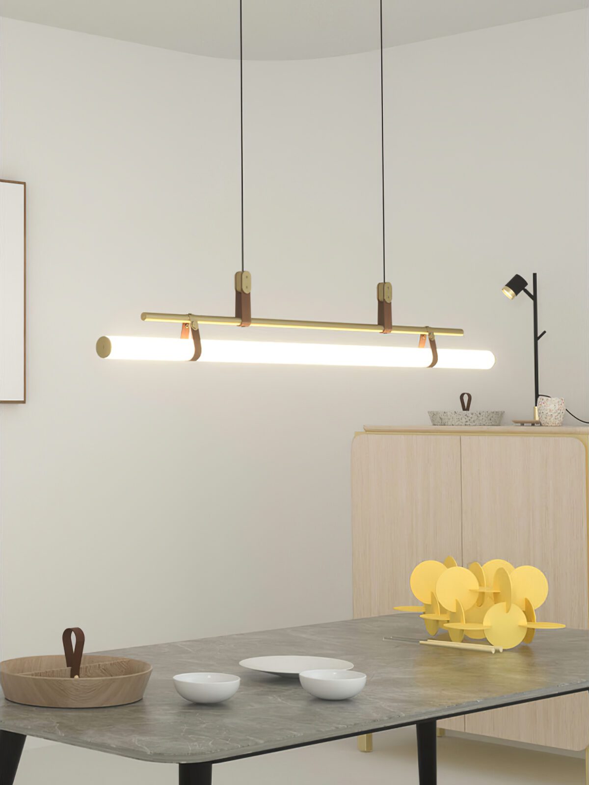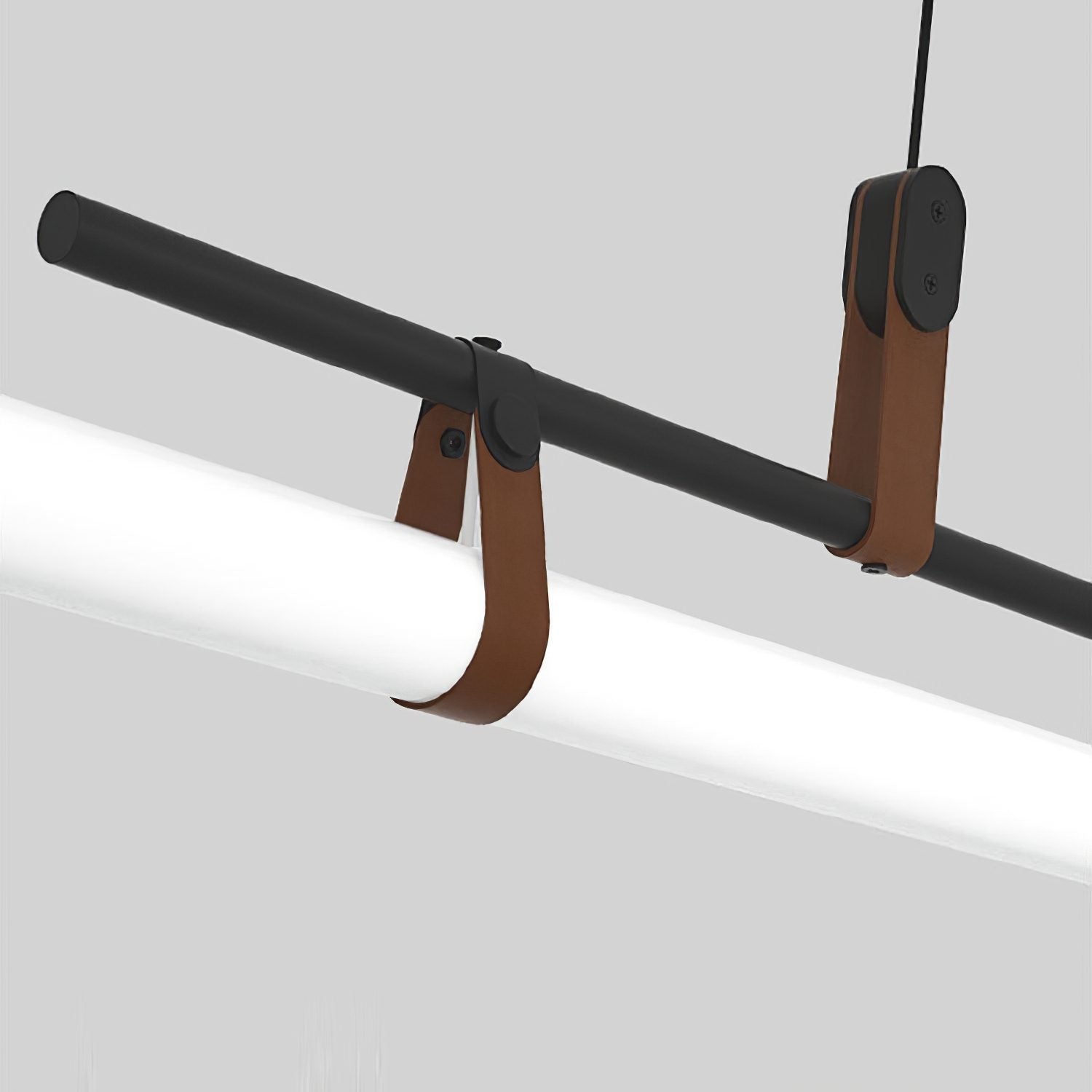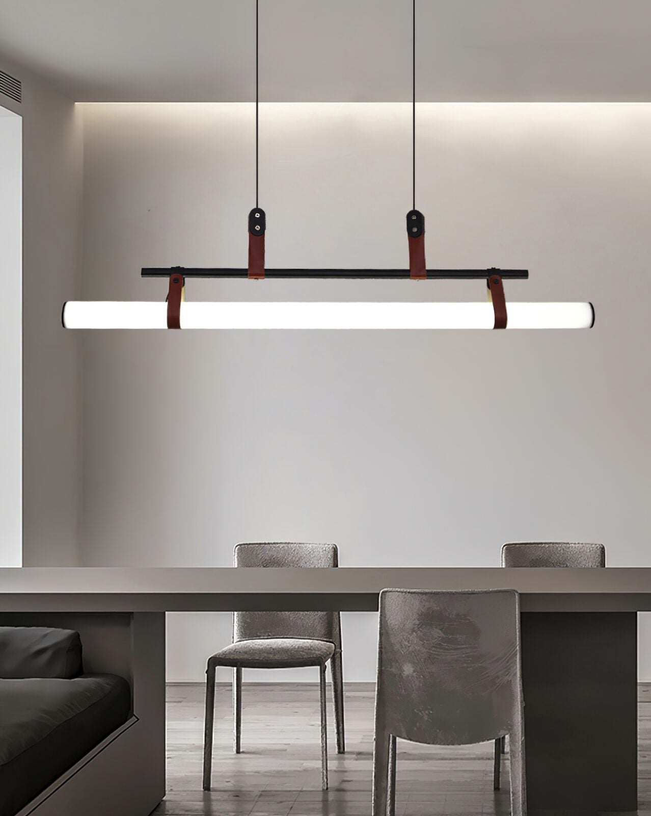 Enhance your space with the Eden Linear Pendant Light. This modern lamp features a sleek design and luxurious materials such as leather and metal to add a touch of elegance. Integrated LEDs provide energy-efficient lighting and generate almost no heat, showing a better quality of life. Elevate your style with this modern pendant light.