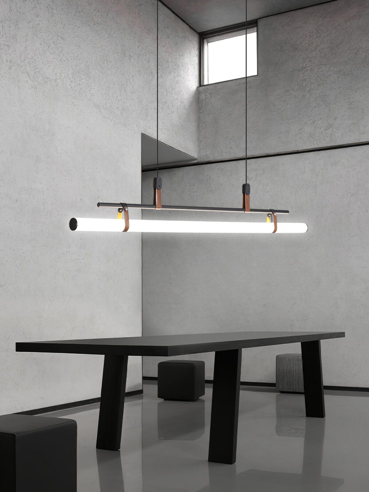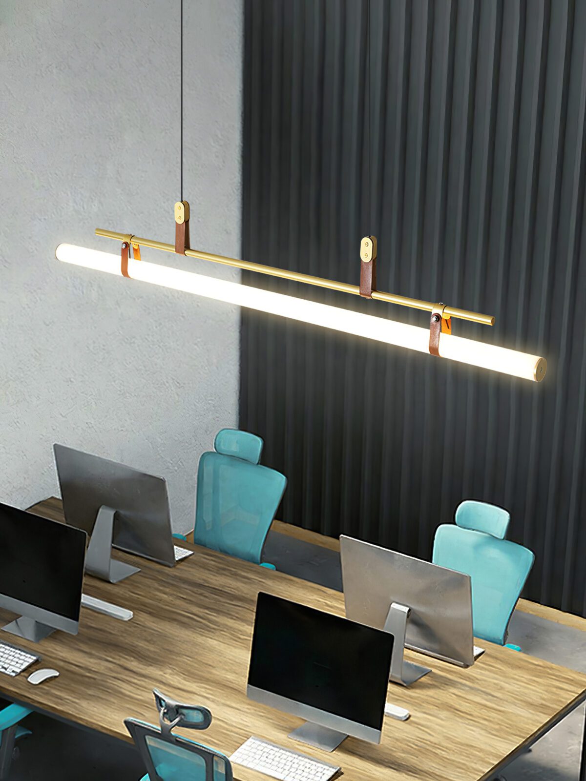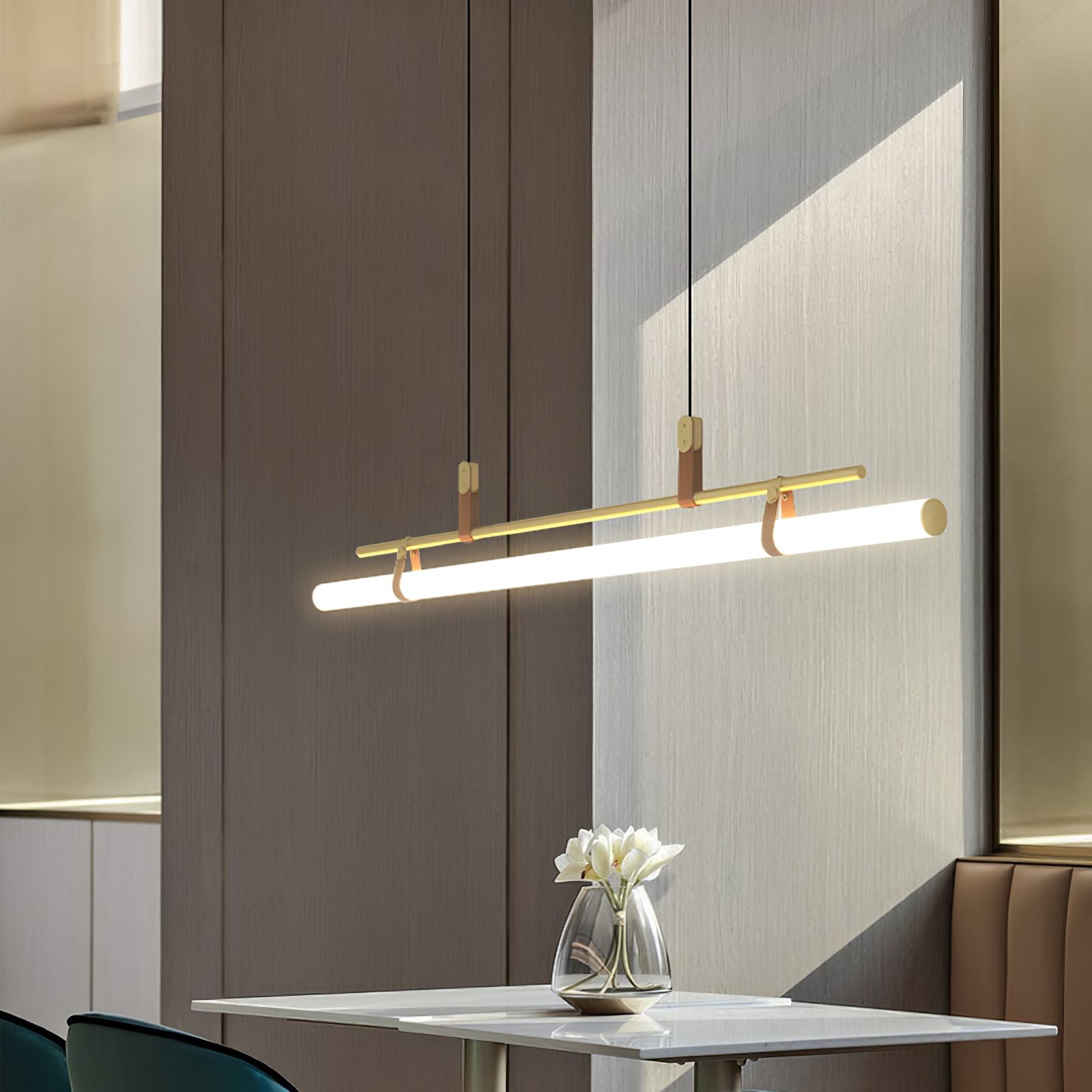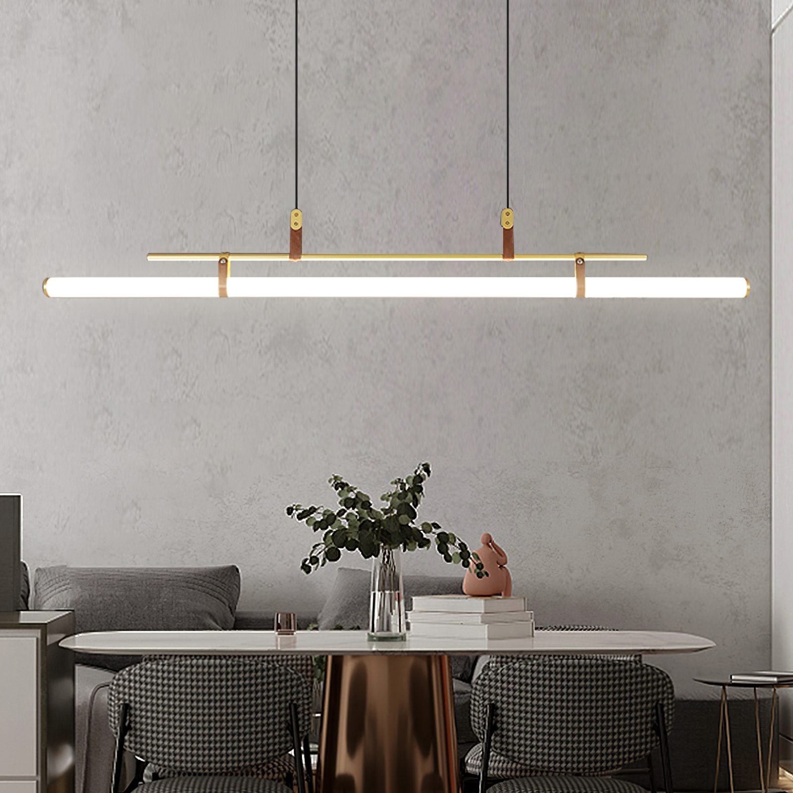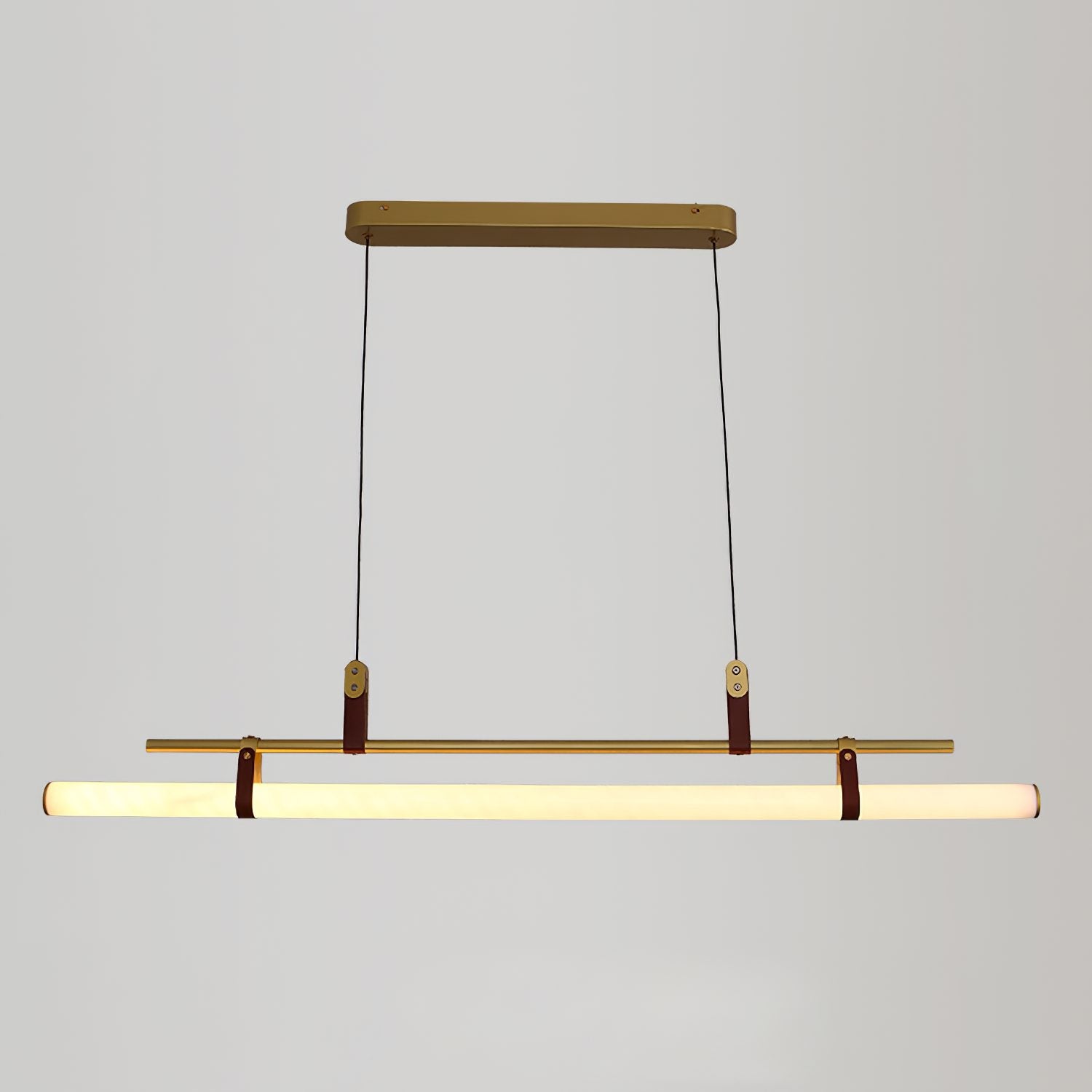 Enhance your space with the Eden Linear Pendant Light. This modern lamp features a sleek design and luxurious materials such as leather and metal to add a touch of elegance. Integrated LEDs provide energy-efficient lighting and generate almost no heat, showing a better quality of life. Elevate your style with this modern pendant light.