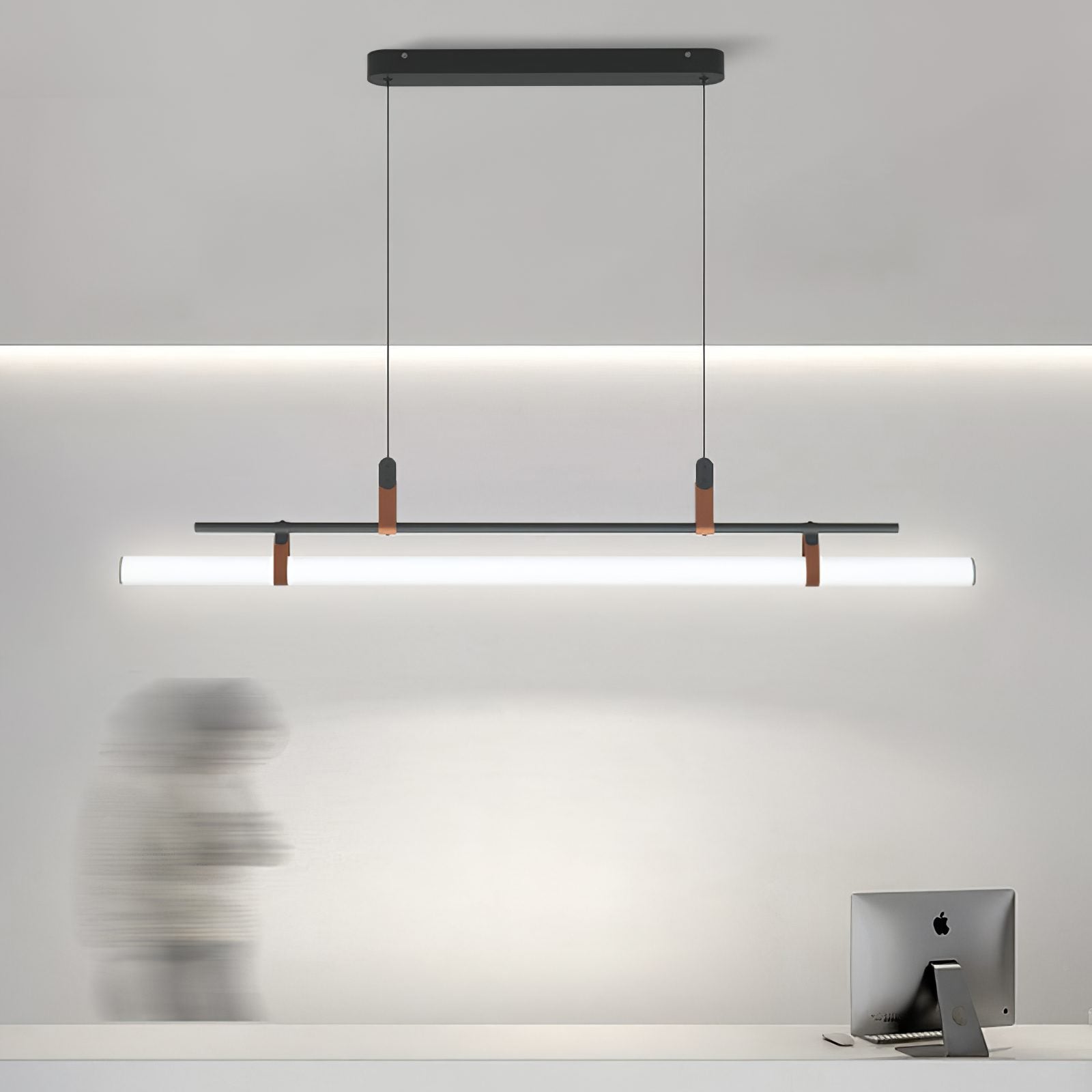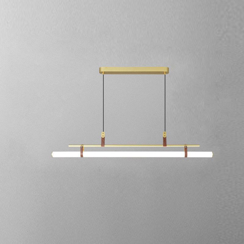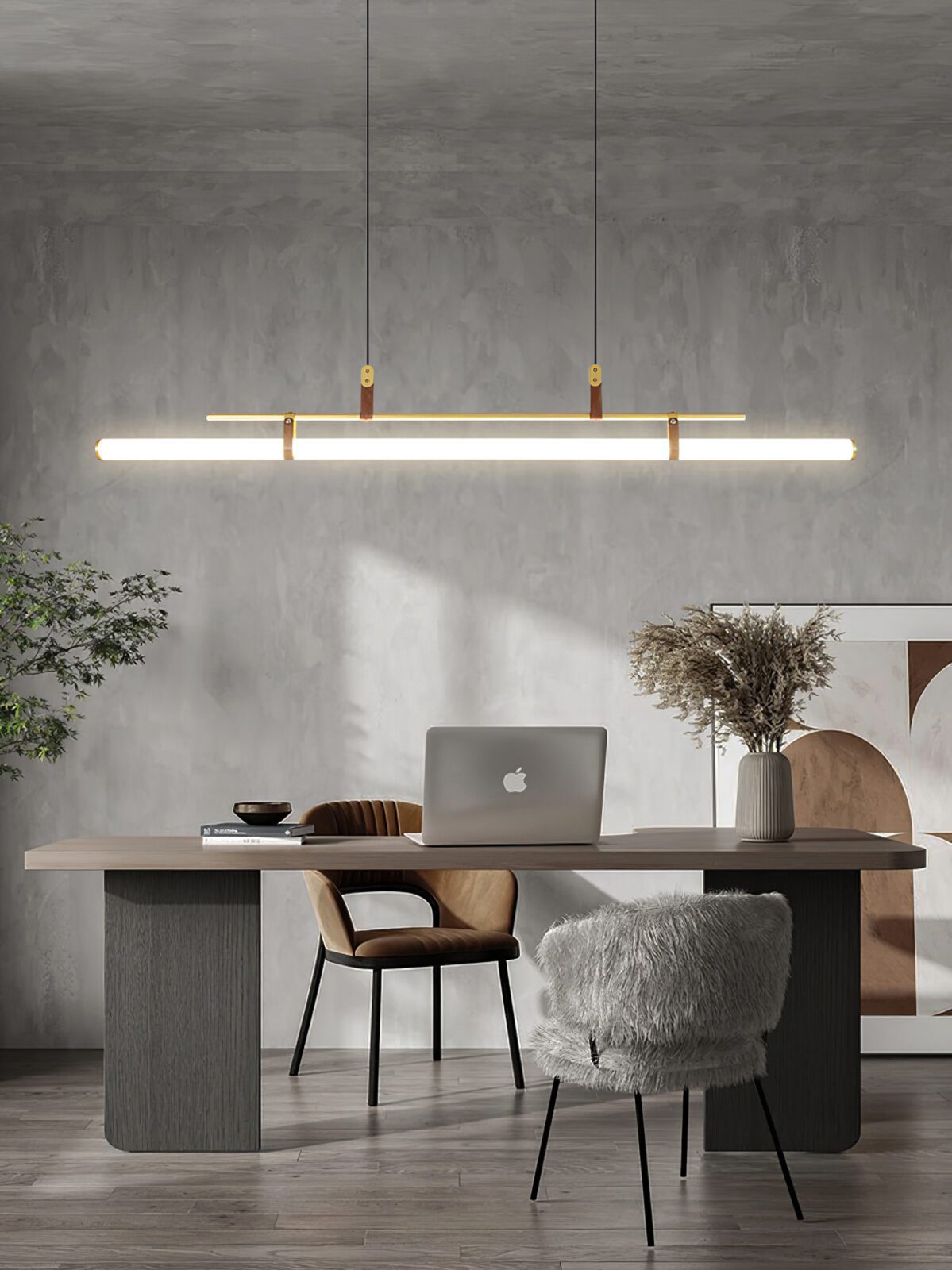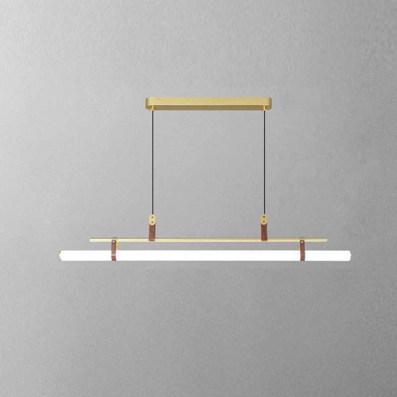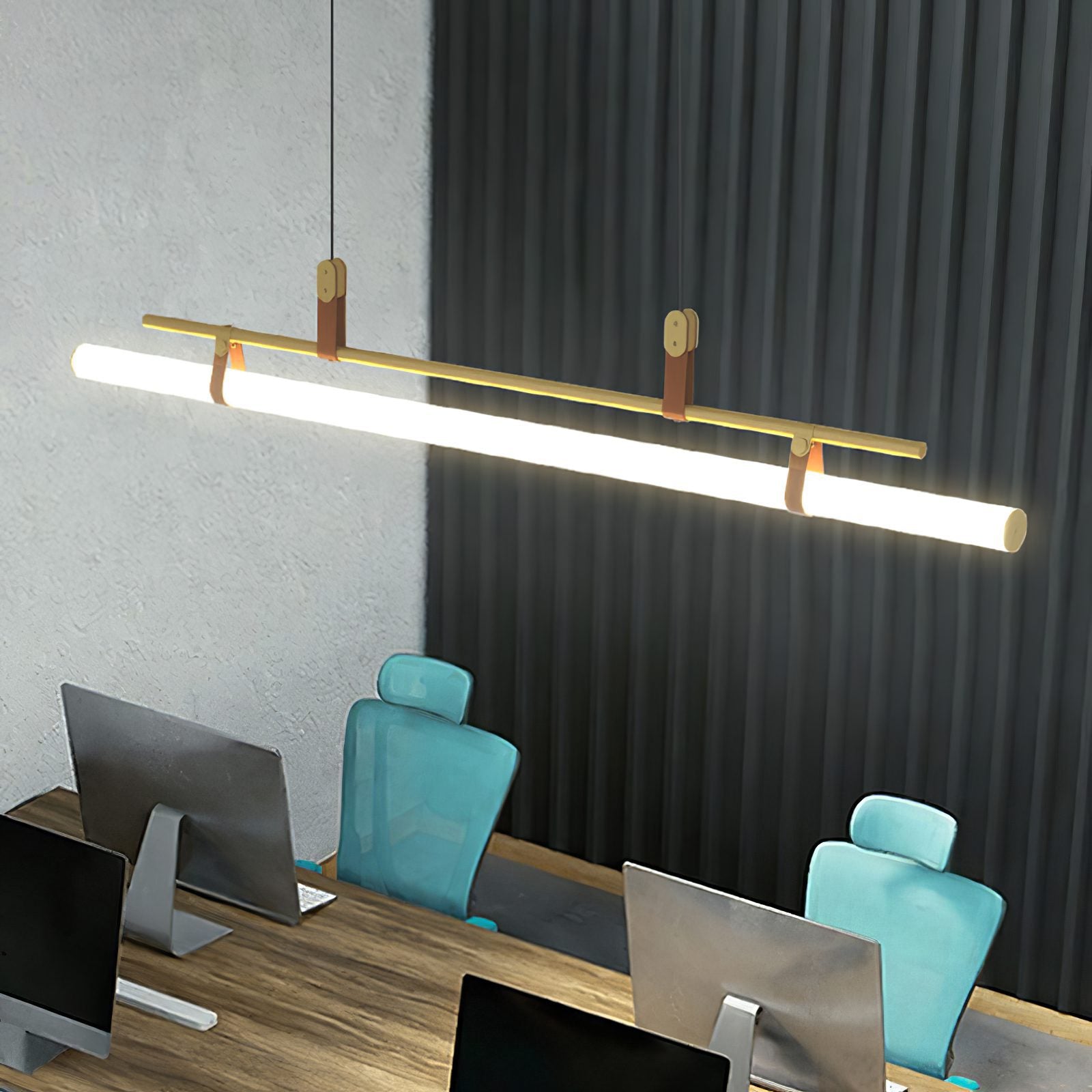 Enhance your space with the Eden Linear Pendant Light. This modern lamp features a sleek design and luxurious materials such as leather and metal to add a touch of elegance. Integrated LEDs provide energy-efficient lighting and generate almost no heat, showing a better quality of life. Elevate your style with this modern pendant light.