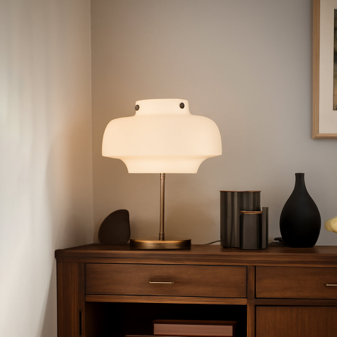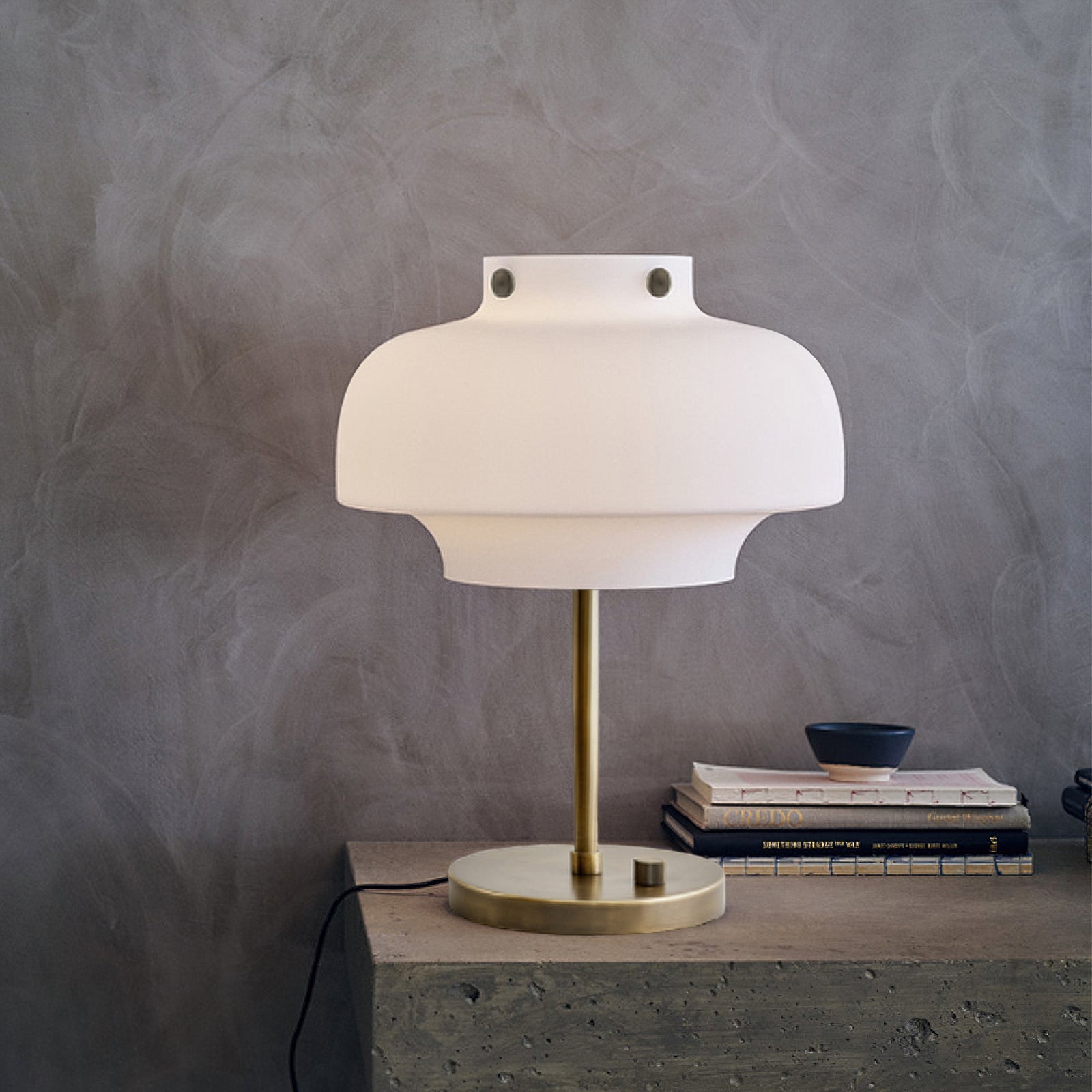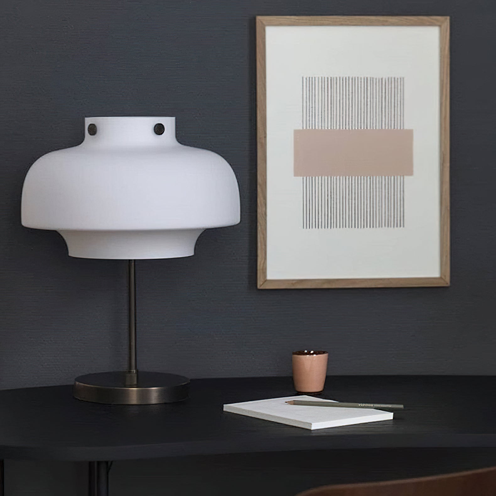 The Edwin Table Lamp from Mooijane combines timeless elegance with functional design. Featuring a smooth opaline glass shade paired with an oxidized metal stem and base, it casts a soft, ambient glow to enhance any workspace. This lamp creates a tranquil atmosphere, making it the perfect addition to your desk or bedside table.