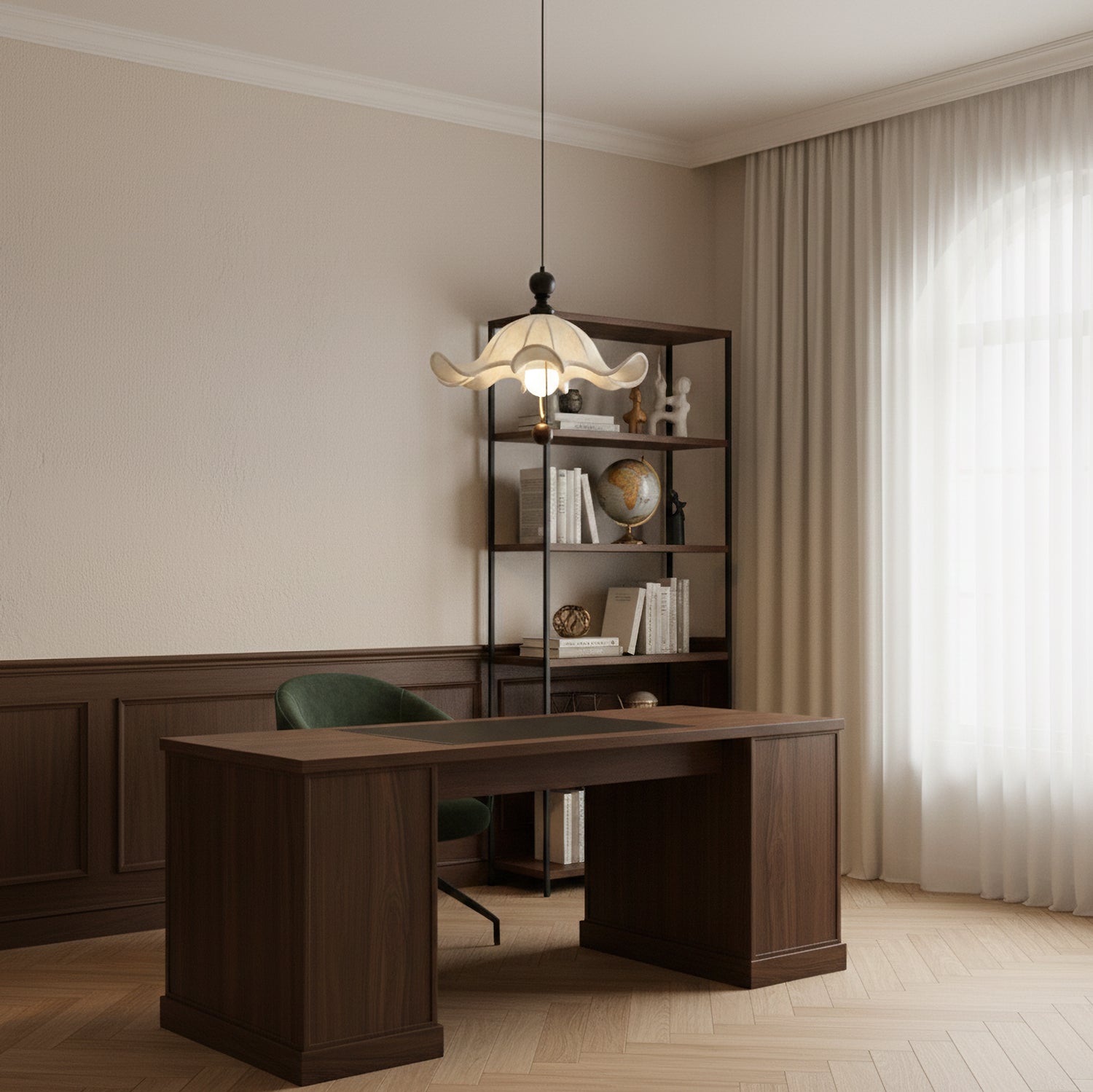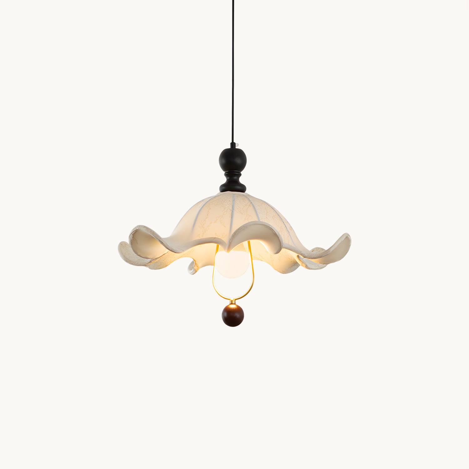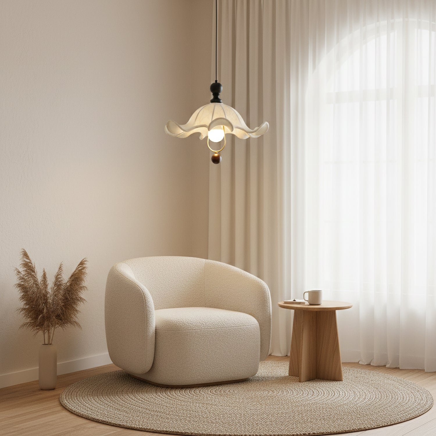 The Elanall Pendant Lamp from Mooijane blends natural warmth with soft, vintage-inspired elegance. Its fabric shade opens like a blooming flower, with gently curled edges that add movement and charm. When illuminated, it casts a warm, inviting glow, while the wooden accent ball beneath introduces a handcrafted, organic touch.
