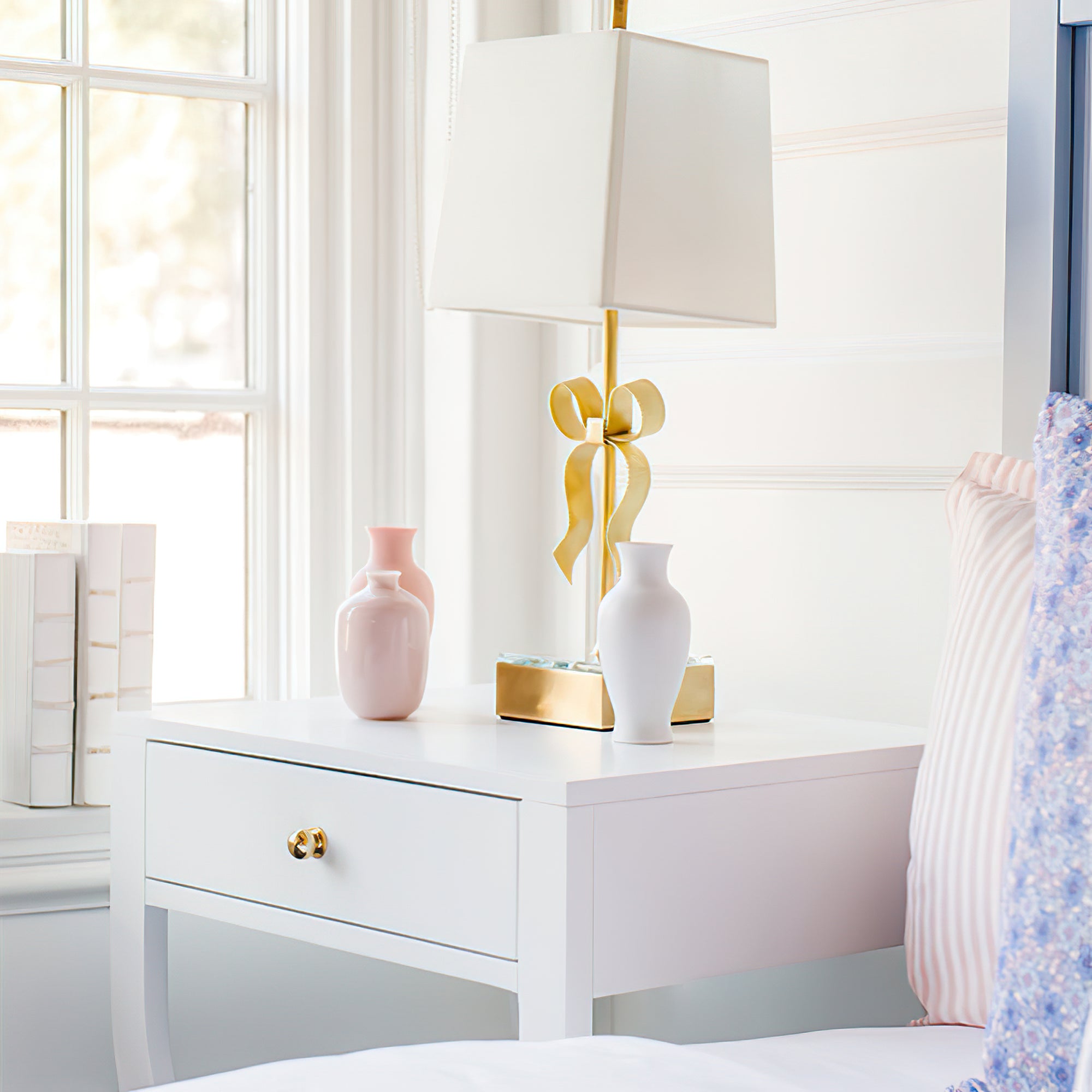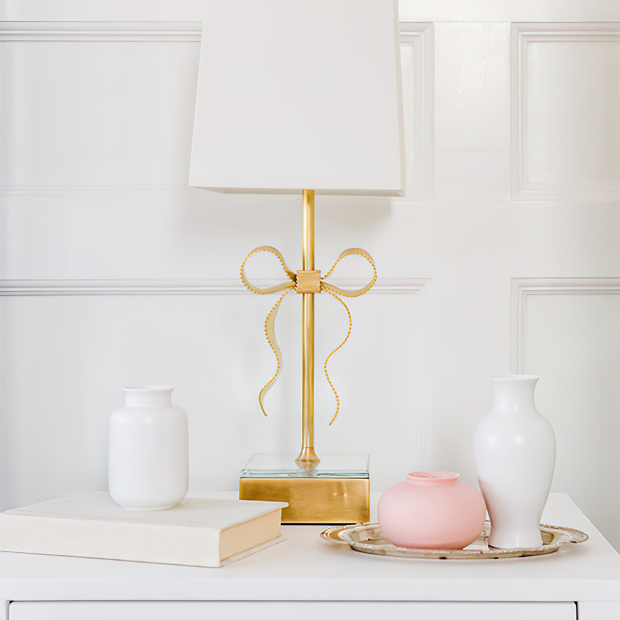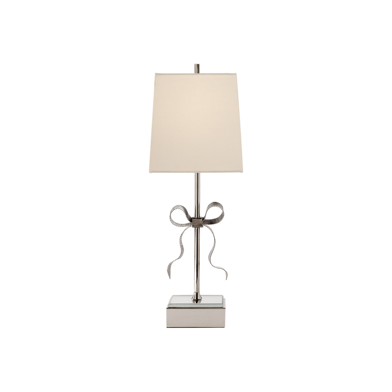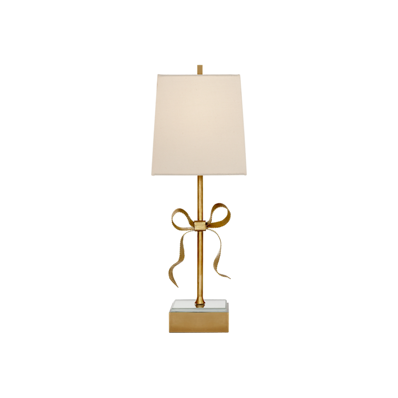 The Ellery Butterfly Table Lamp exudes graceful elegance with its decorative grosgrain bow and mirrored base. The linen shade adds a touch of glamour and the perfect feminine accent to any room. Illuminate your space with sophistication and charm.