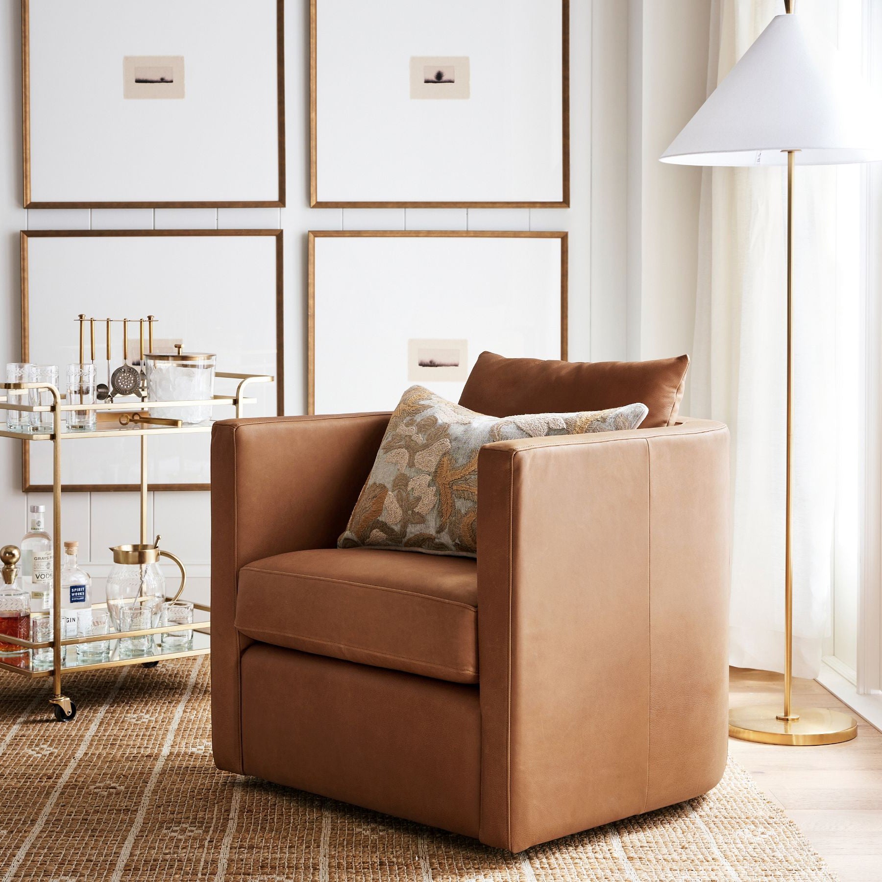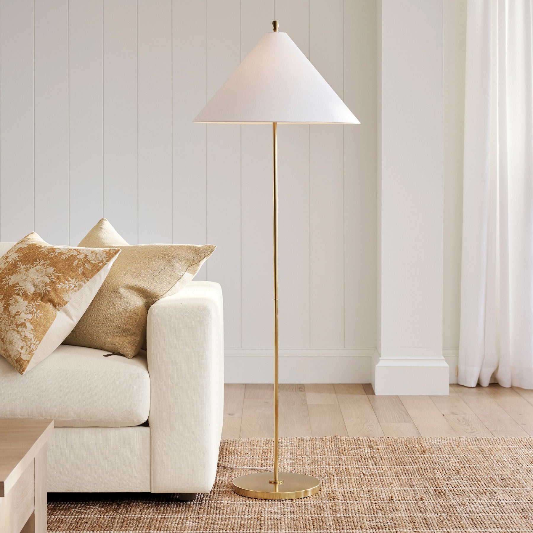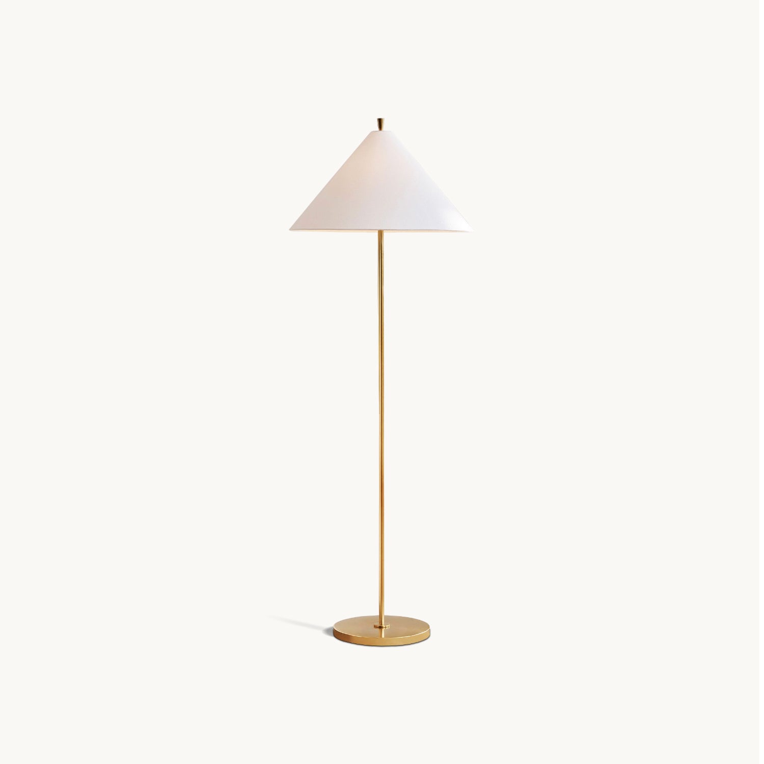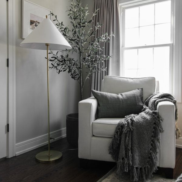 With a slender silhouette, this floor lamp strikes modern form with its unique flared shade and distinctive finial. The minimalist design is balanced by a gold finish for a luxurious touch. Subtle yet compelling, it’s perfect next to a reading chair or sofa.