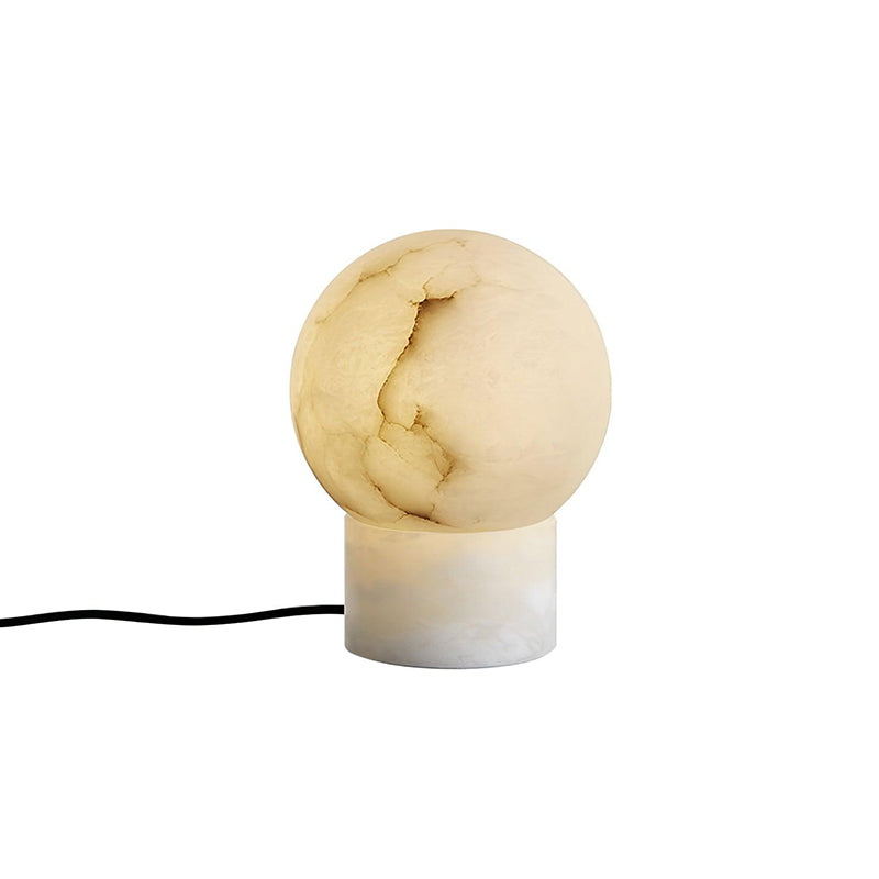 The Emmeline Table Lamp from Mooijane is crafted from natural snowflake alabaster, with each hand-carved globe diffuser offering a unique amber-toned glow. Its warm, moonlit radiance adds a serene and organic touch to any space, making it a timeless accent for bedside tables, consoles, or reading corners. A perfect blend of natural beauty and refined design.