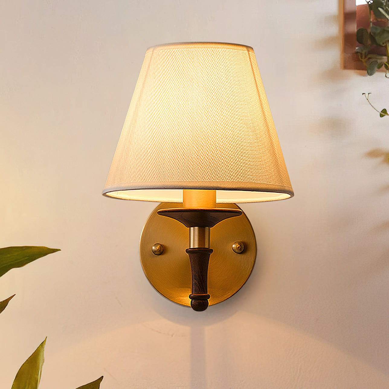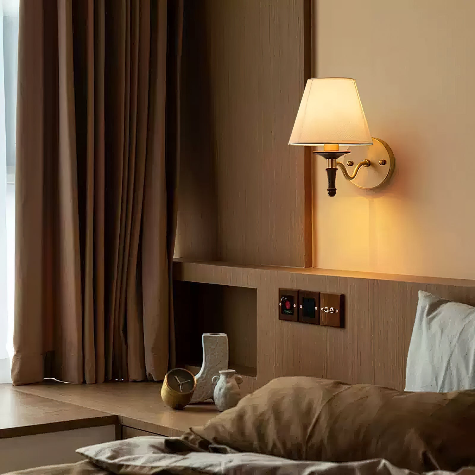 Introducing the Eryn Wall Lamp from Mooijane. This exquisite wall lamp features a bulb design and a high light transmittance fabric lampshade, adding elegance to any room. The natural ash wood decoration and pure copper lamp body make it a timeless addition to your home.