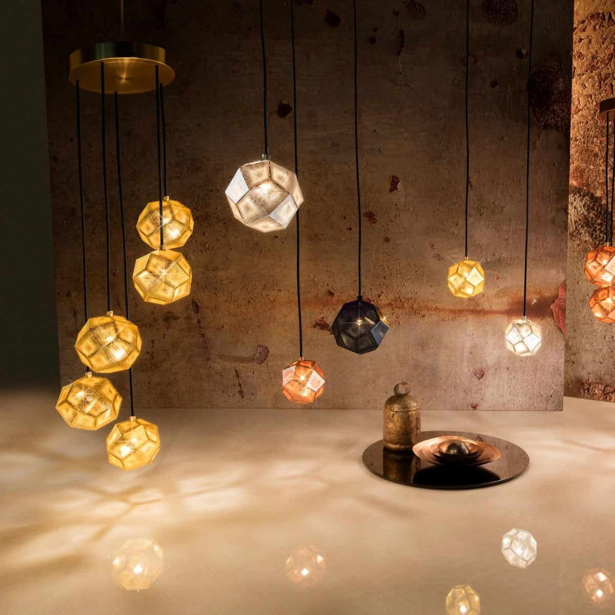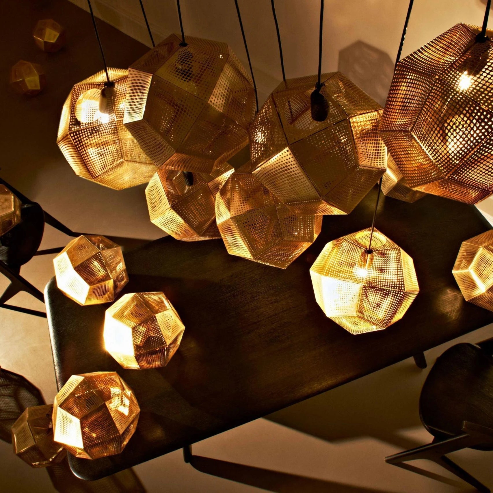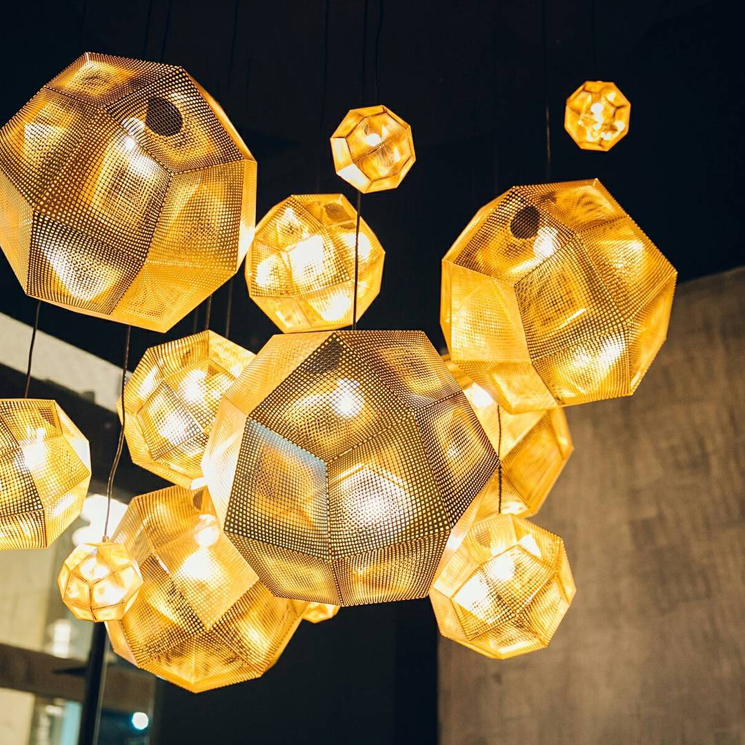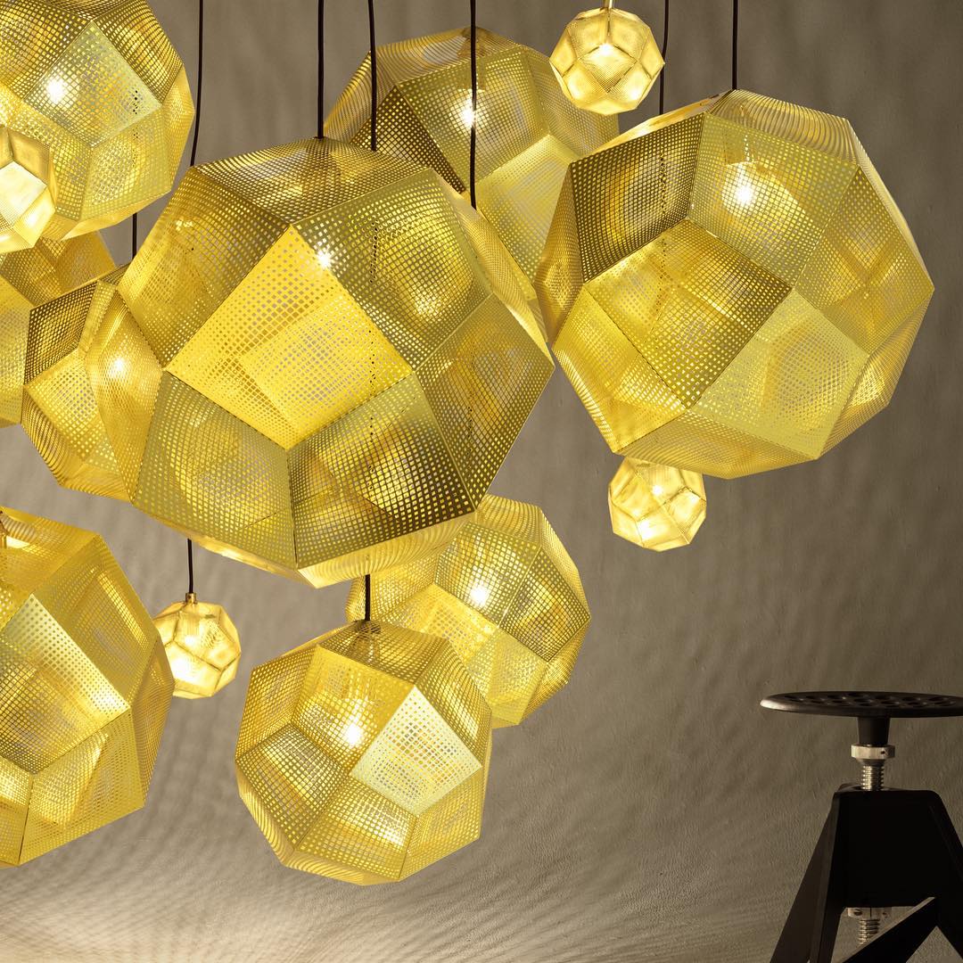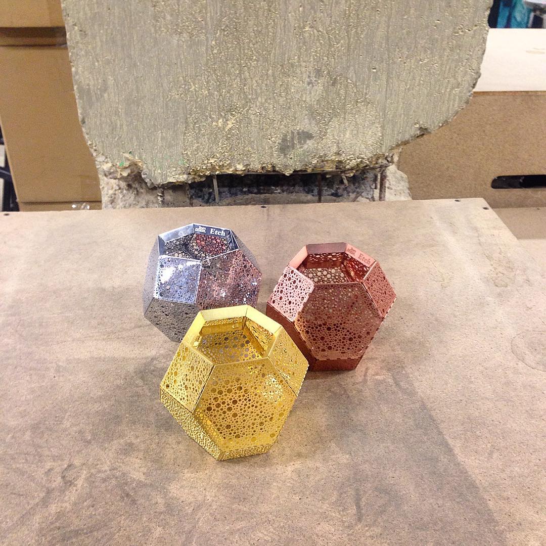 These geodesic pendants and tea light holders are formed of finely pierced flat metal sheets tabbed together like Victorian tin toys. Using digital acid etching methods, Etch has pattered for the effective filtering of light designed to cast an intricate set of shadows. The collection also features tea infusers.