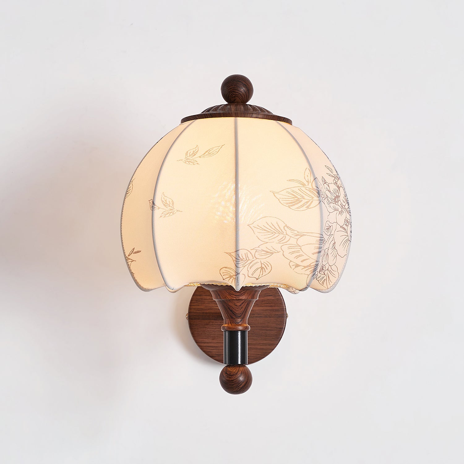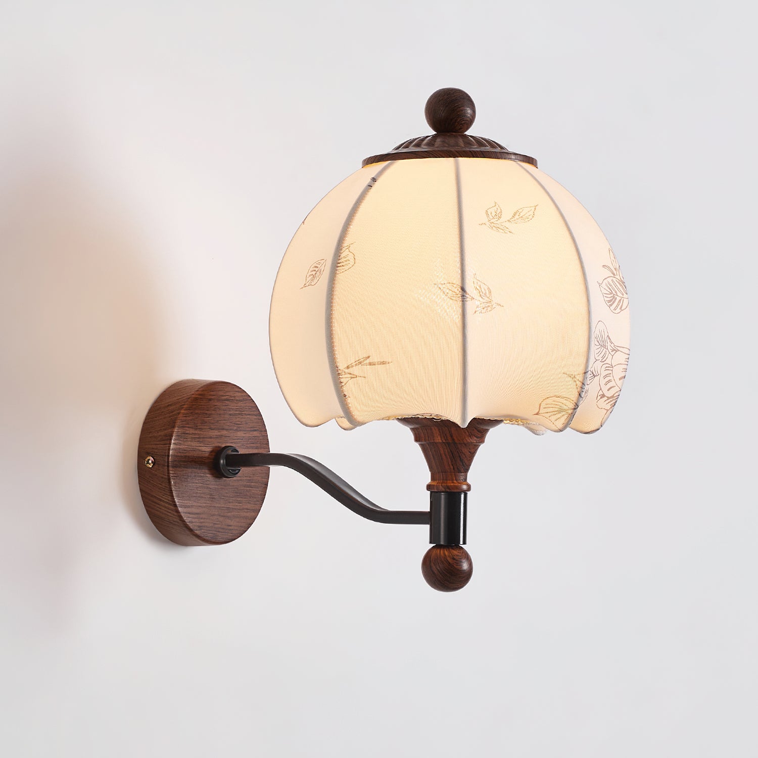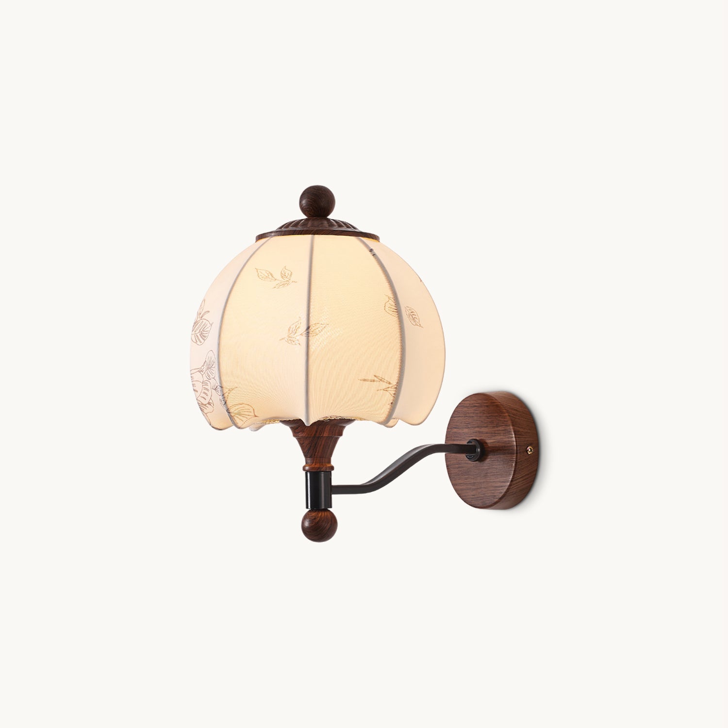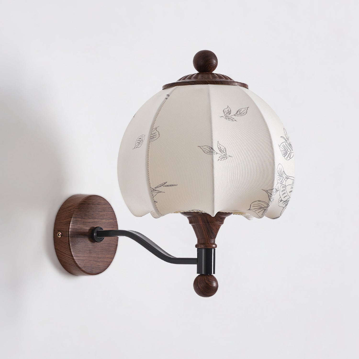 The Evelyn Wall Lamp by Mooijane blends natural warmth with vintage charm. Its wooden base and detailed body provide texture and stability, while the fabric shade, adorned with subtle floral and leafy patterns, resembles a blooming bud. When illuminated, it diffuses a soft, tranquil glow, creating a cozy interplay of light and shadow.