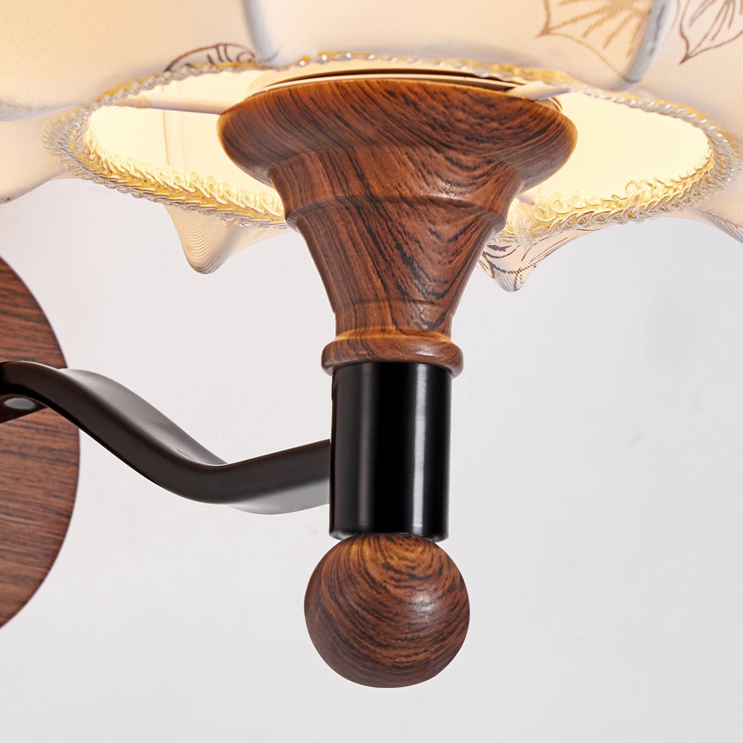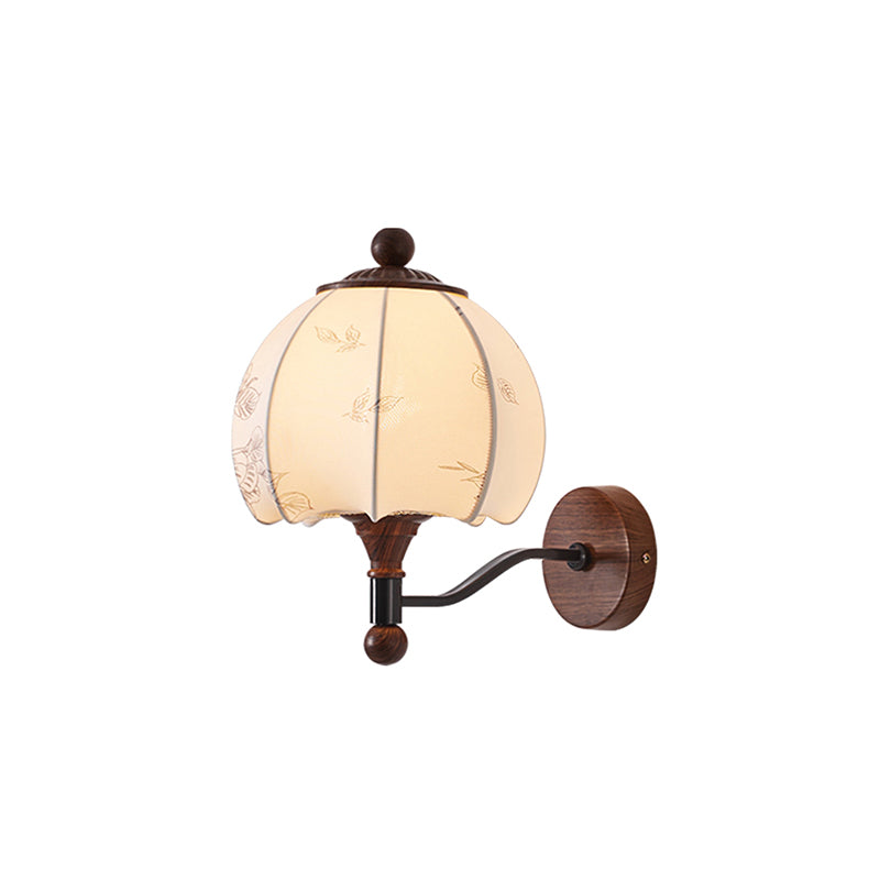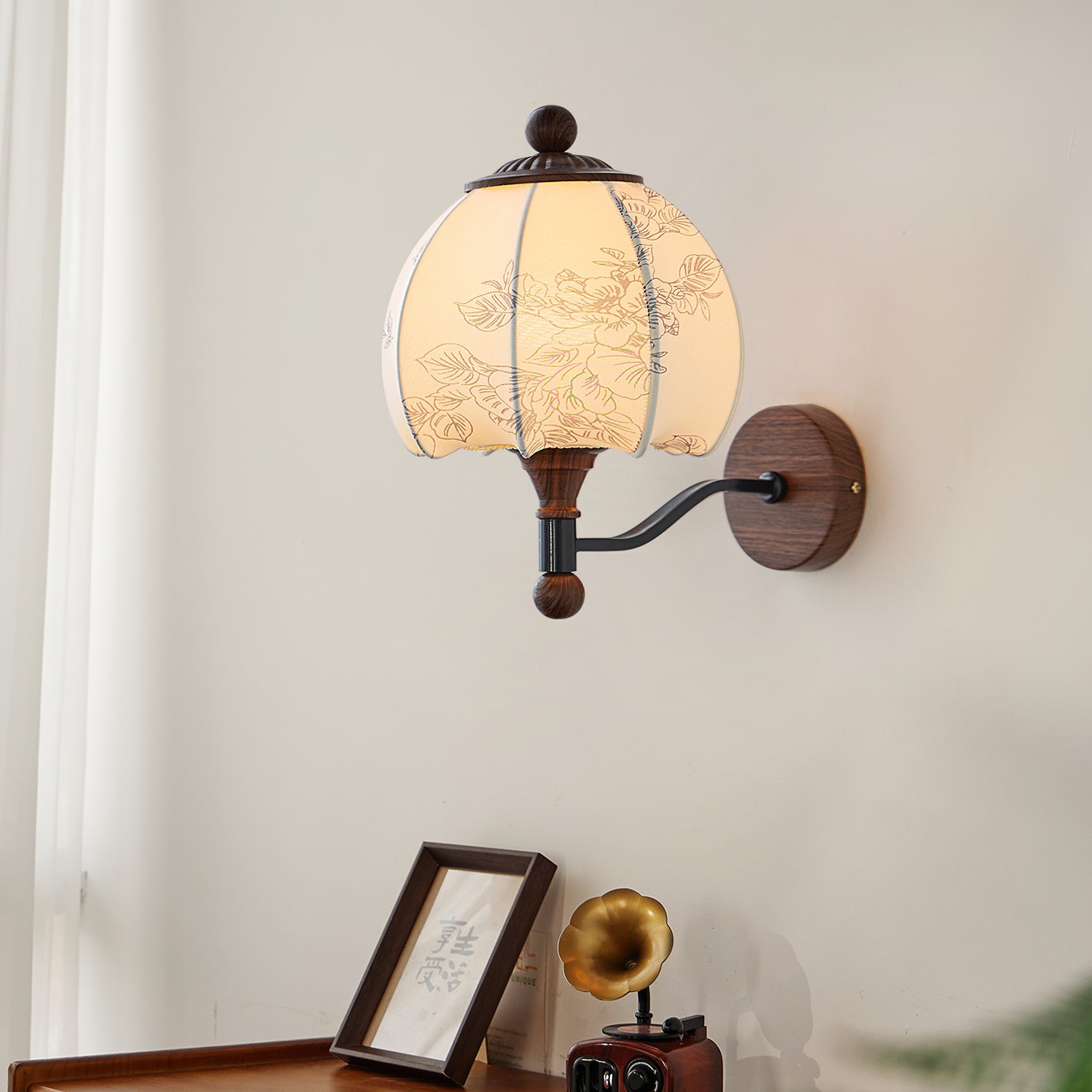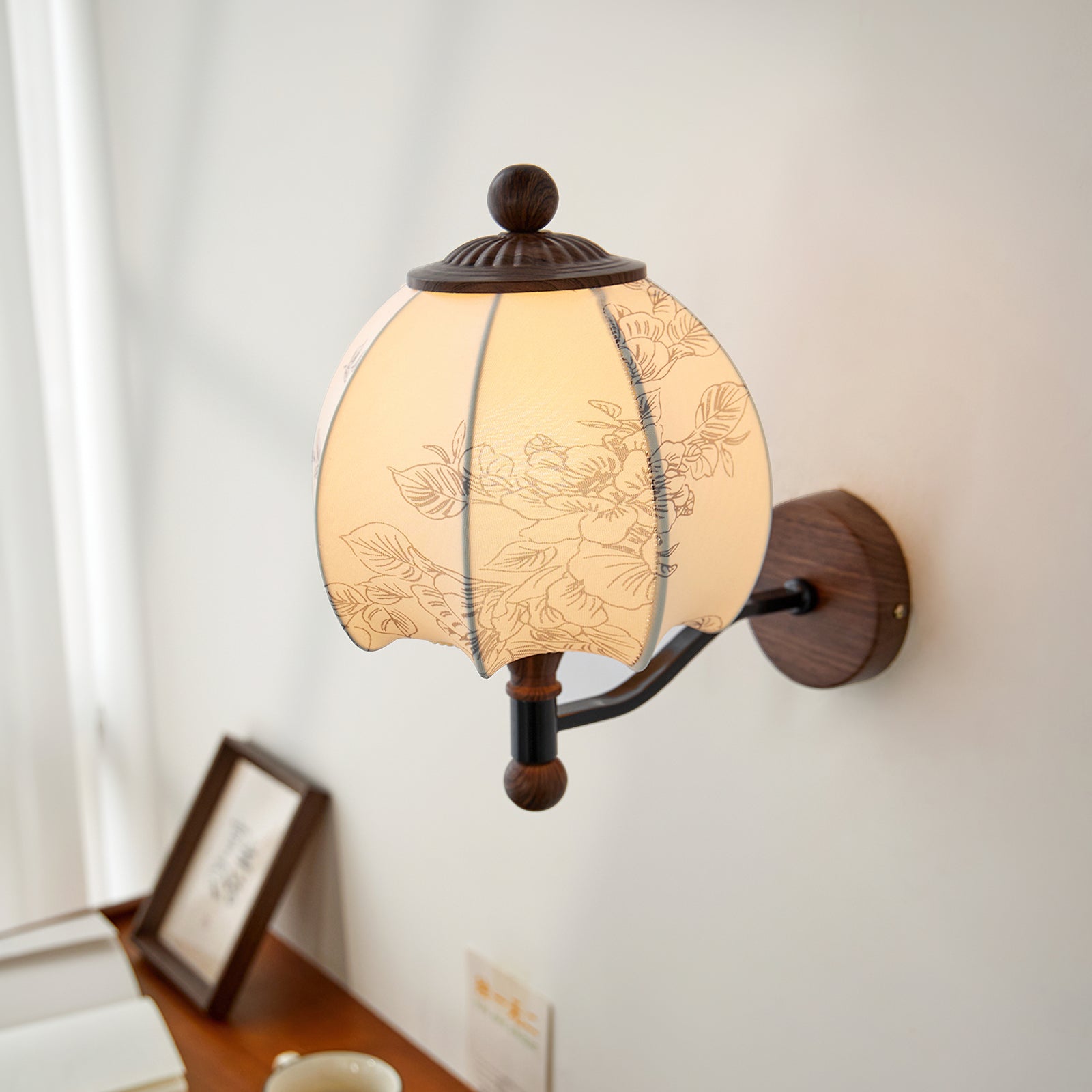 The Evelyn Wall Lamp by Mooijane blends natural warmth with vintage charm. Its wooden base and detailed body provide texture and stability, while the fabric shade, adorned with subtle floral and leafy patterns, resembles a blooming bud. When illuminated, it diffuses a soft, tranquil glow, creating a cozy interplay of light and shadow.