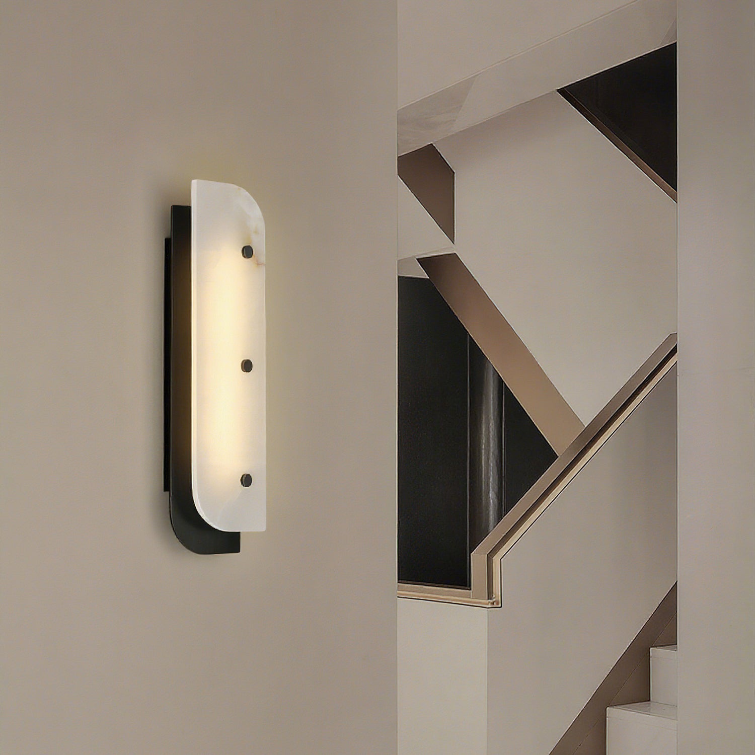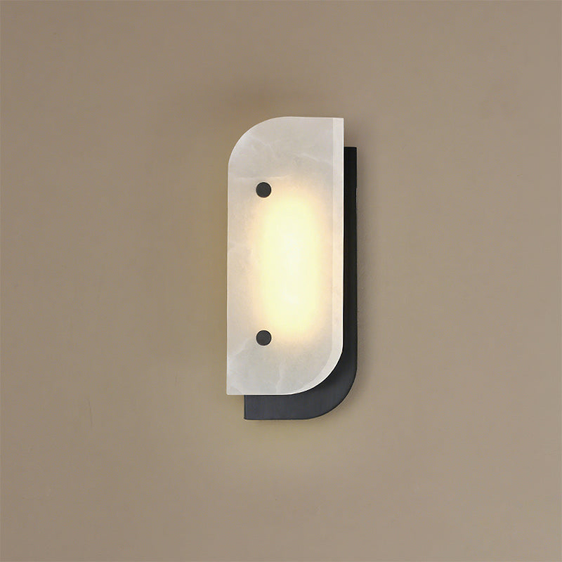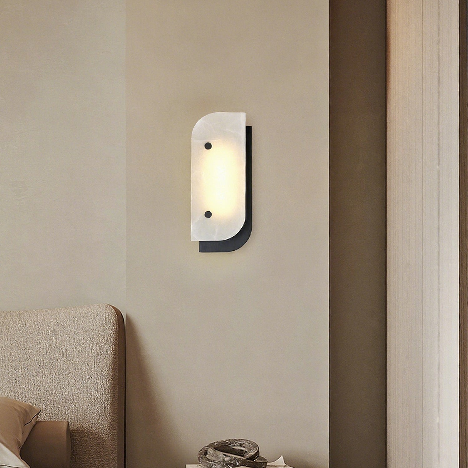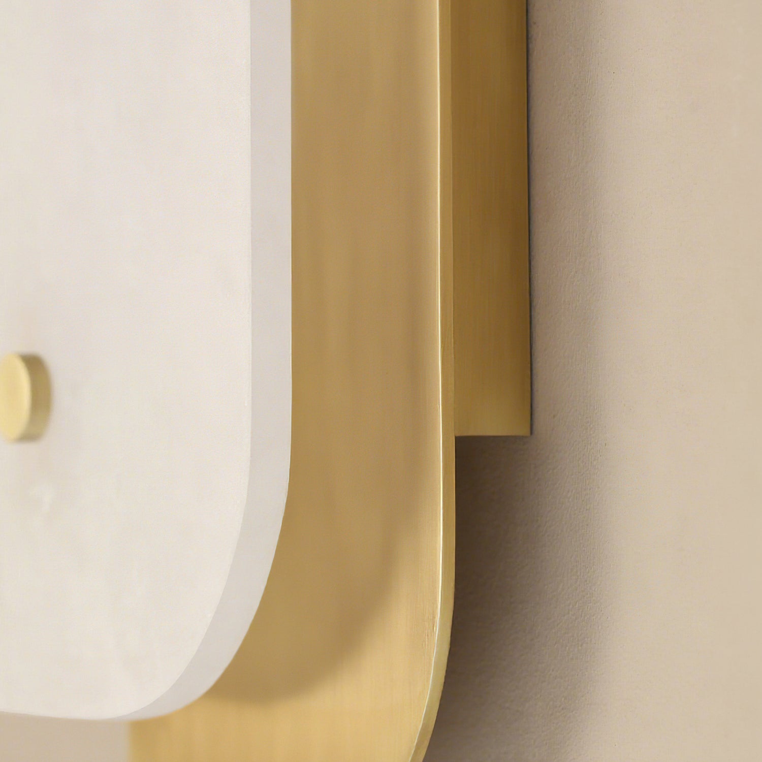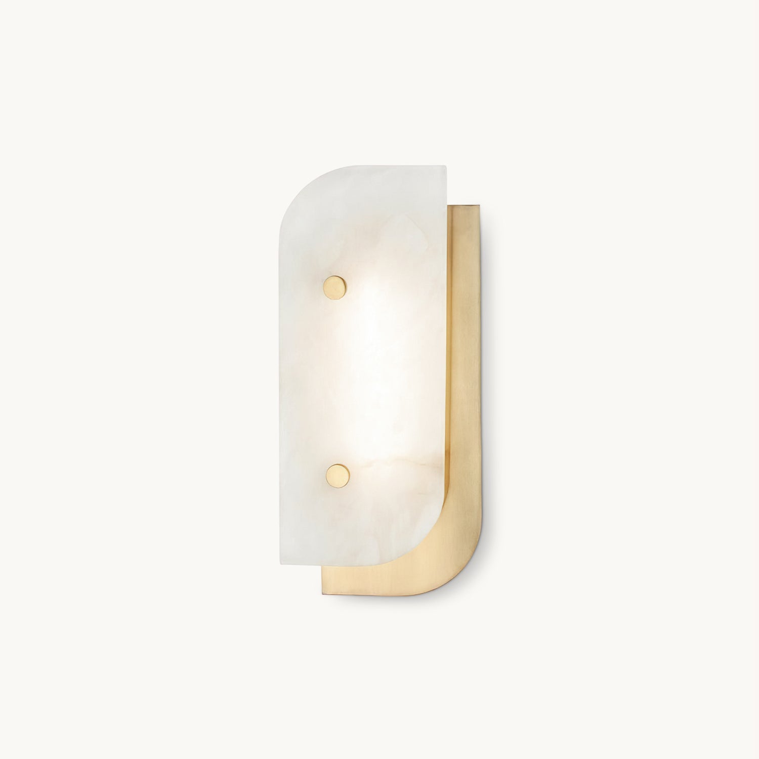 The Everly Wall Lamp from Mooijane features a sleek metal frame and an alabaster shade that softly diffuses light, creating a warm, inviting ambiance. Its sculptural geometric design adds a timeless and stylish focal point to any room.