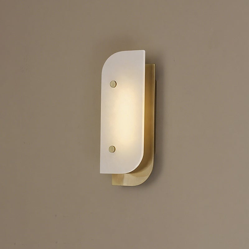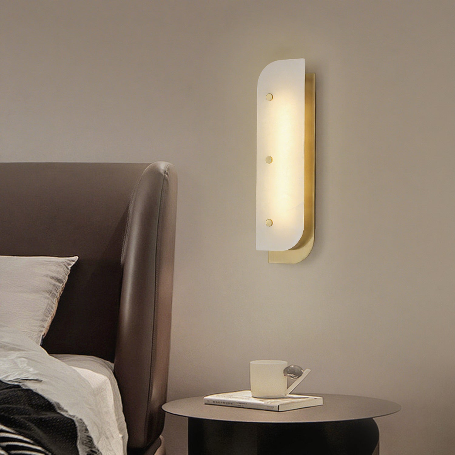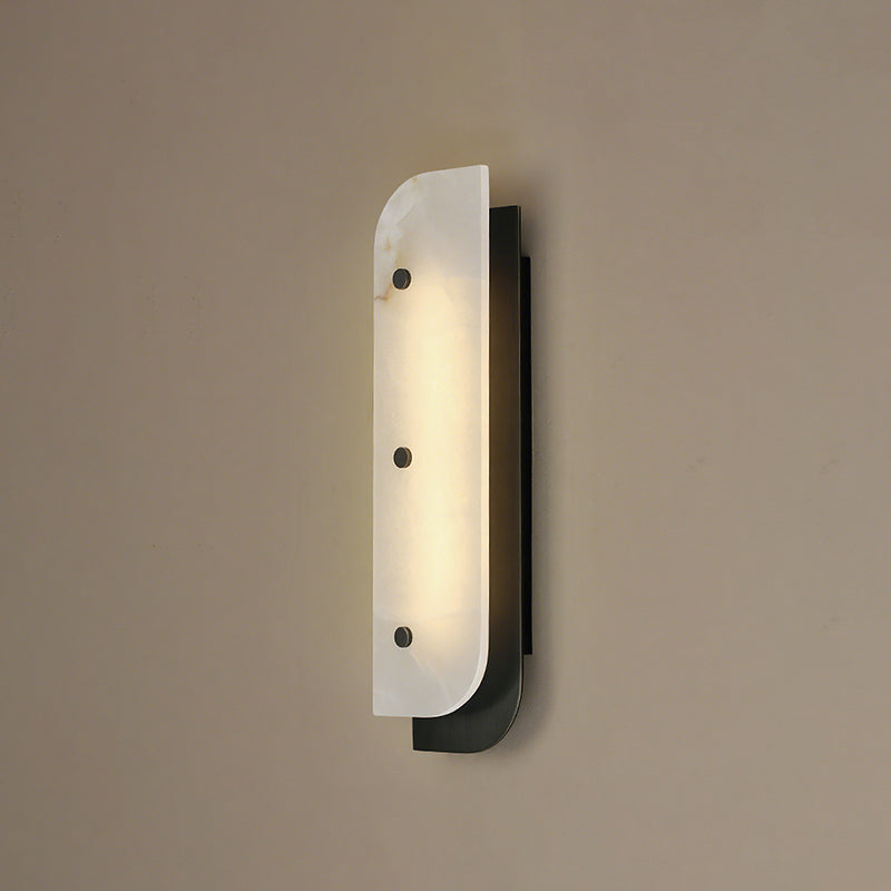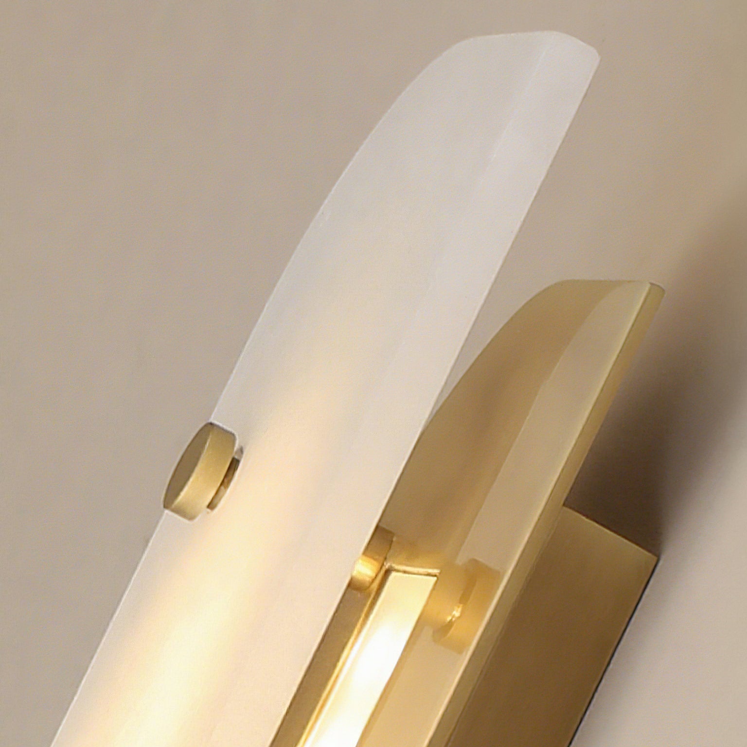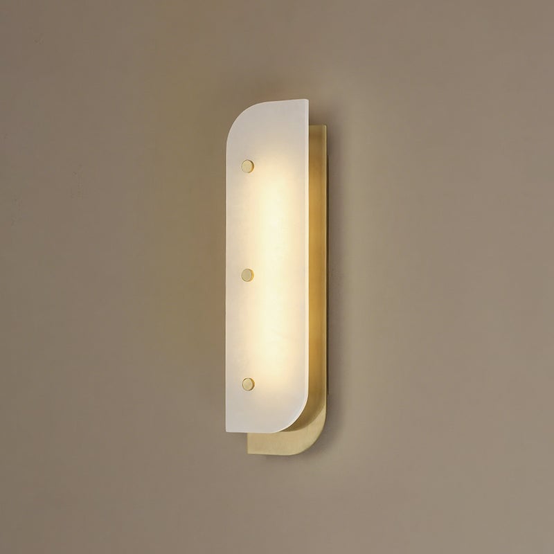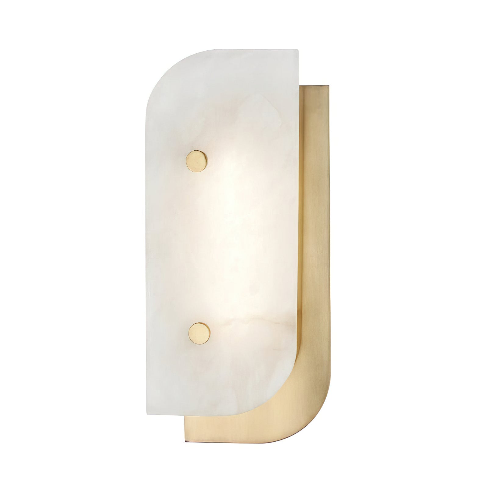 The Everly Wall Lamp from Mooijane features a sleek metal frame and an alabaster shade that softly diffuses light, creating a warm, inviting ambiance. Its sculptural geometric design adds a timeless and stylish focal point to any room.