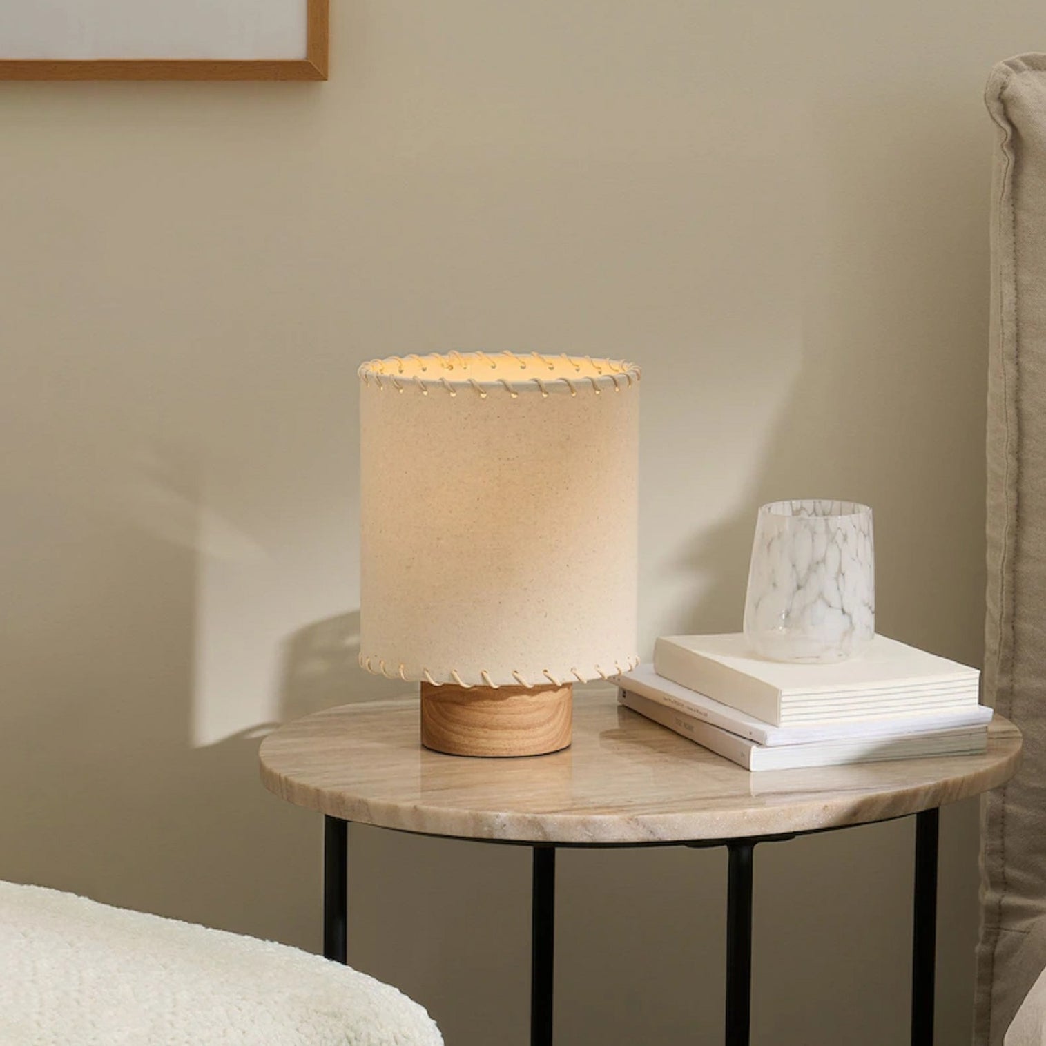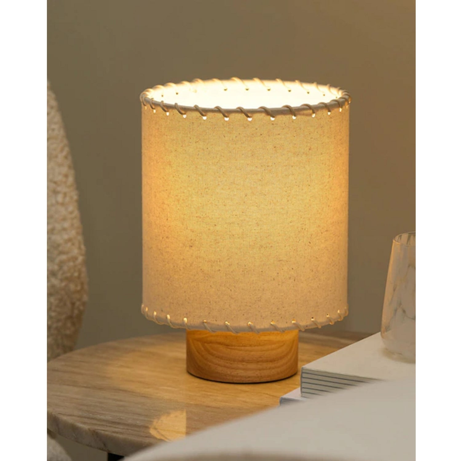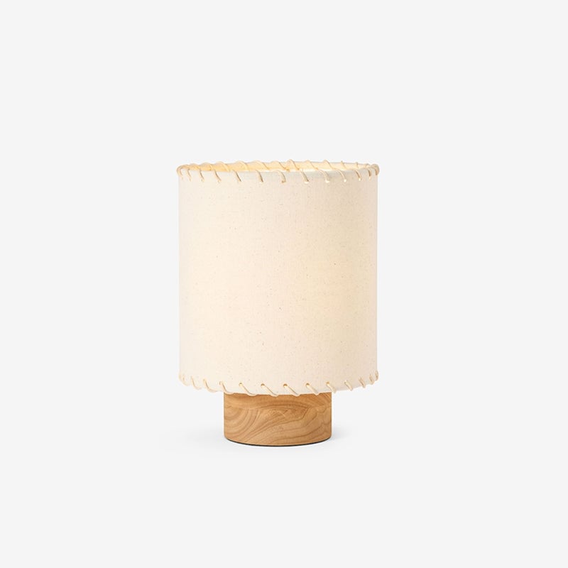The Farley Table Lamp from Mooijane blends minimalist design with artisanal charm. Its cream cylindrical shade features delicate stitched lace-up detailing, perched on a solid wood base that adds natural warmth. Compact and versatile, this lamp provides a soft, ambient glow—perfect for bedside tables, desks, or sideboards.