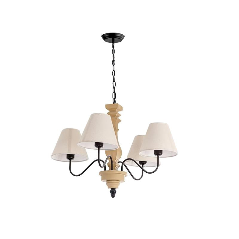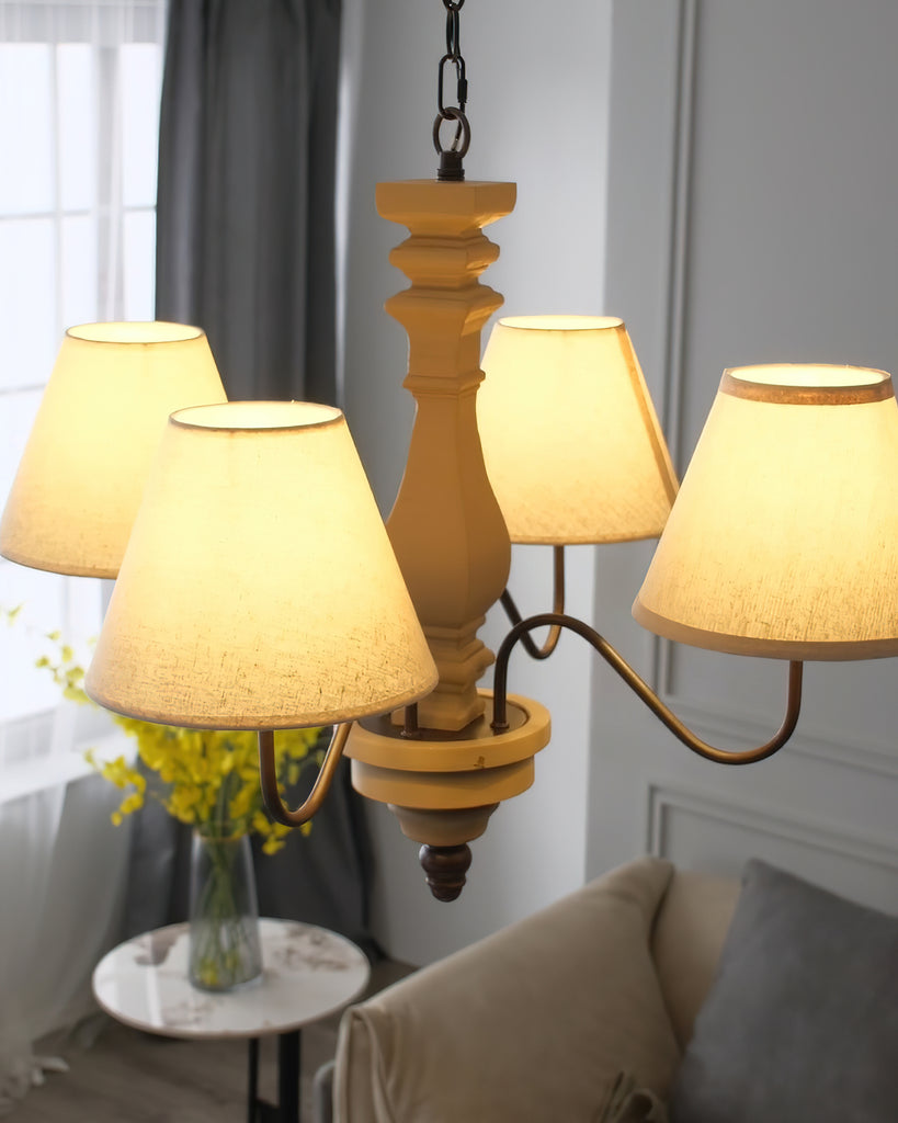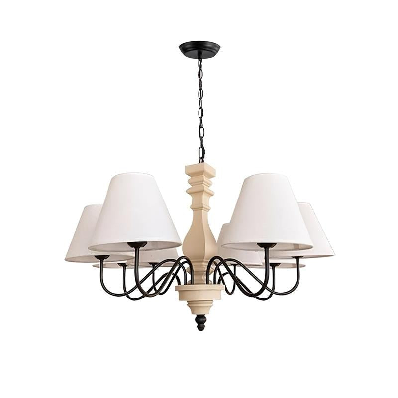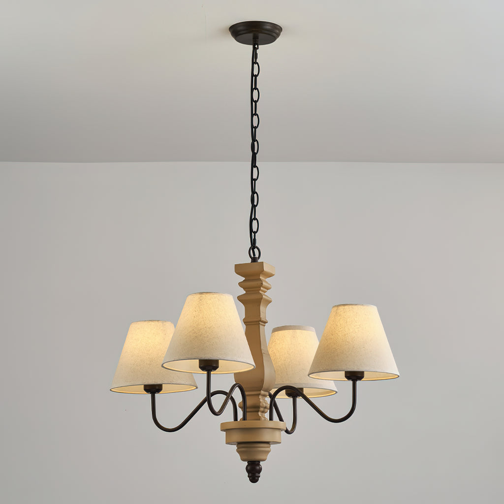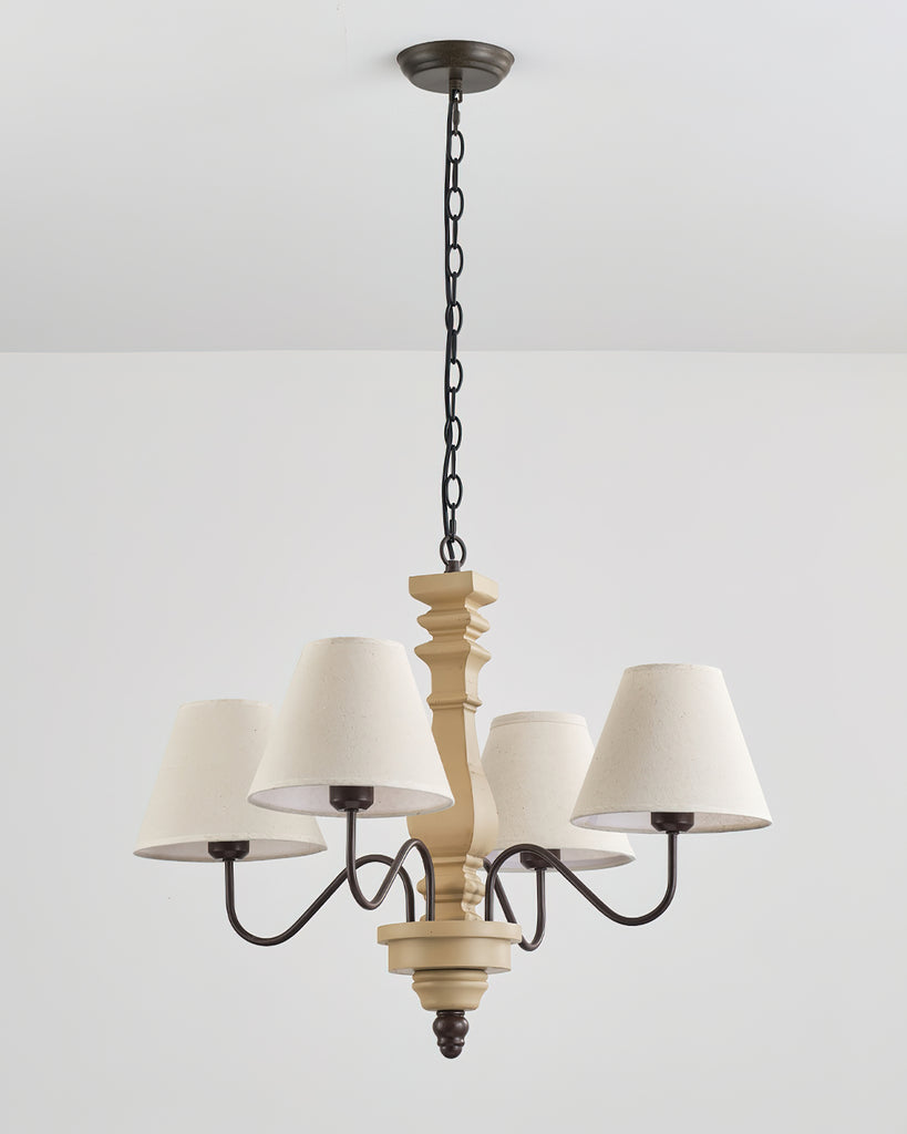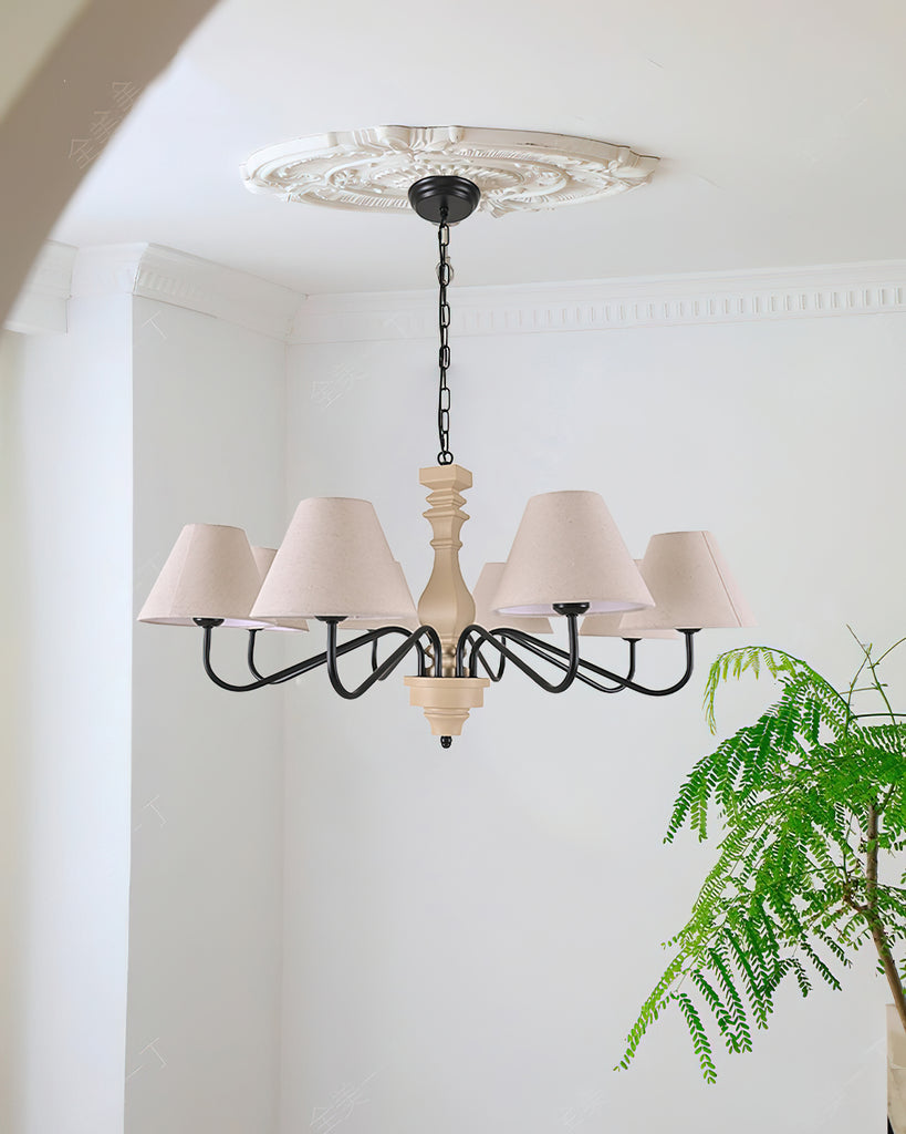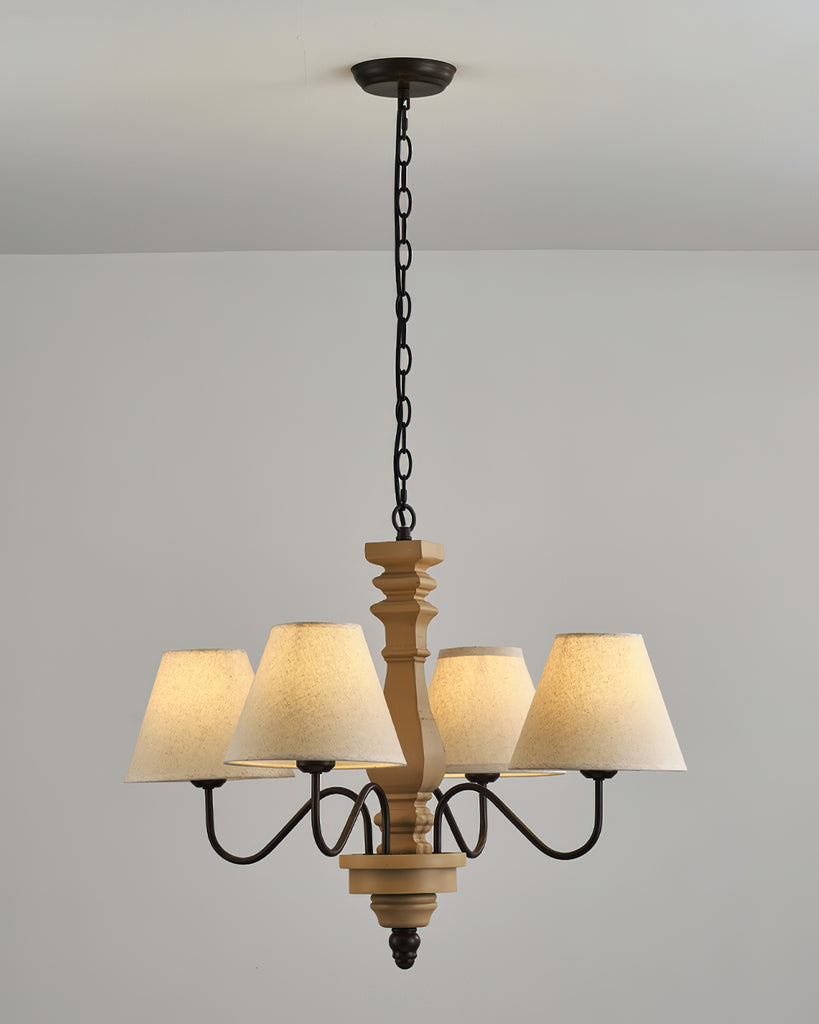 Elevate your decor with the Fatima Wooden Chandelier from Mooijane. This unique fixture combines rustic charm with modern design, featuring a neutral-toned wooden spindle and elegant curved arms with classic fabric shades. The soft contrast adds sophistication and warmth, perfect for a dining room or entryway. Add timeless elegance and modern flair to your home with this chandelier.
