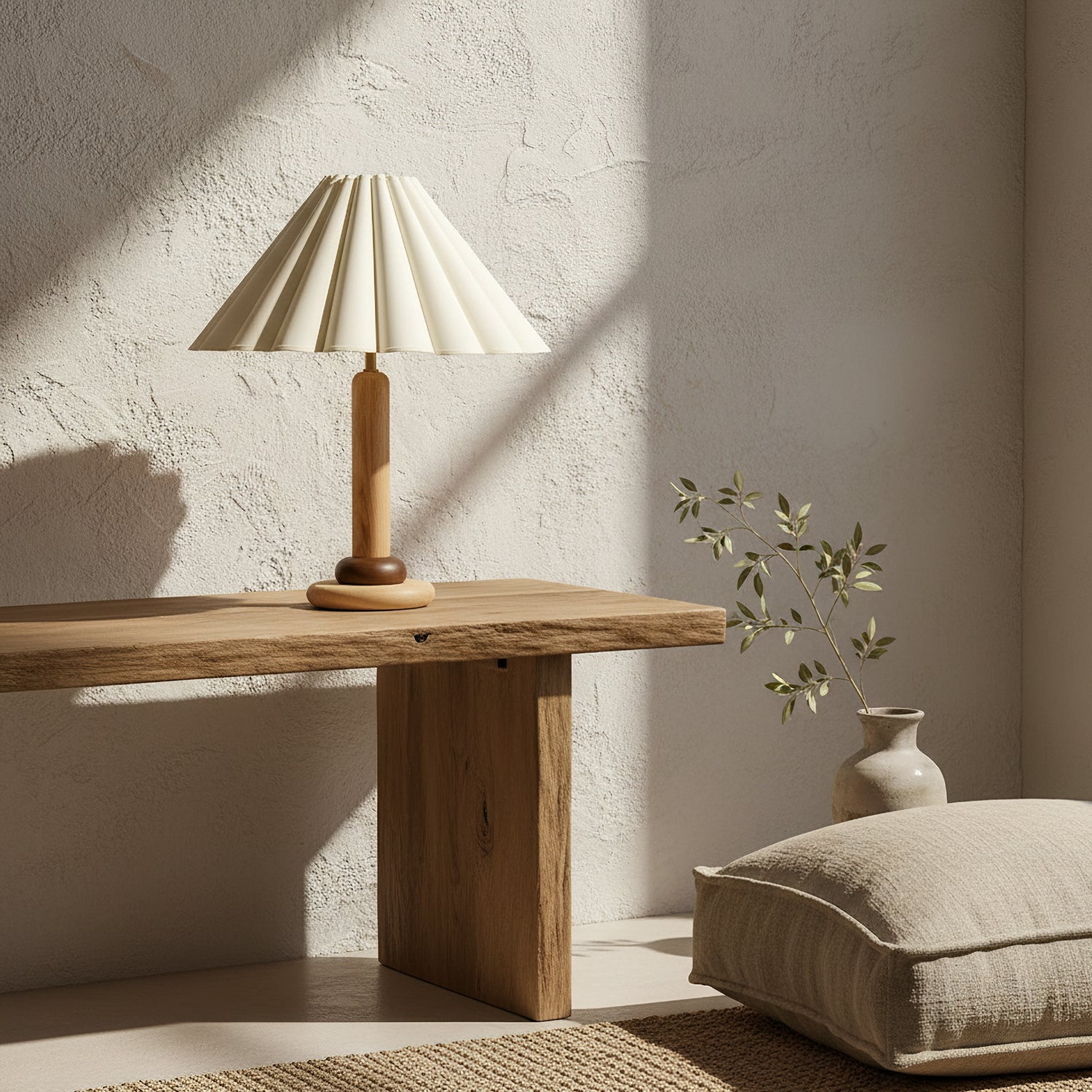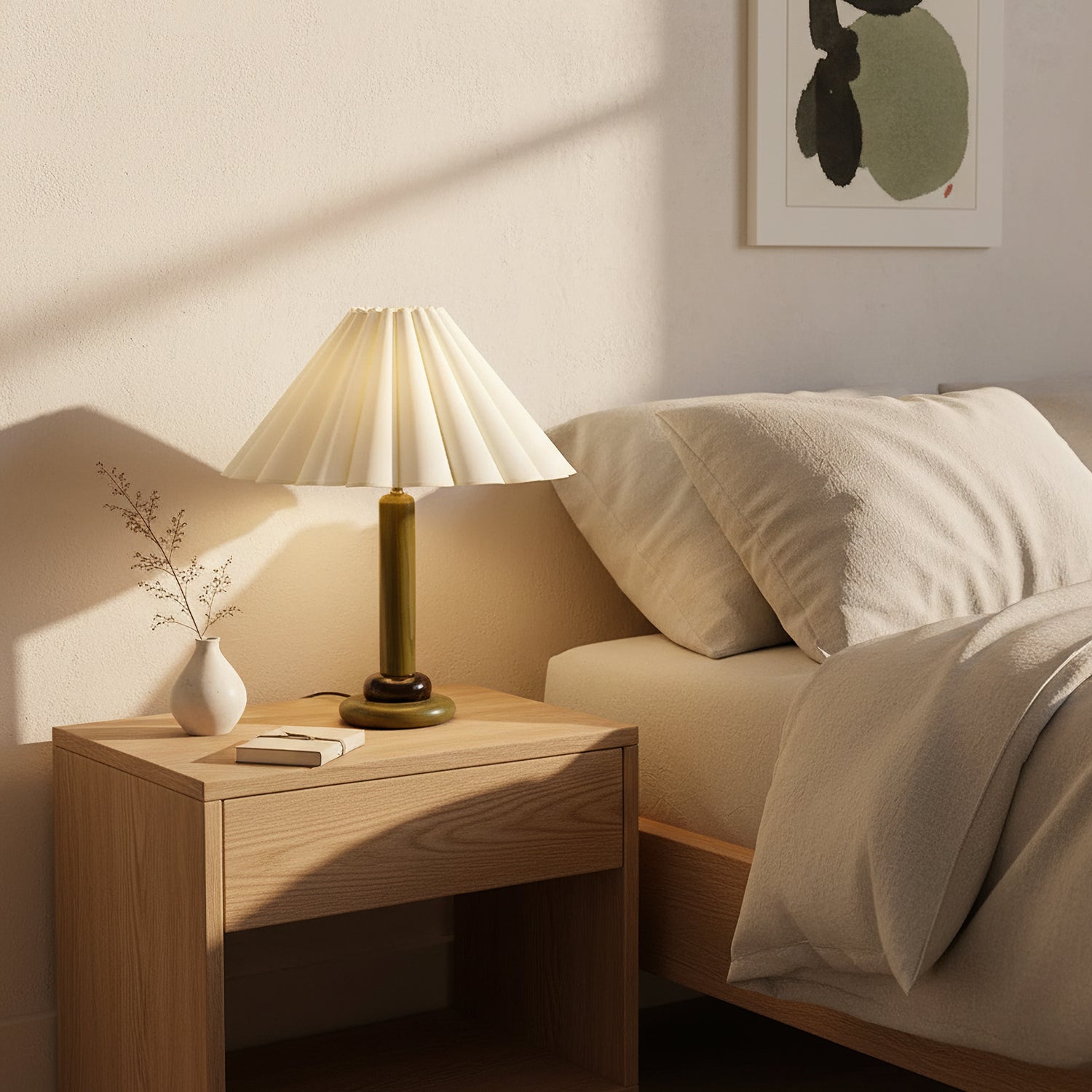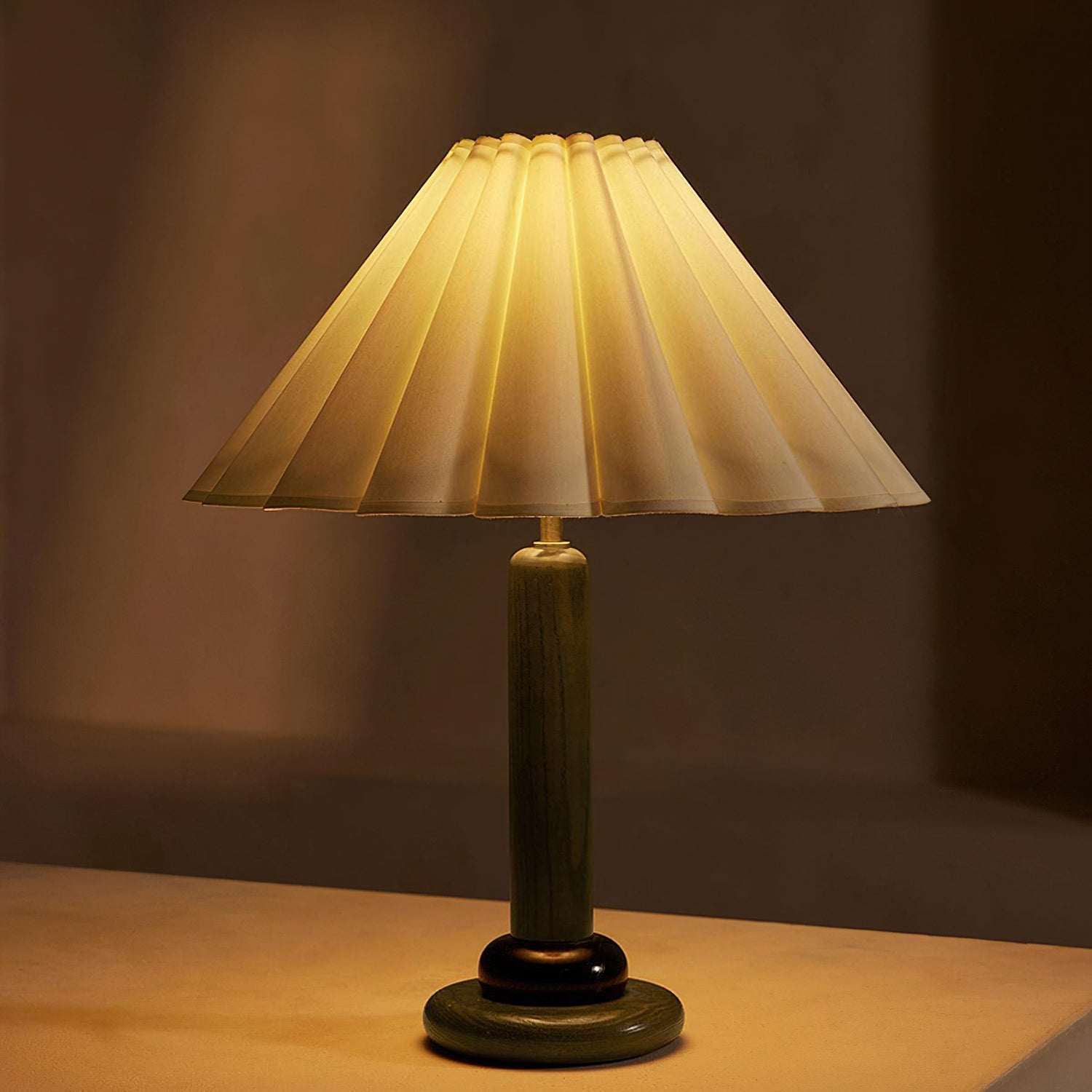 The Ferguson Table Lamp from Mooijane blends retro simplicity with natural elegance. Crafted from warm solid wood, its upright cylindrical stem and sturdy round base offer clean, balanced lines. The pleated white fabric shade adds texture and softness, gently diffusing light to create a calm, inviting atmosphere. Ideal for bedside tables, desks, or reading corners, this lamp combines function and charm to enrich any living space.