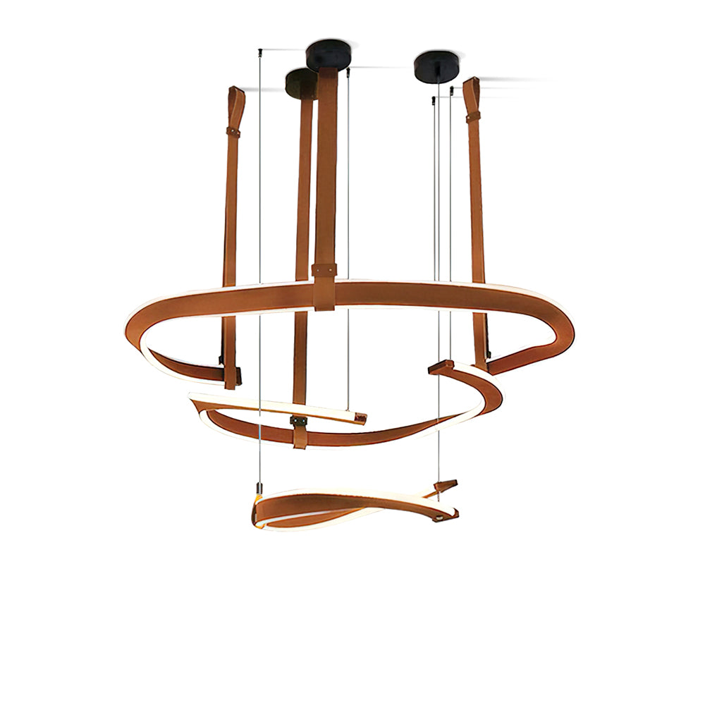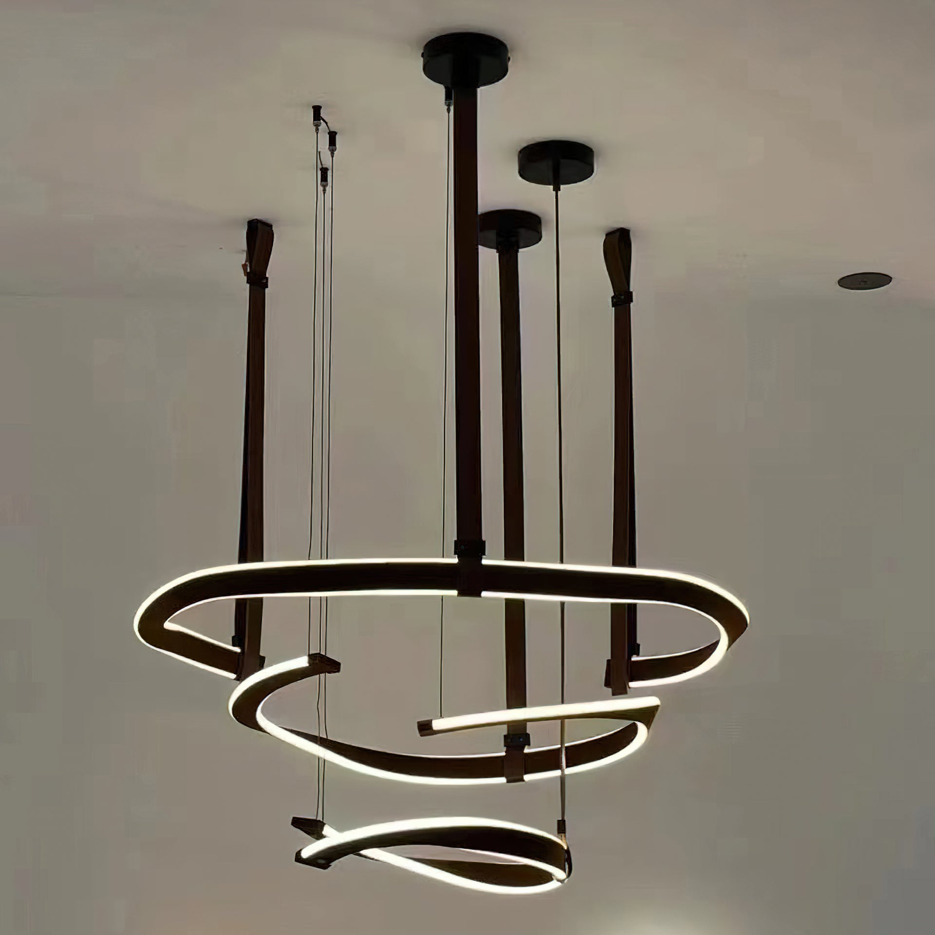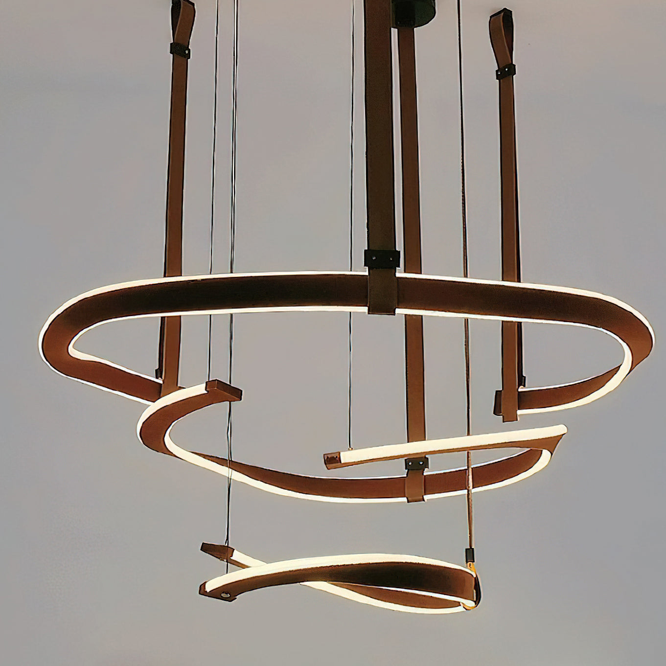 Abstract yet inviting, this linear hanging brings drama and sculpture to your home. Like a modern piece of art suspended from the ceiling, this linear piece consists of a series of twisted rings suspended from thin wires. Each ring has its own flaws that offer a unique touch to typical decorating choices. The outside of each ring is illuminated by integrated LEDs.