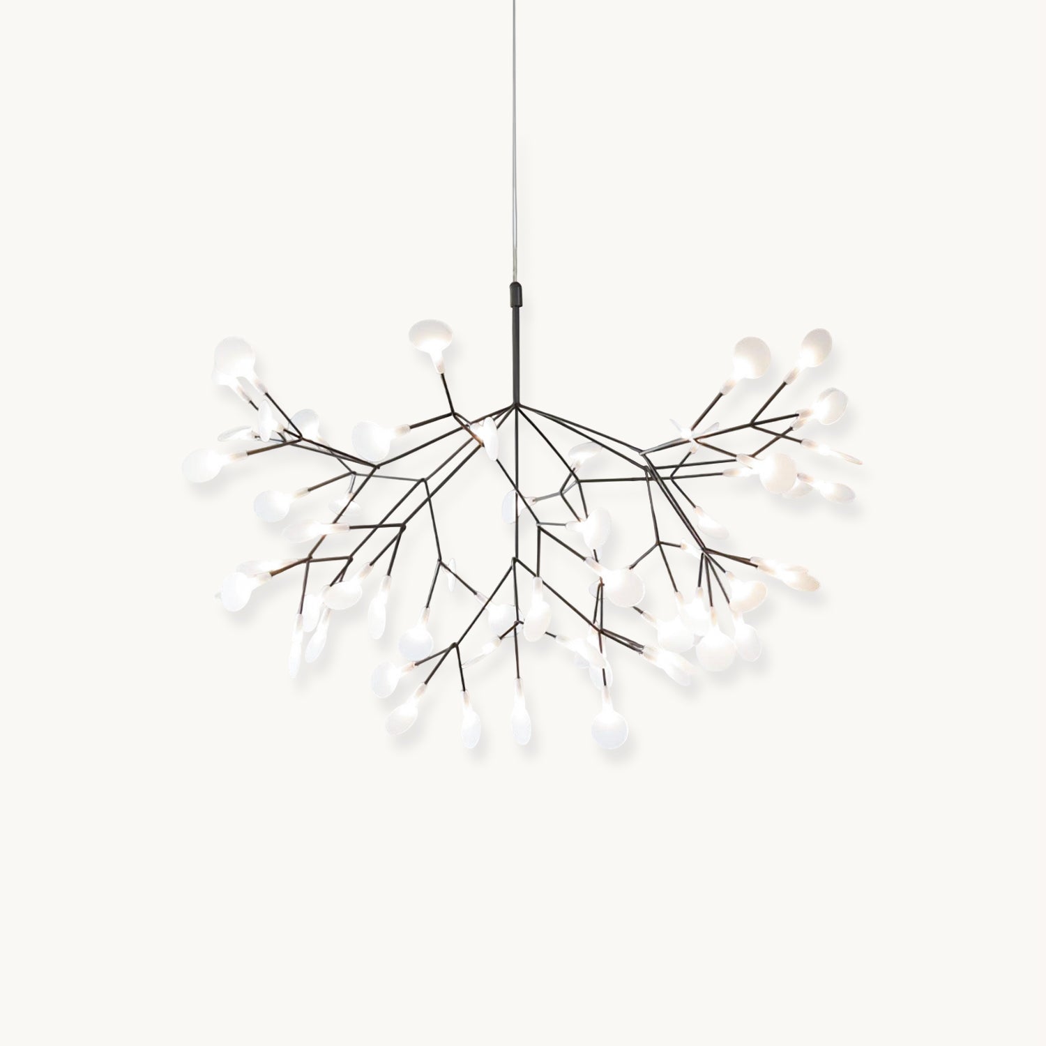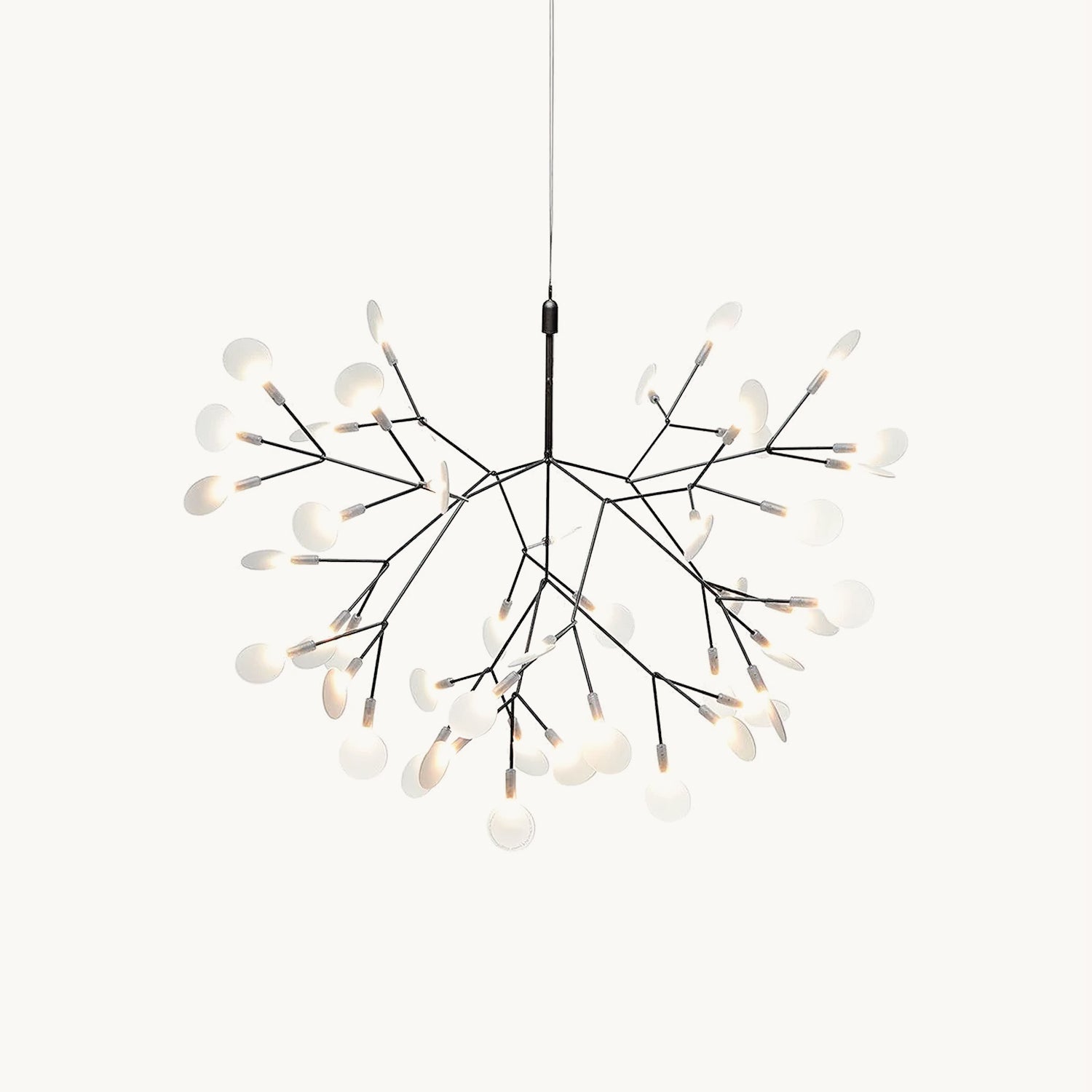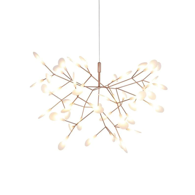 The Firefly LED Chandelier by Mooijane features intricate acrylic petals that form a flower-like shape, casting a bright, firefly-inspired glow. Available in Black and Rose Gold, it offers a unique, customizable design with repositionable leaves. Crafted with a metal wire frame, polycarbonate lenses, and ultra-thin suspension wire, this chandelier brings elegance and warmth to any space.