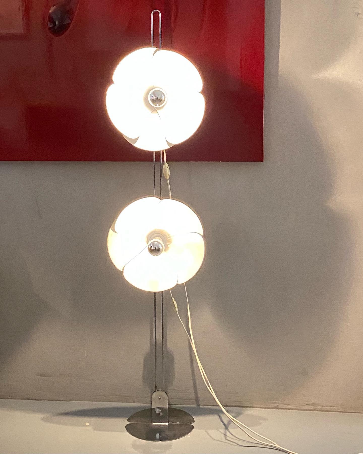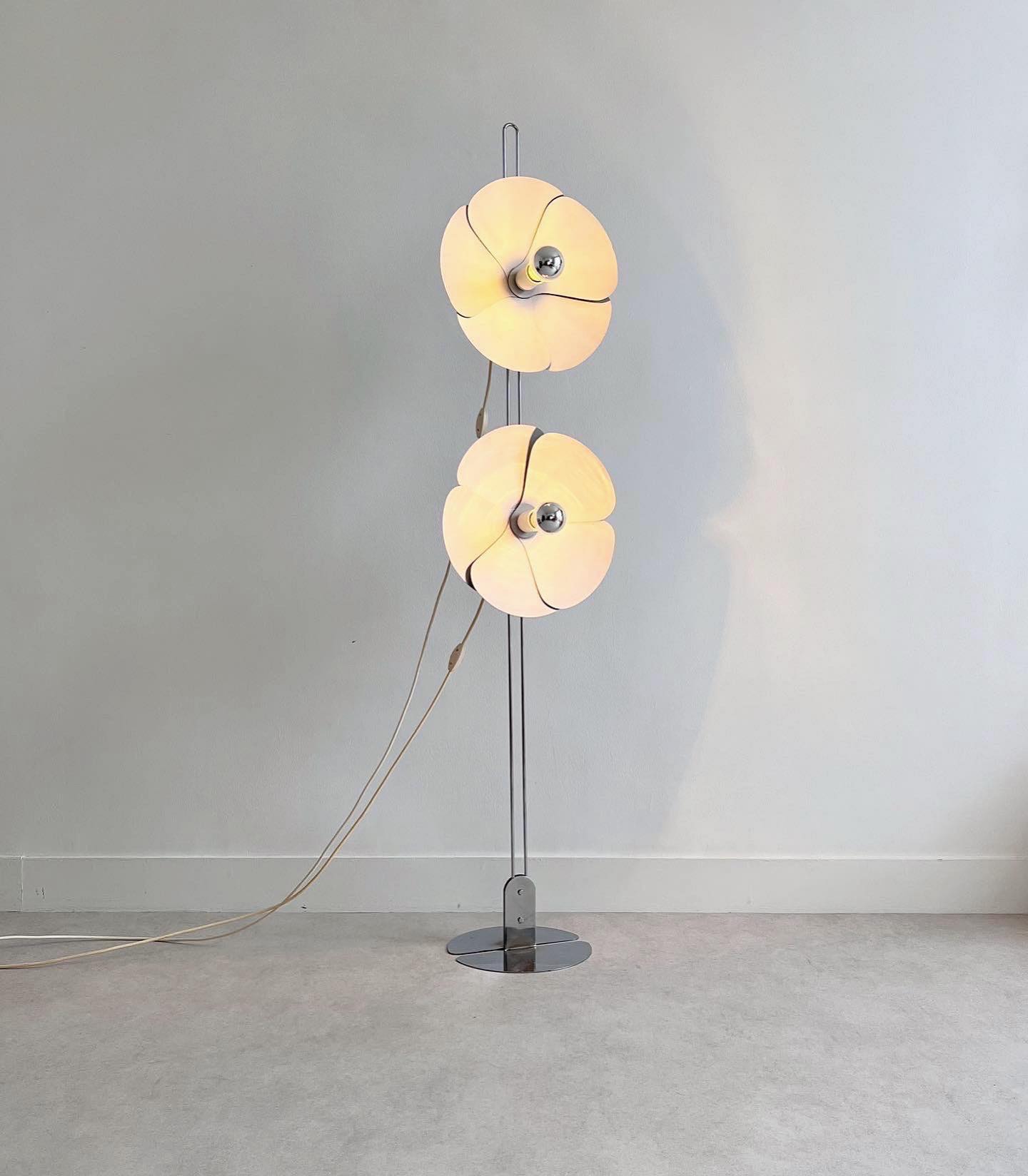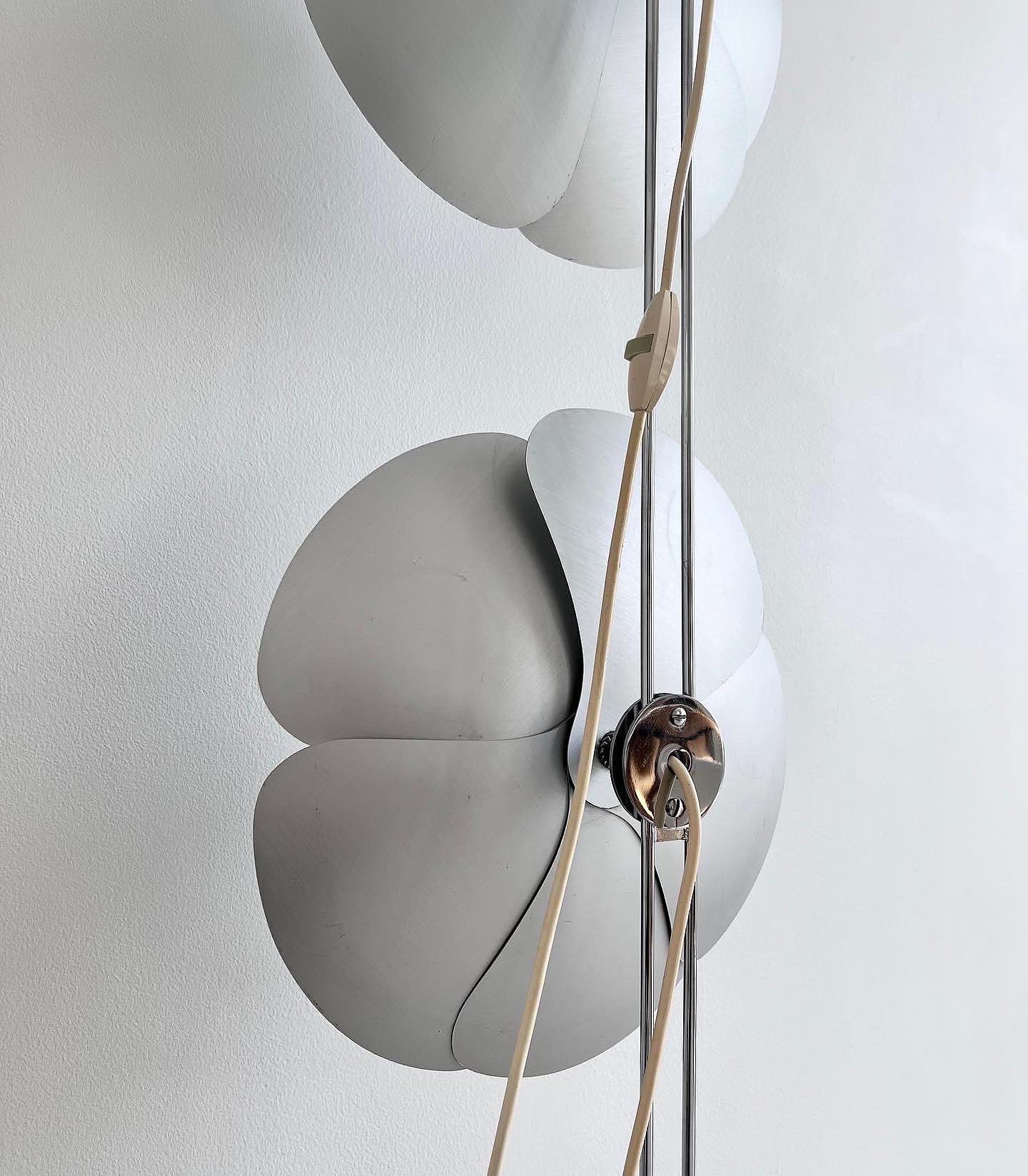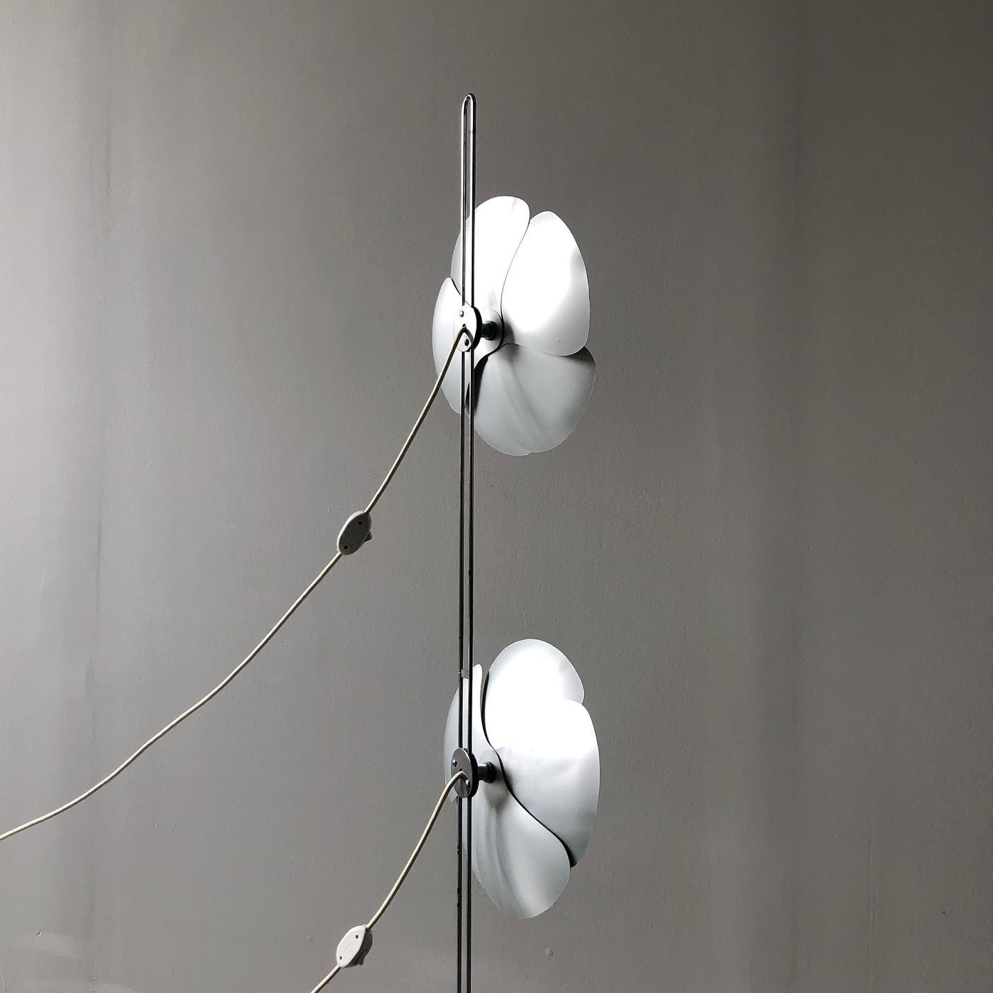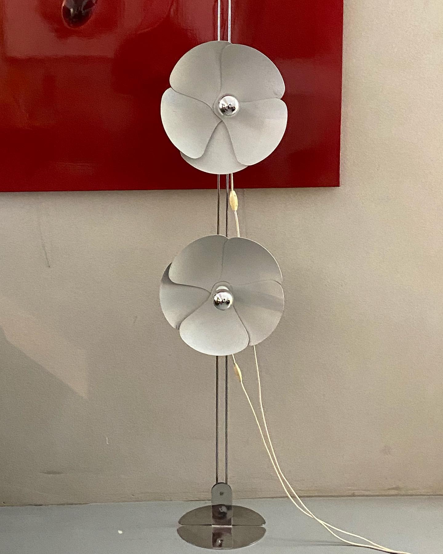 Beautiful flowers Floor lamp, designed In 1967, Our invented a flower-shaped lighting device, made of aluminum petals fixed on two chromed metal wires, He used this silver caped bulb, which was new at the time, and produced very high quality reflected lighting.