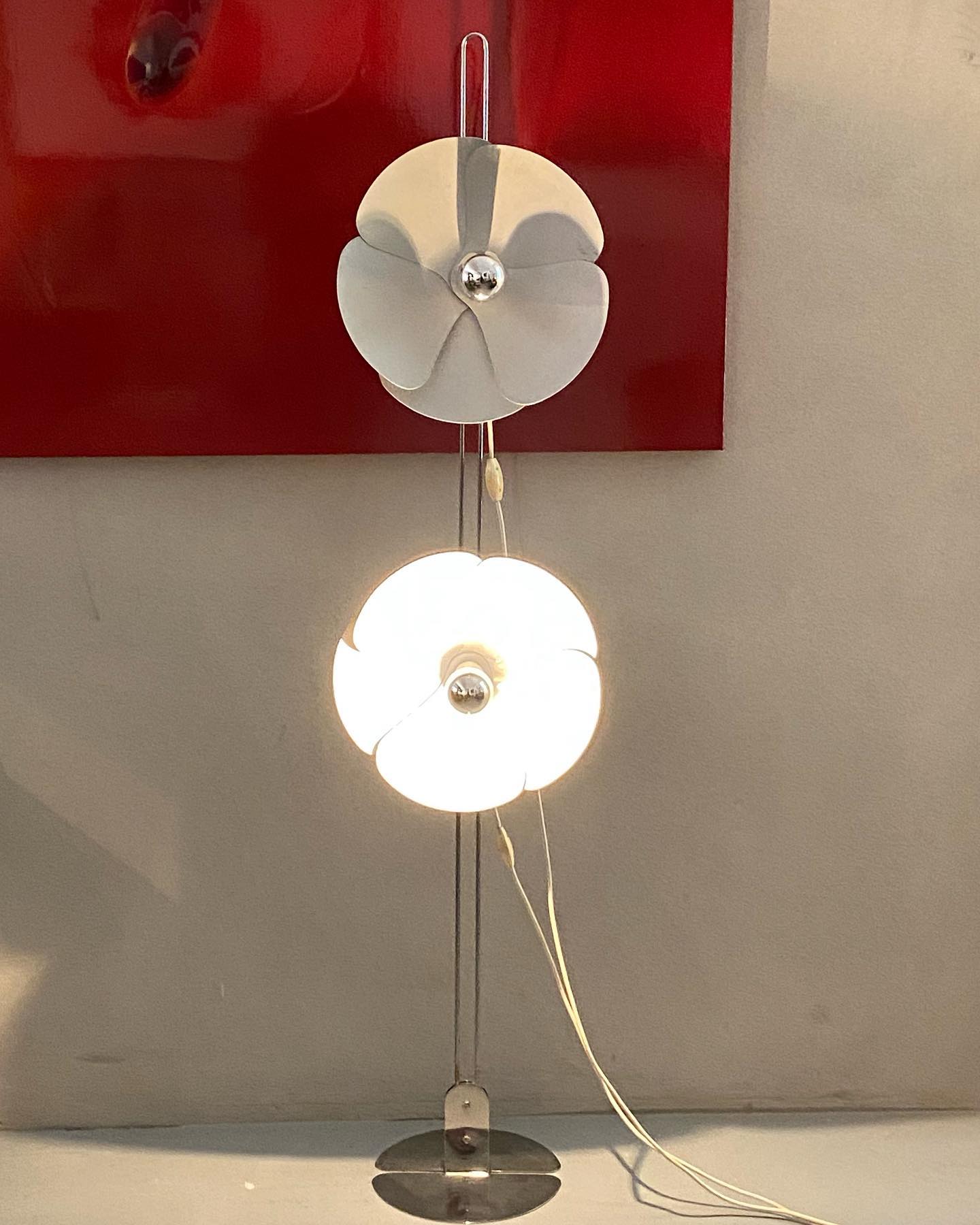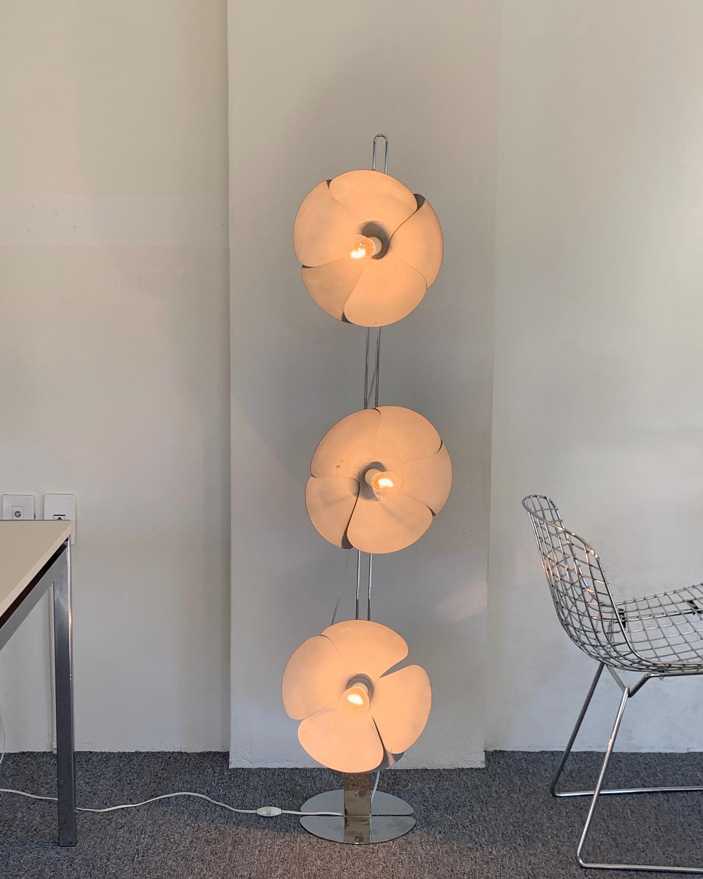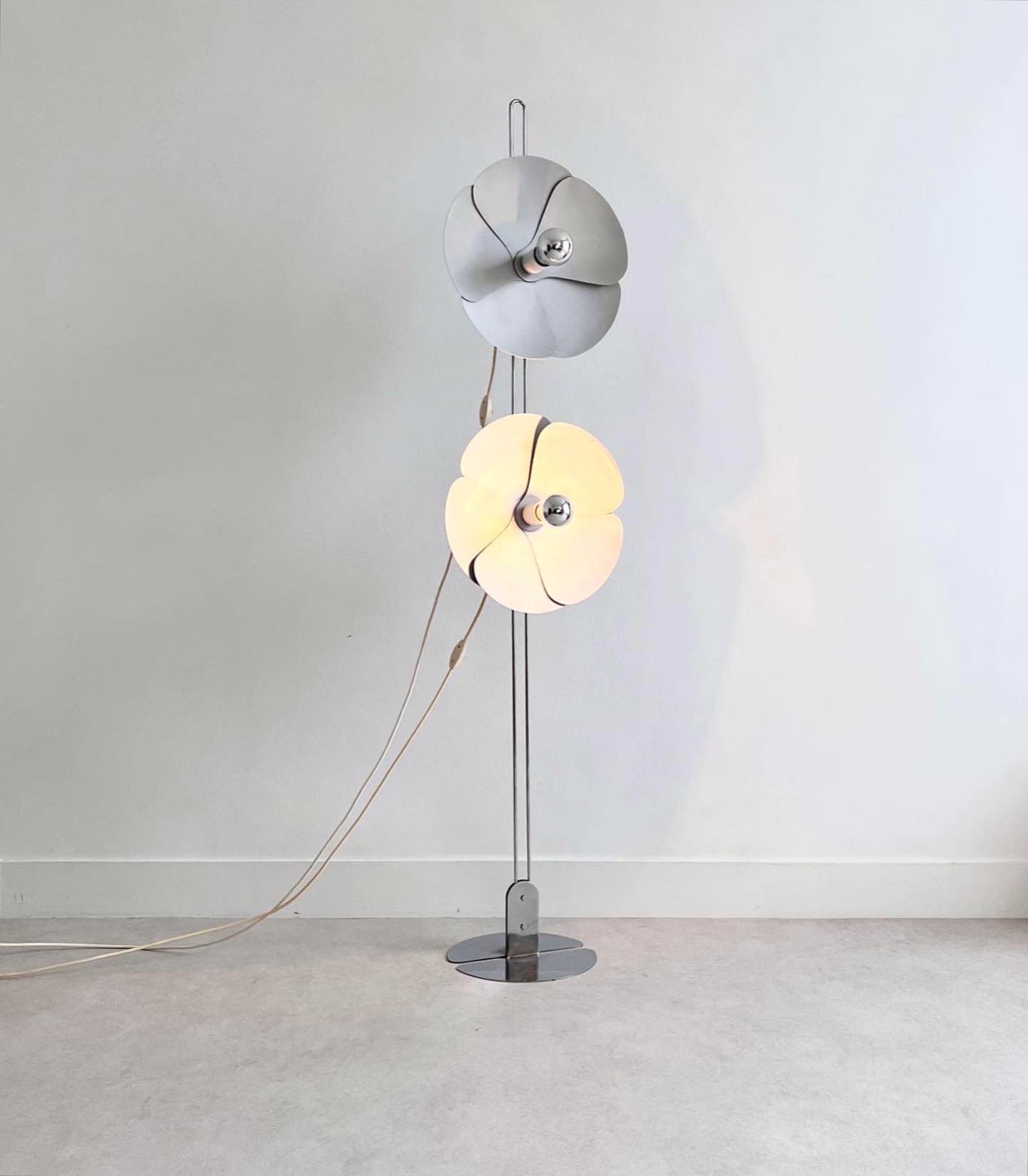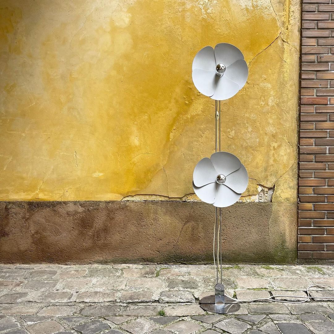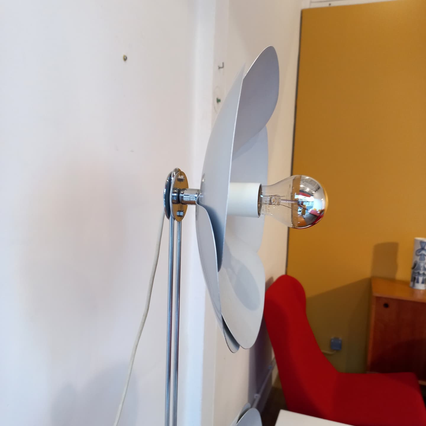 Beautiful flowers Floor lamp, designed In 1967, Our invented a flower-shaped lighting device, made of aluminum petals fixed on two chromed metal wires, He used this silver caped bulb, which was new at the time, and produced very high quality reflected lighting.