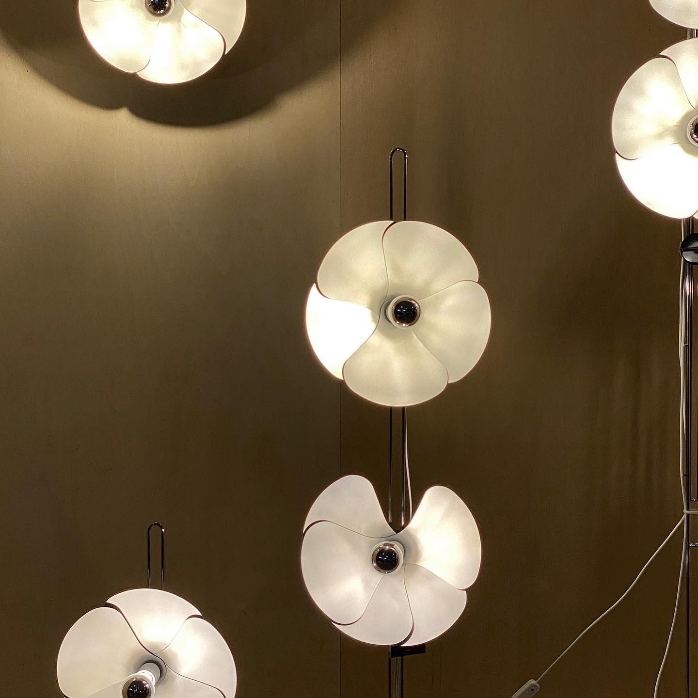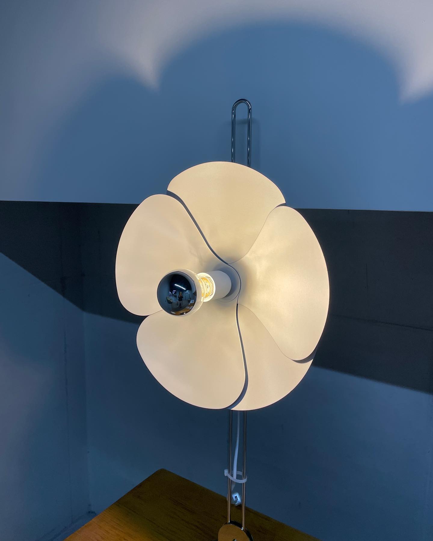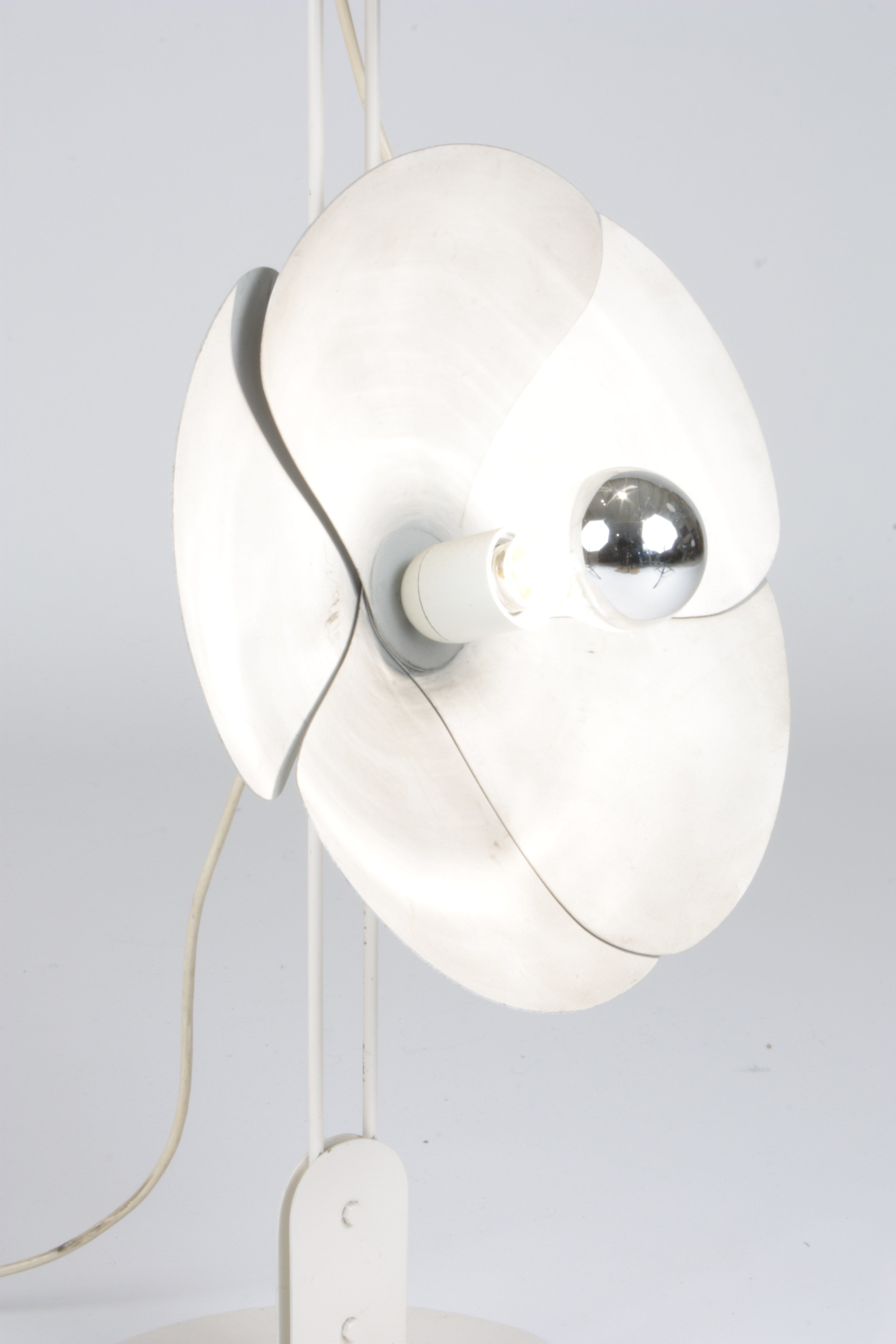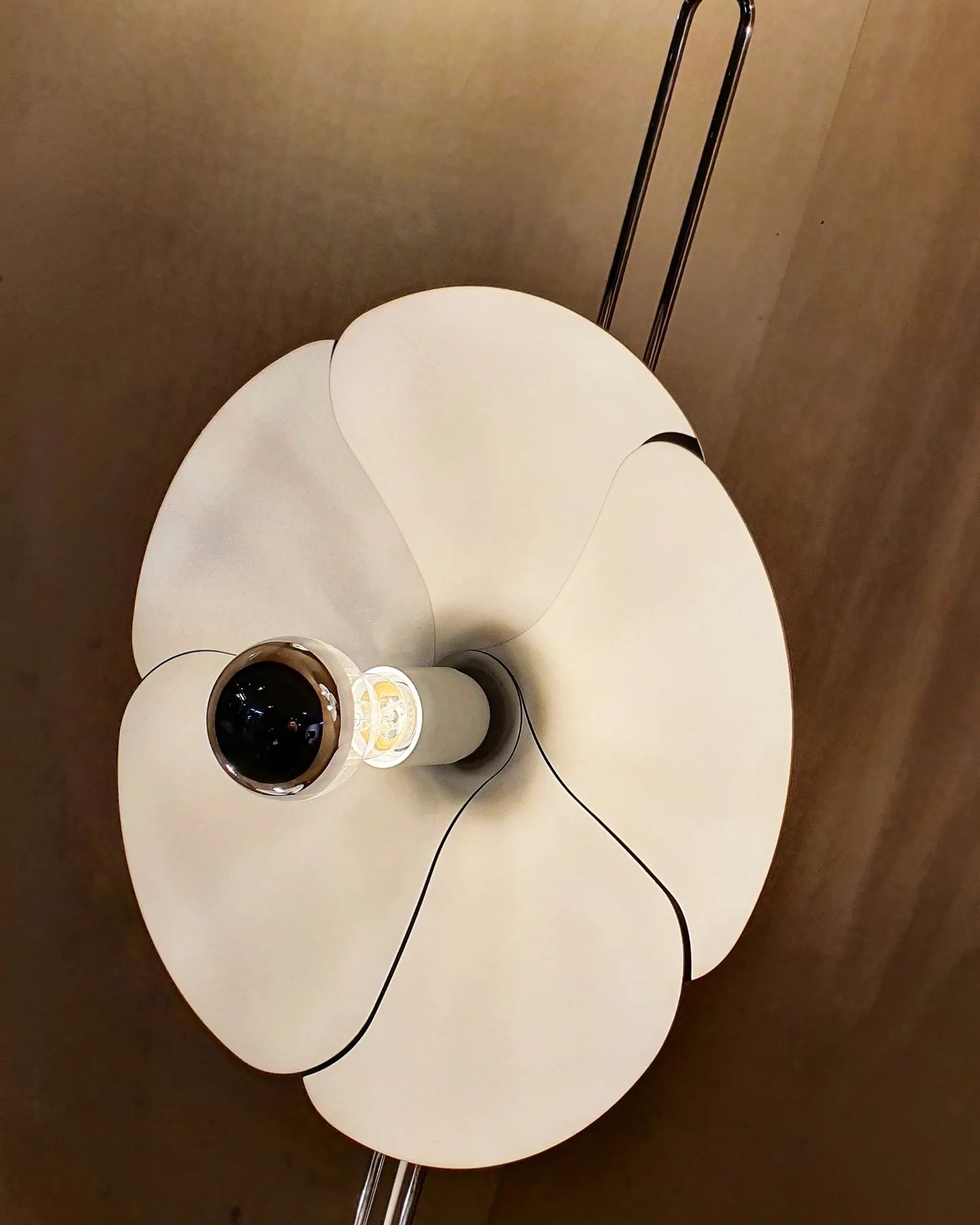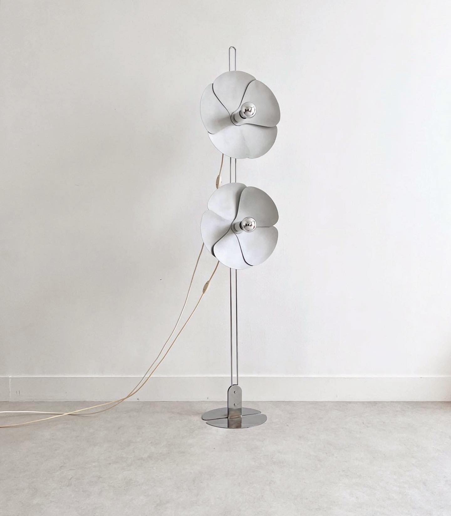 Beautiful flowers Floor lamp, designed In 1967, Our invented a flower-shaped lighting device, made of aluminum petals fixed on two chromed metal wires, He used this silver caped bulb, which was new at the time, and produced very high quality reflected lighting.