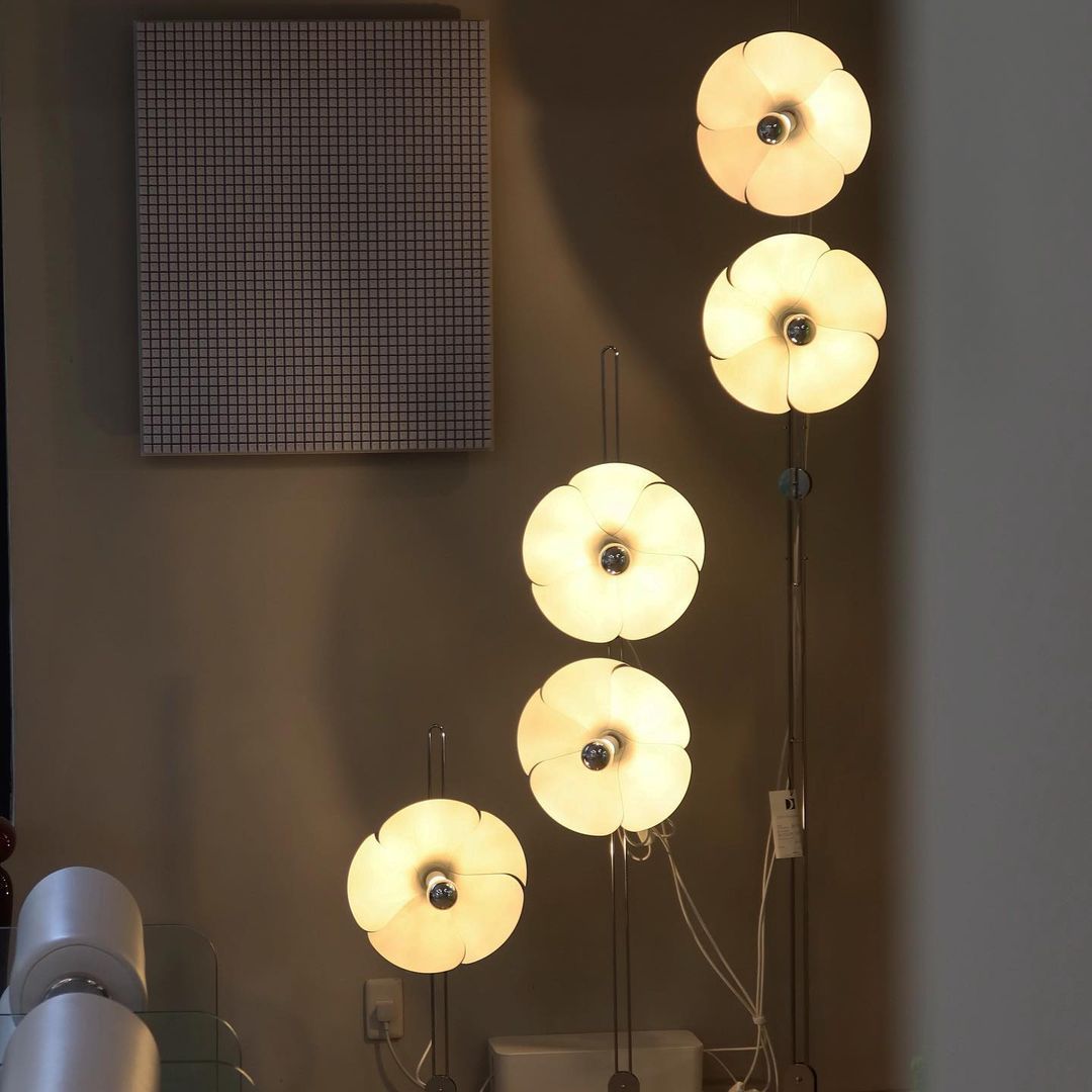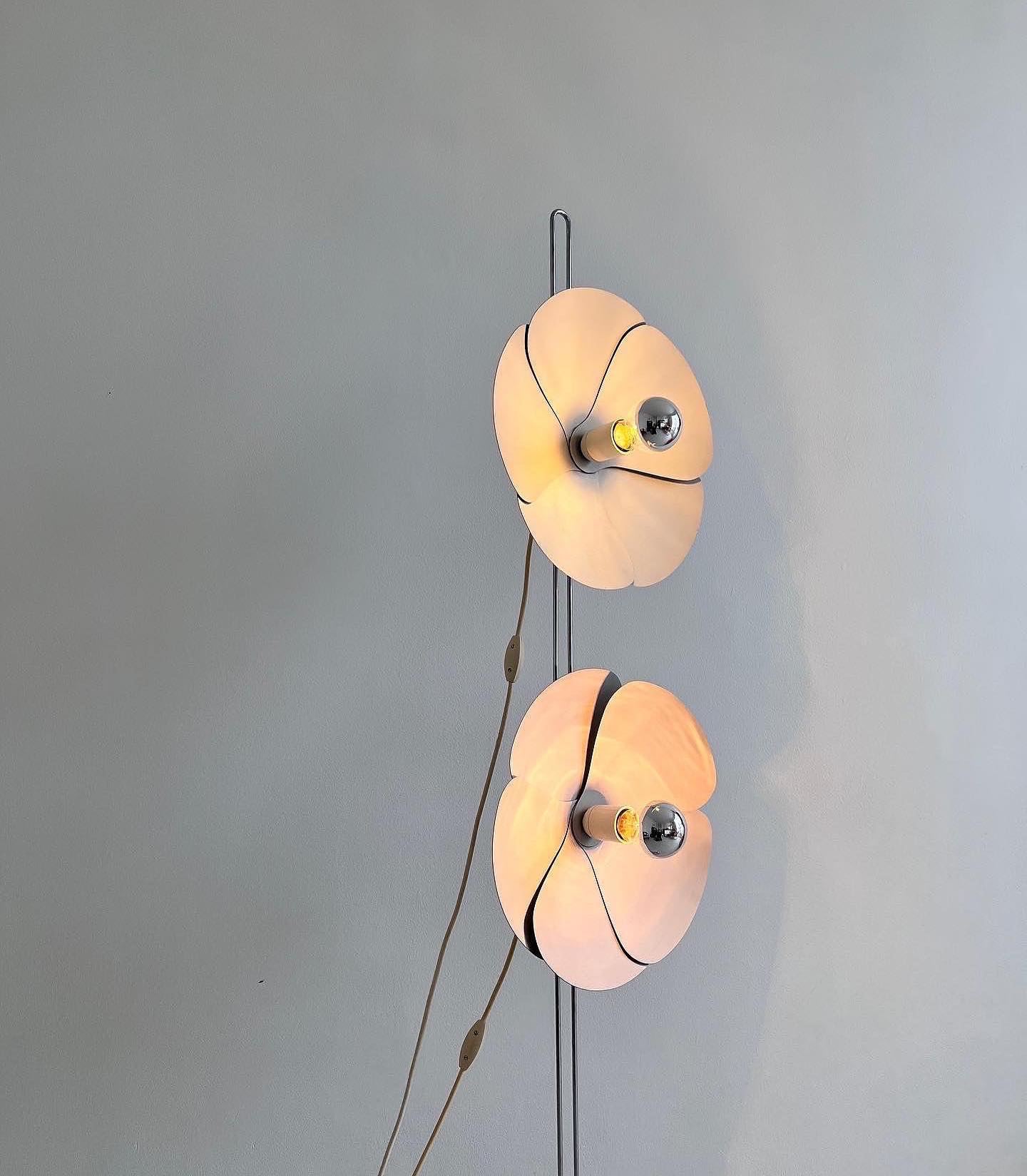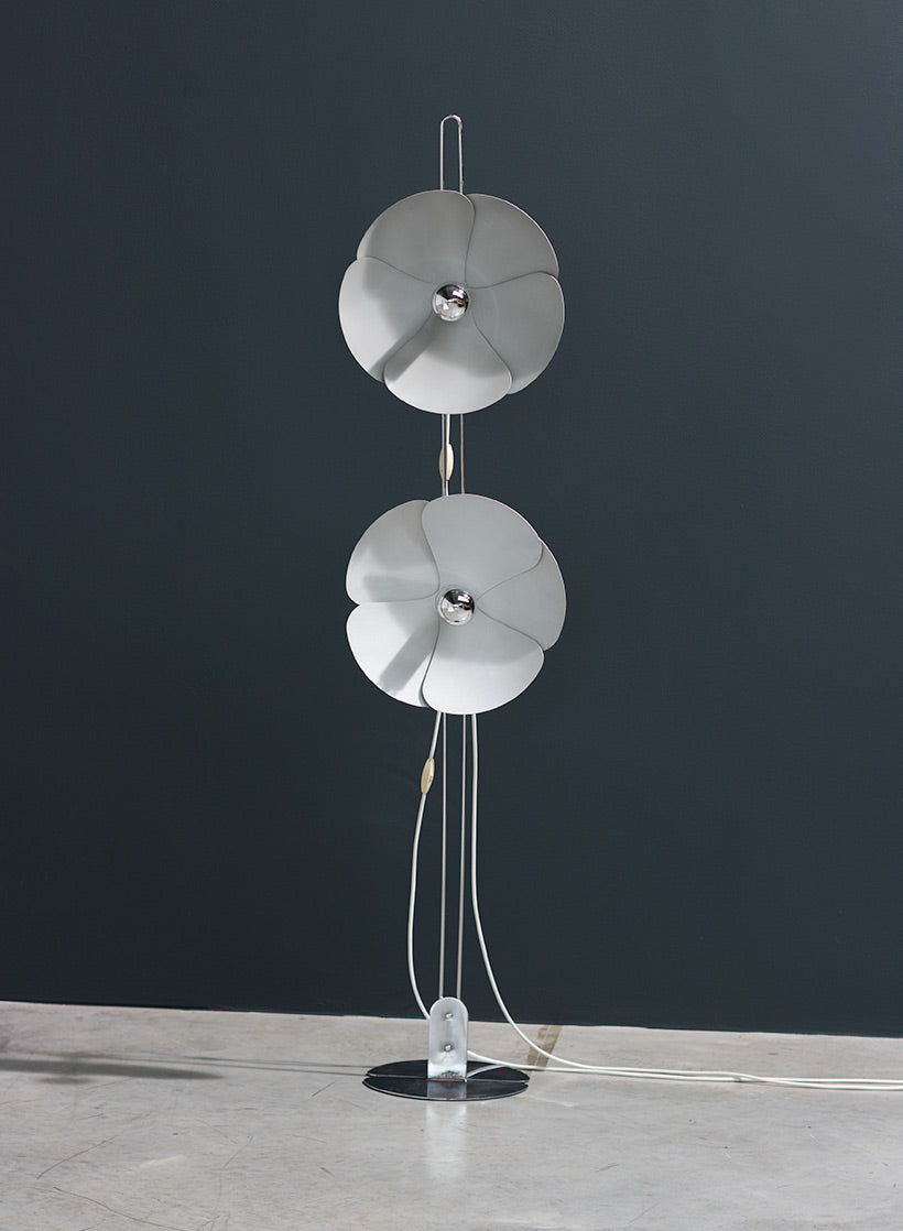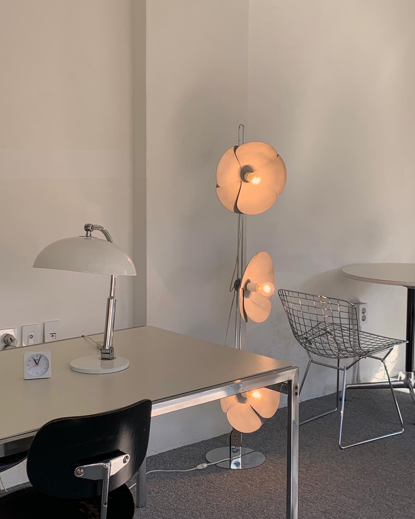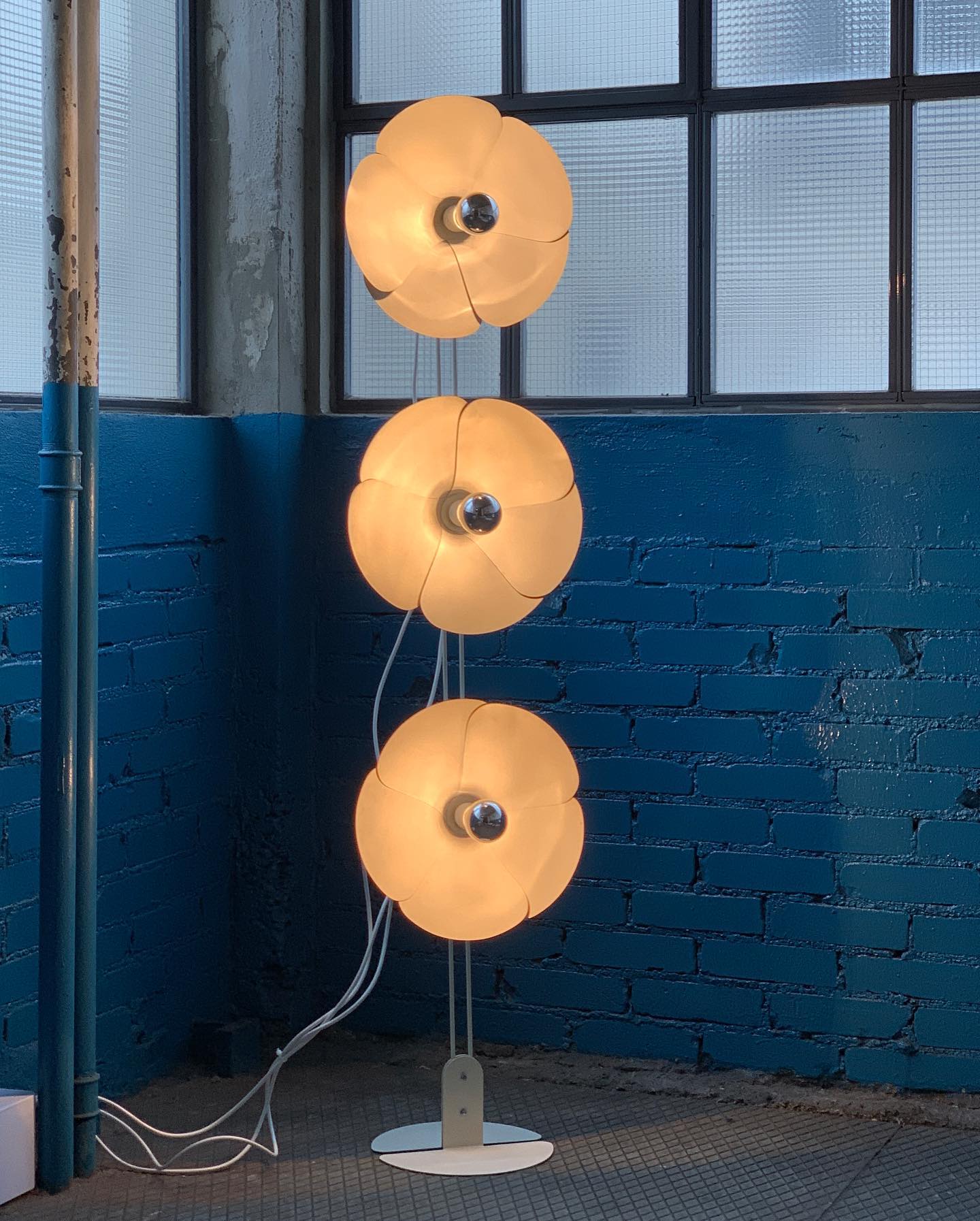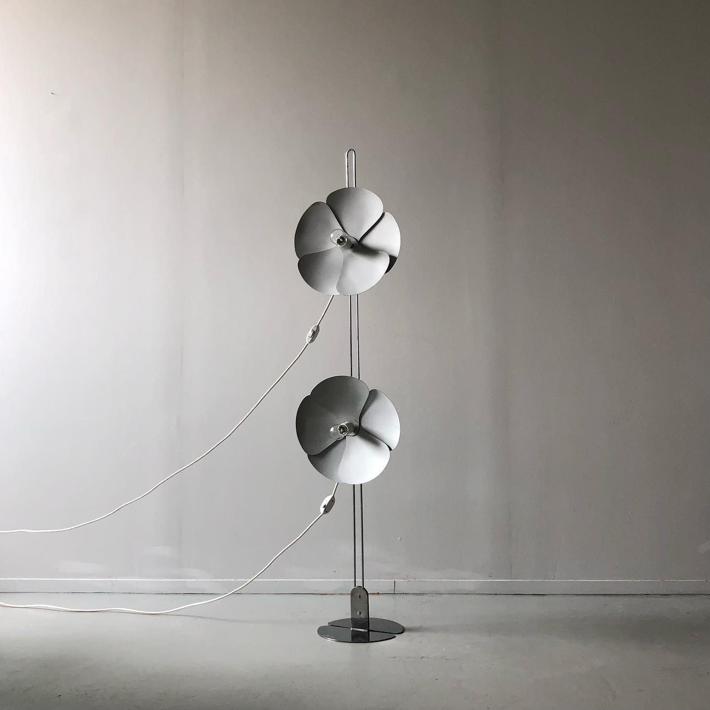 Beautiful flowers Floor lamp, designed In 1967, Our invented a flower-shaped lighting device, made of aluminum petals fixed on two chromed metal wires, He used this silver caped bulb, which was new at the time, and produced very high quality reflected lighting.