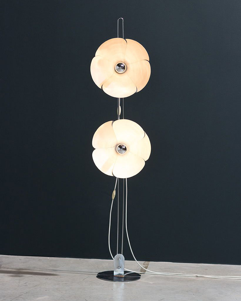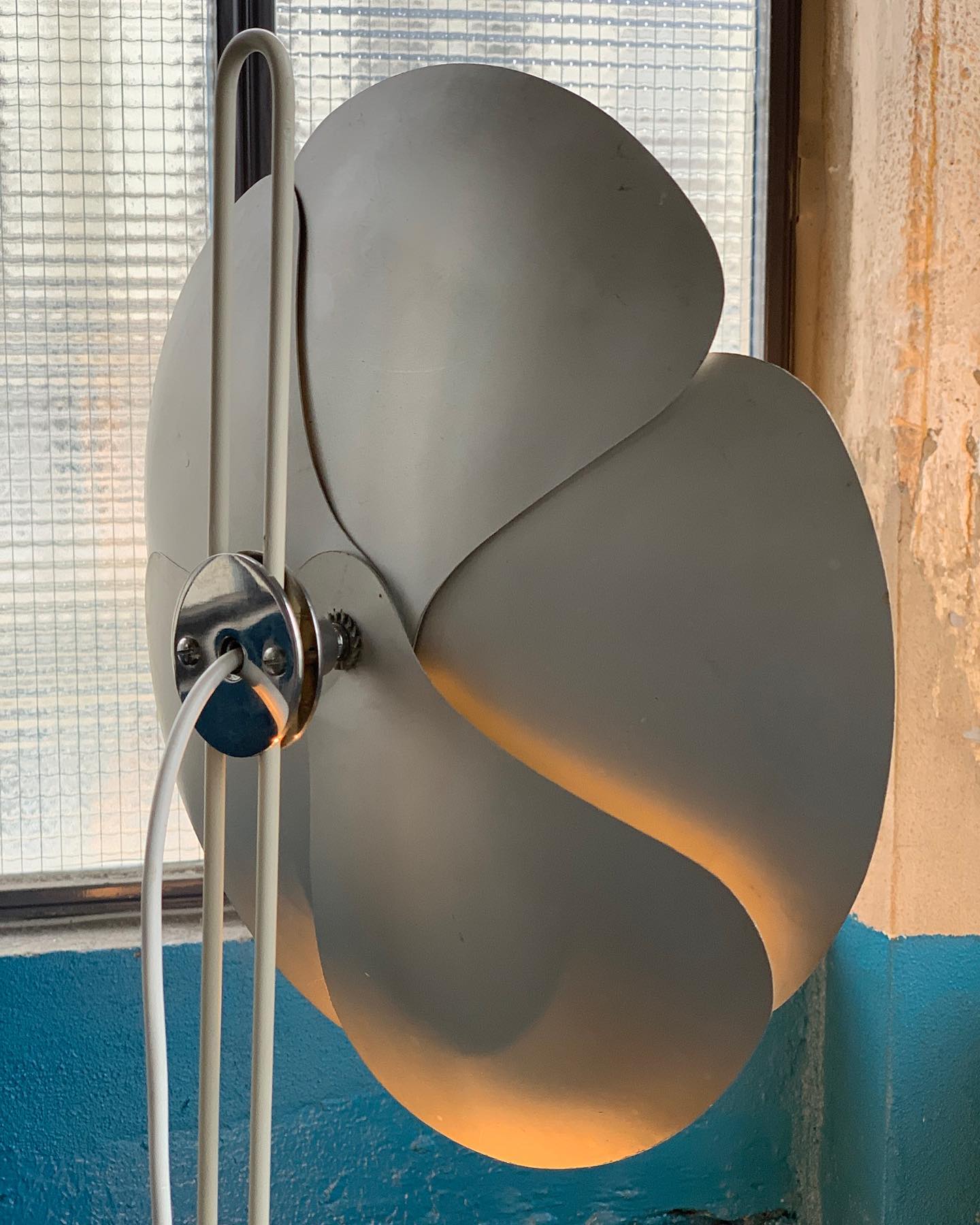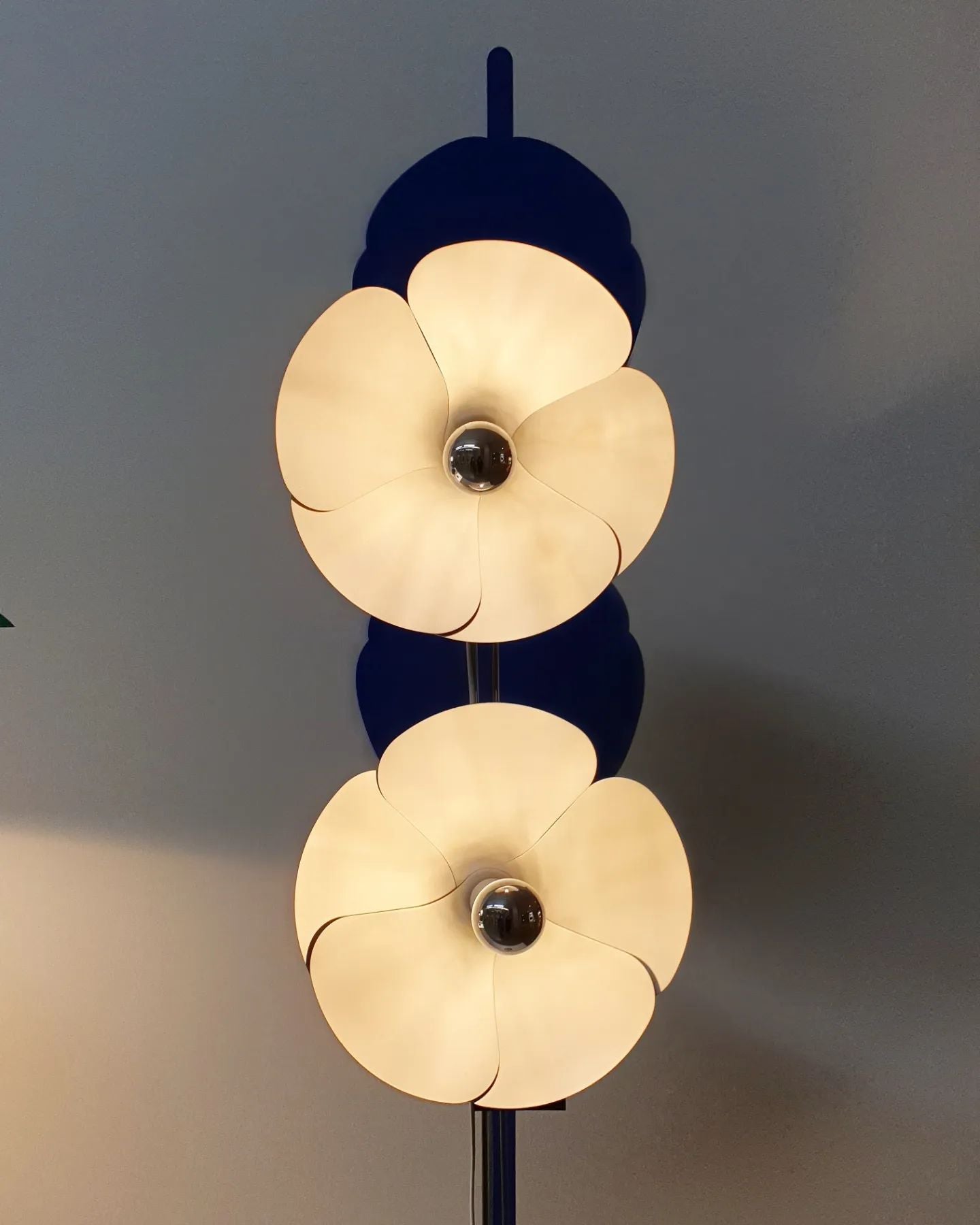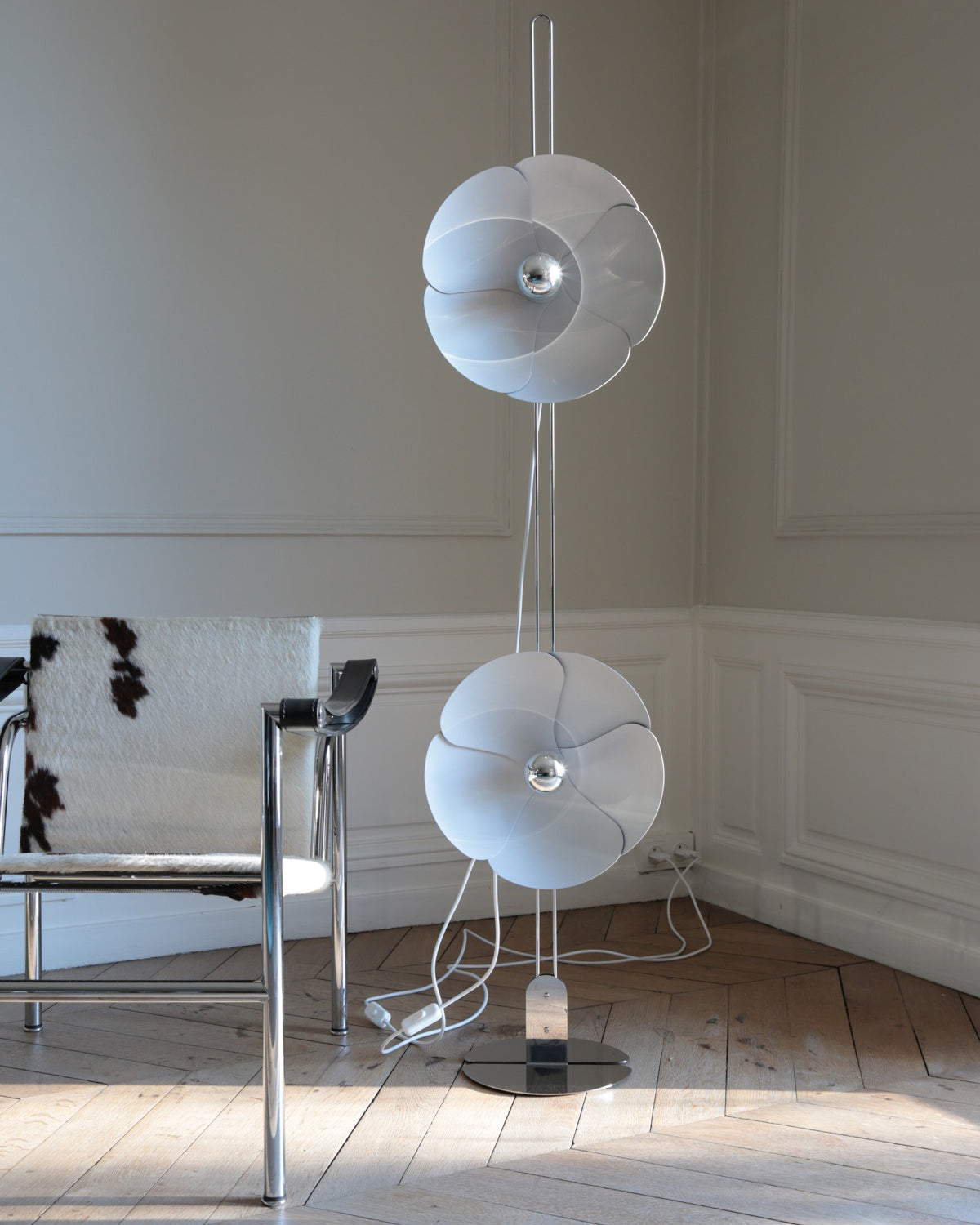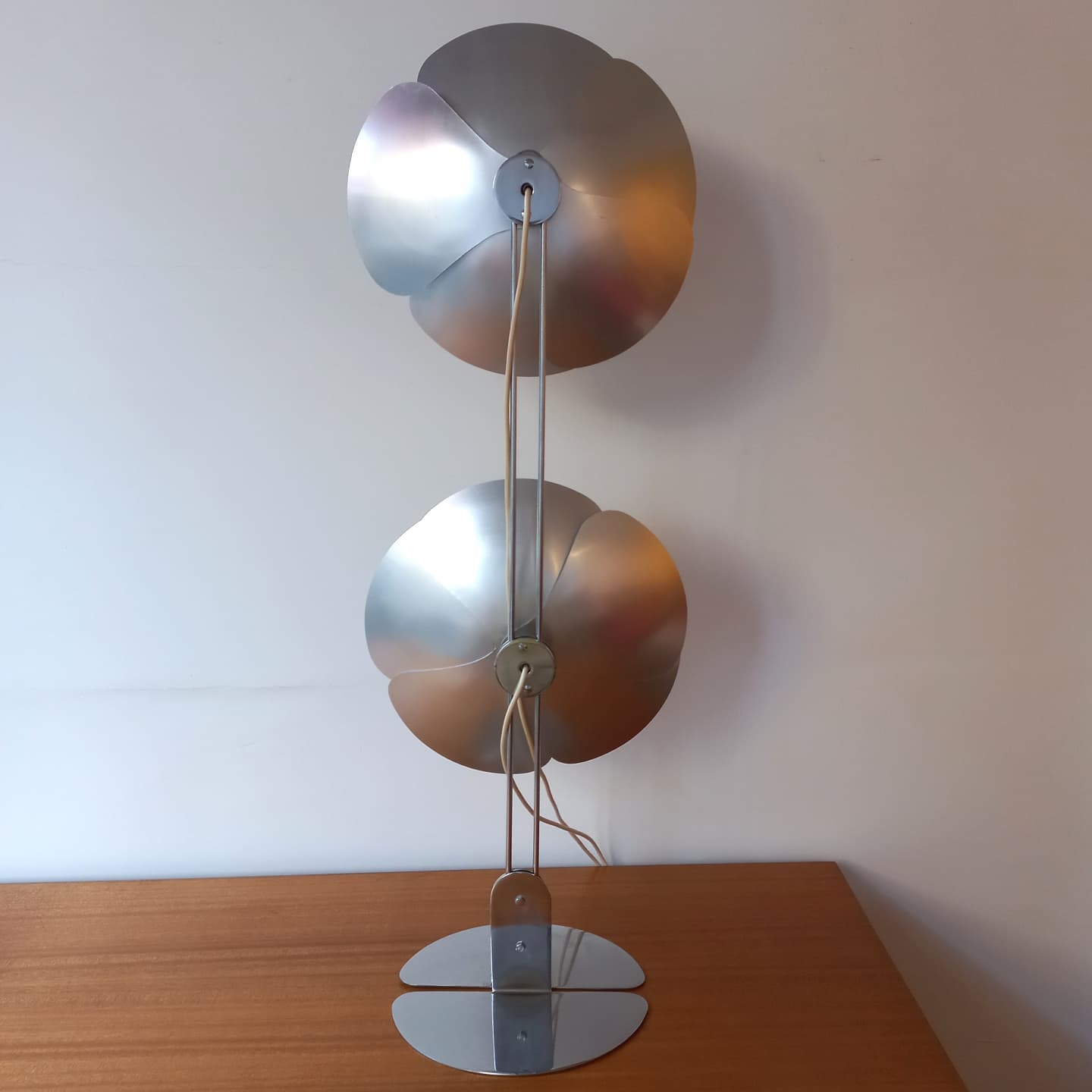 Beautiful flowers Floor lamp, designed In 1967, Our invented a flower-shaped lighting device, made of aluminum petals fixed on two chromed metal wires, He used this silver caped bulb, which was new at the time, and produced very high quality reflected lighting.