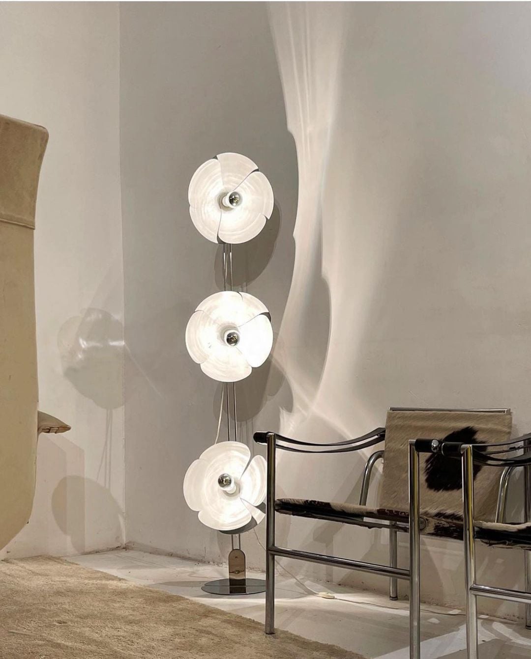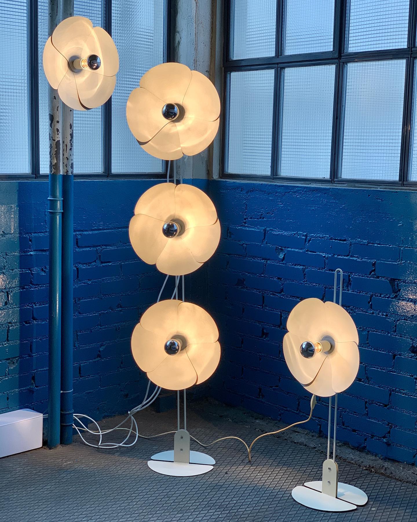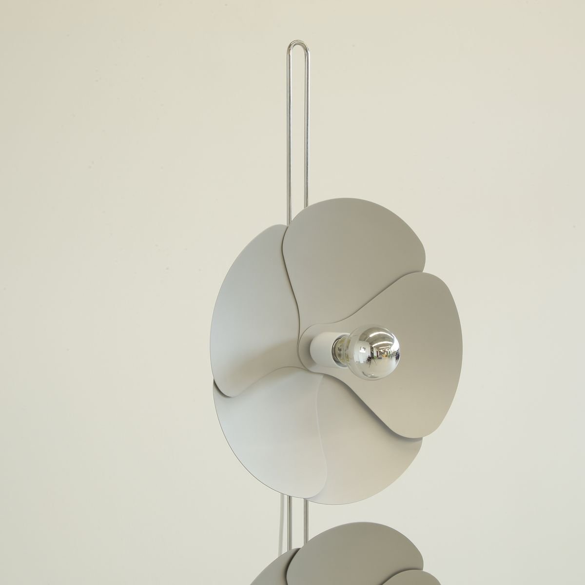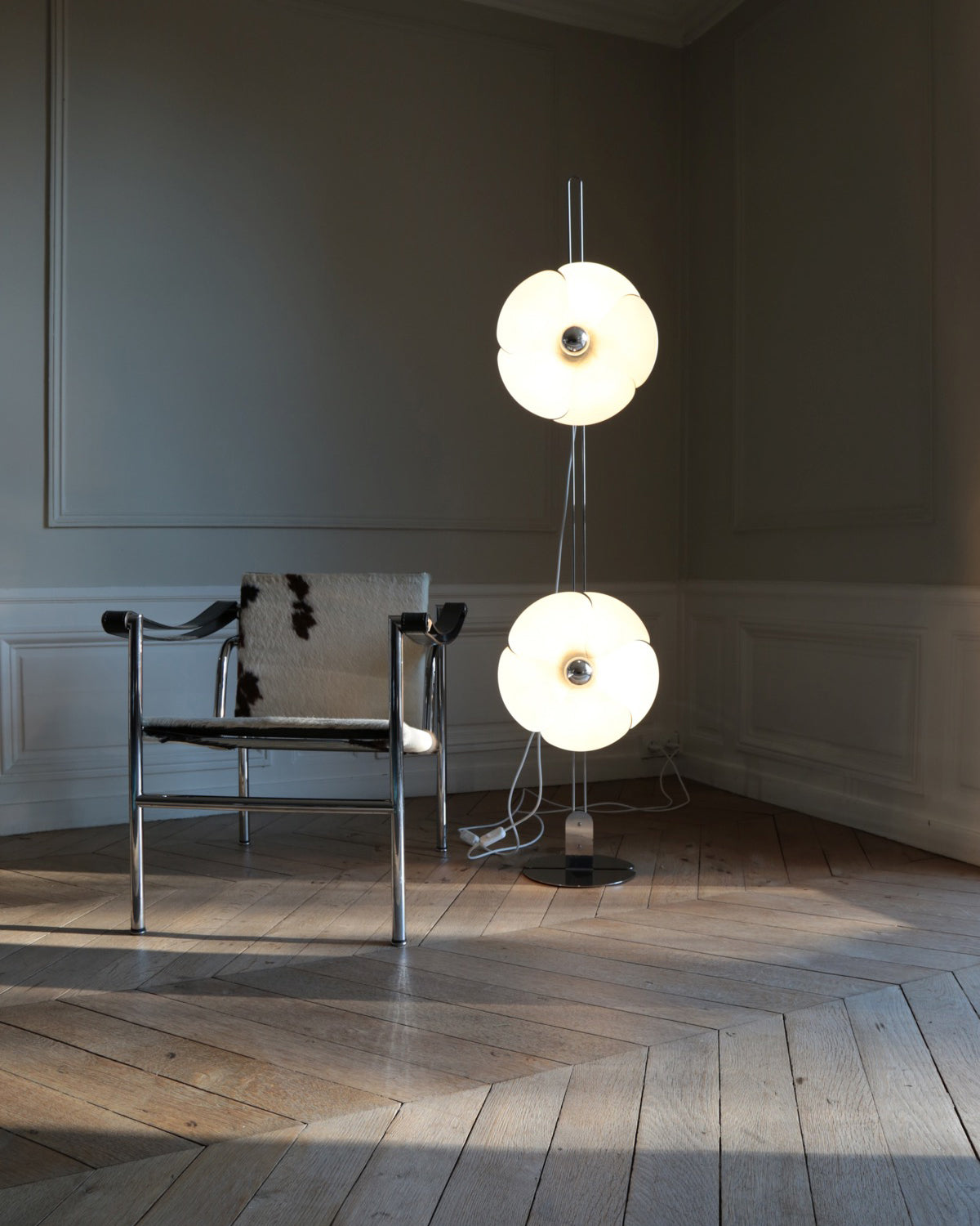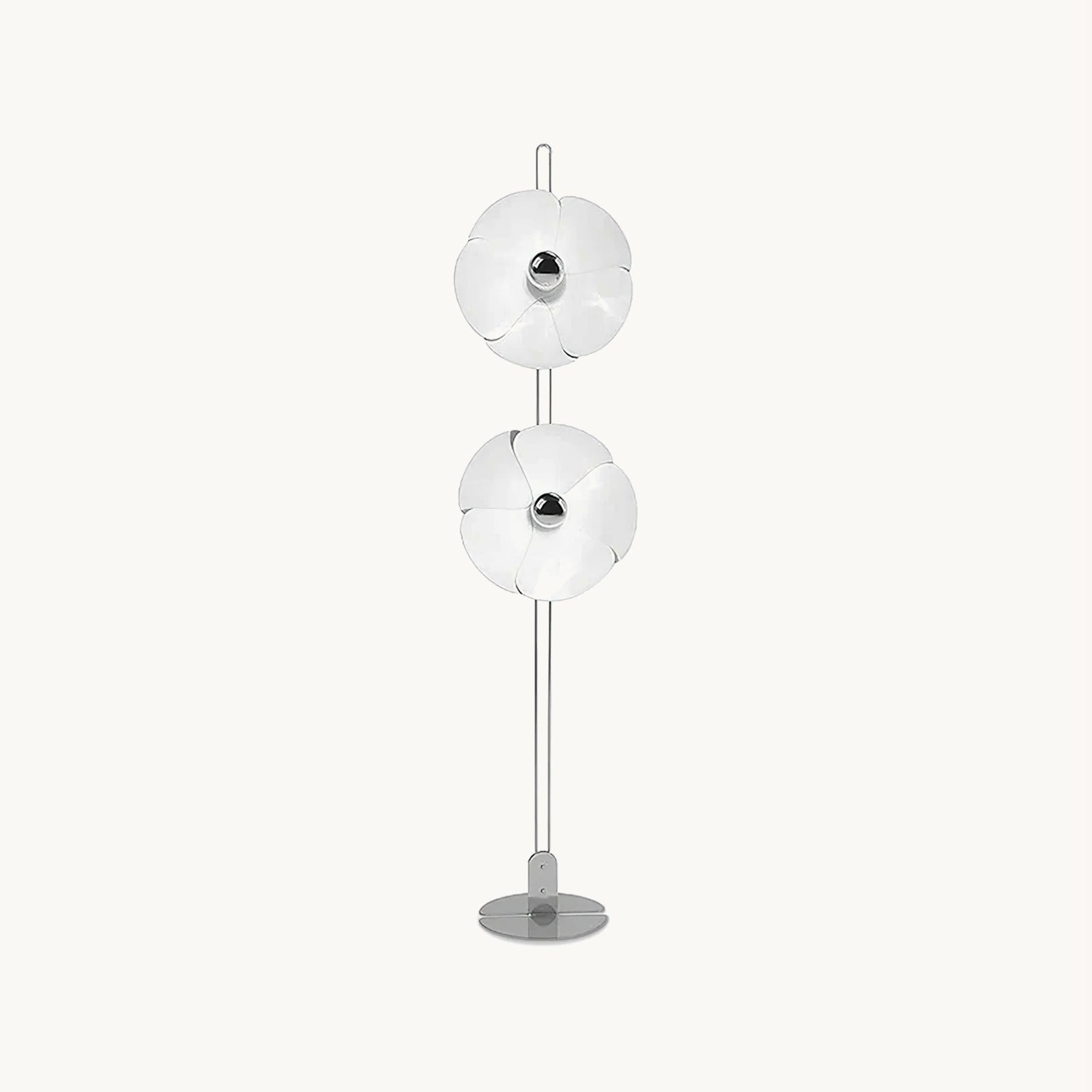 Beautiful flowers Floor lamp, designed In 1967, Our invented a flower-shaped lighting device, made of aluminum petals fixed on two chromed metal wires, He used this silver caped bulb, which was new at the time, and produced very high quality reflected lighting.