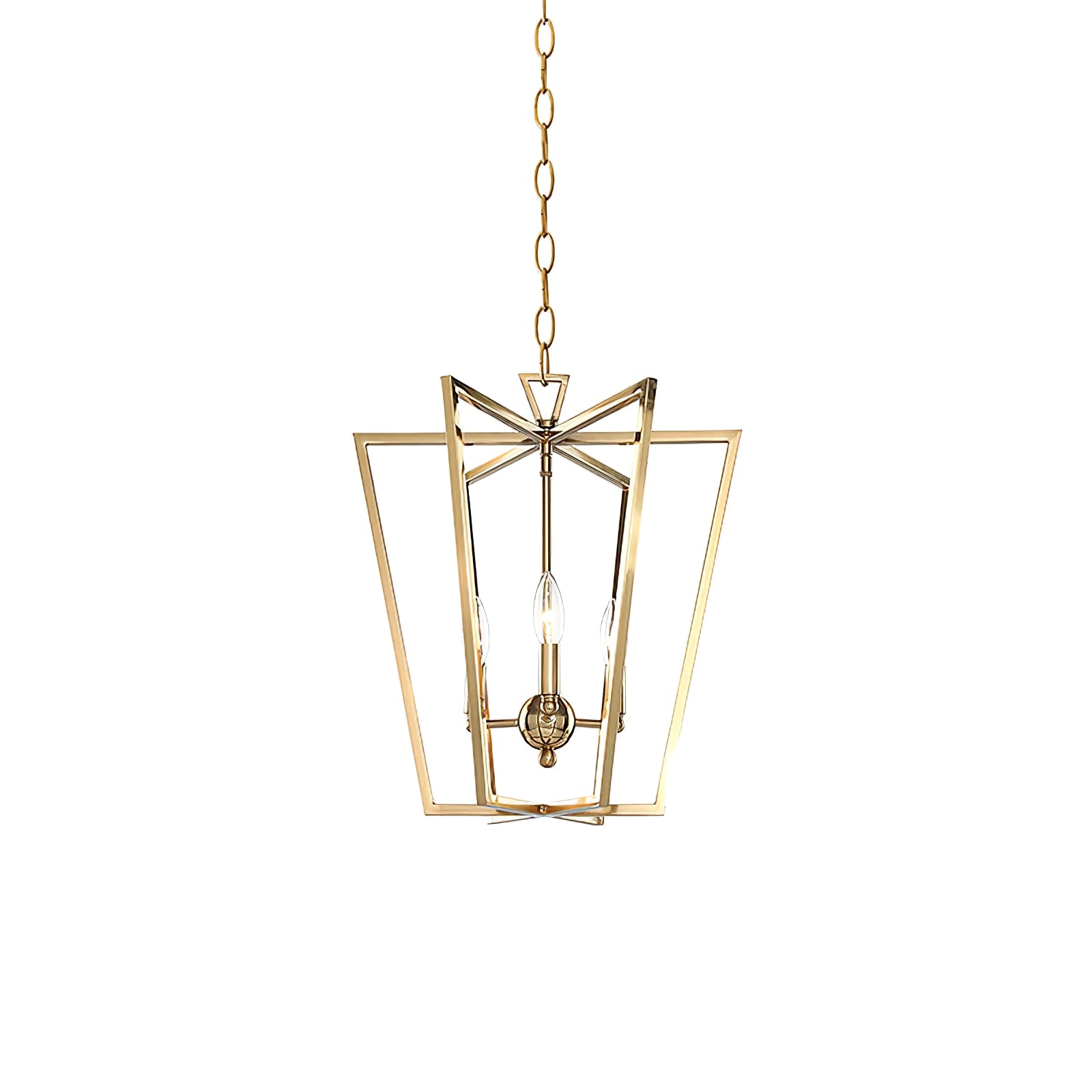 Elevate your home decor with this captivating Mid-Century Modern 3-Light Lantern Frame gold cage chandelier. Merging vintage candelabra elements with modern design, this chandelier offers a timeless, yet functional, statement piece. Its elegant gold finish enhances any room, from dining spaces to living rooms, providing soft, sophisticated lighting with its three candelabra-style bulbs. Perfect for adding a touch of charm to foyers, patios, porches, and bedrooms.