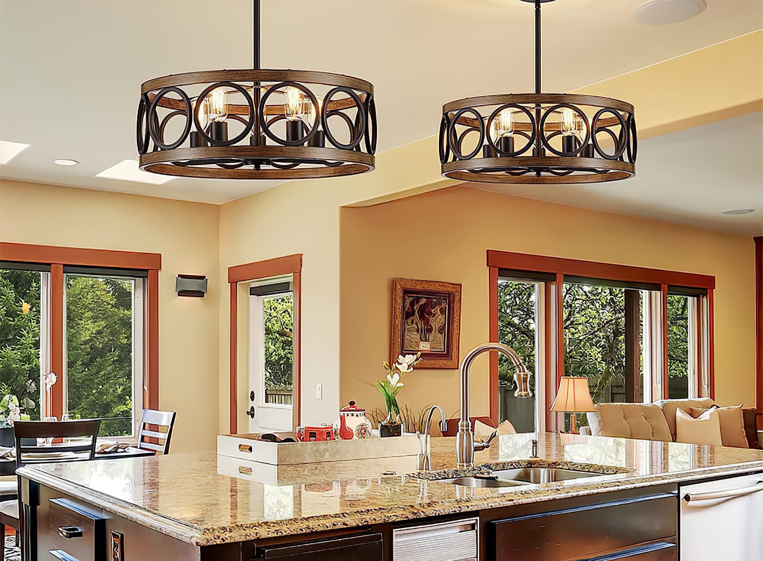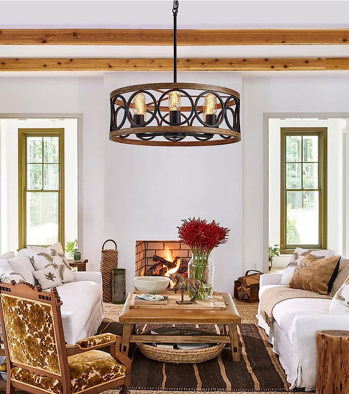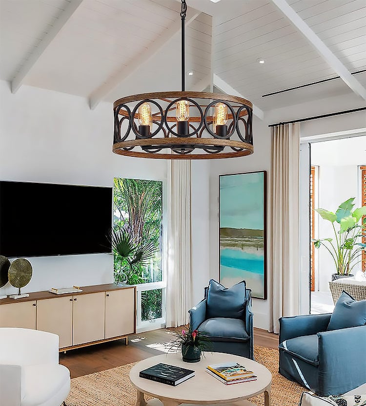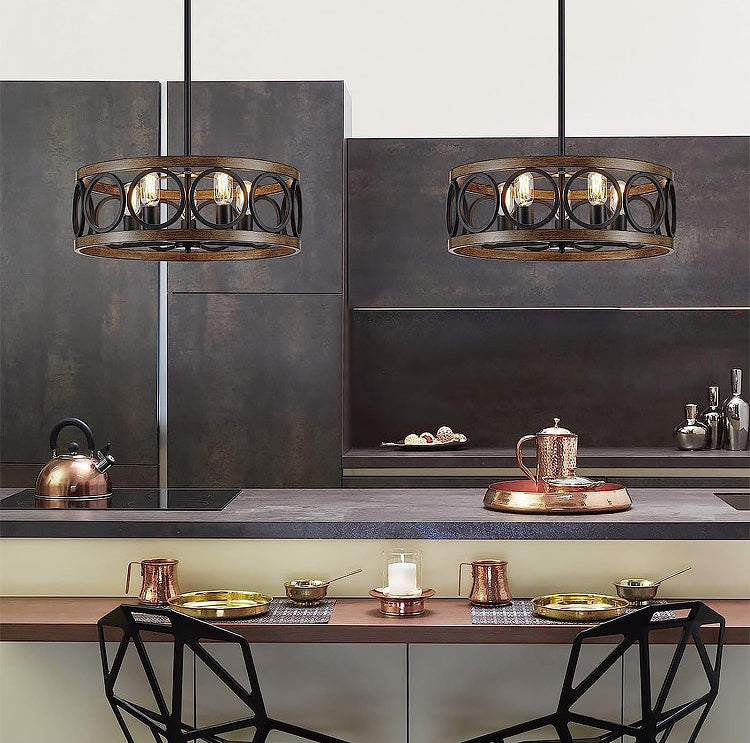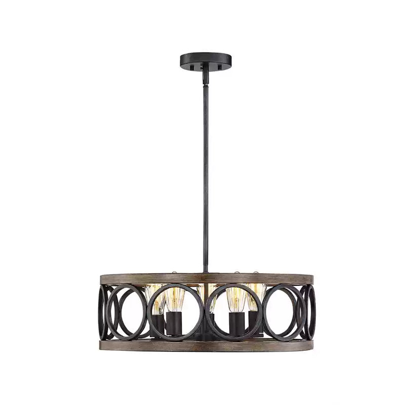 Transform your space with our Franklin Bronze Vintage Wood Drum Chandelier. The unique open drum design, with antique wood grain and sleek black finish, exudes modern rustic appeal. Crafted from durable metal, this chandelier adds lasting beauty and style to any decor.