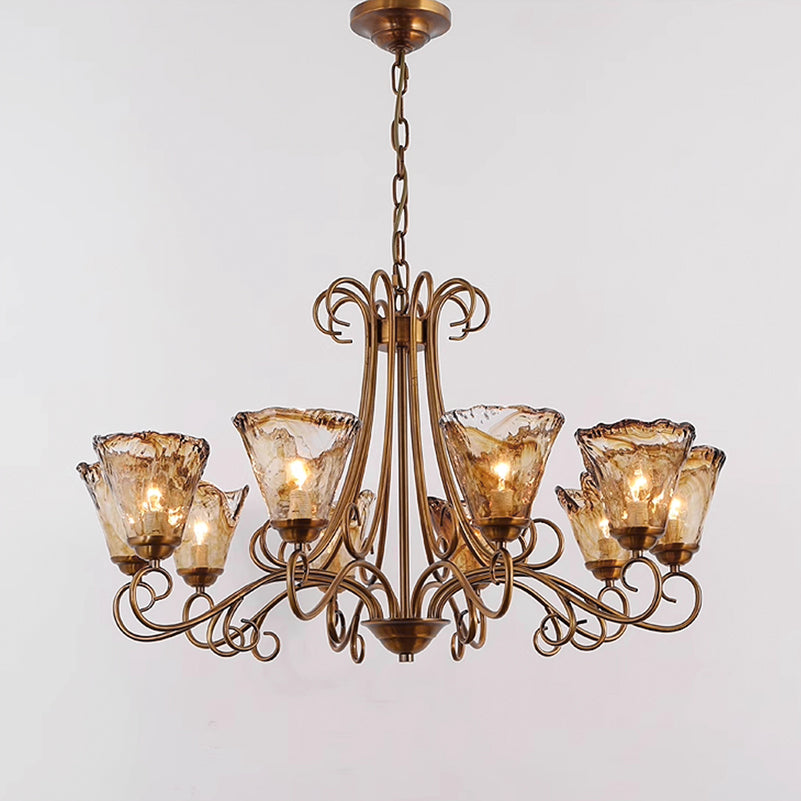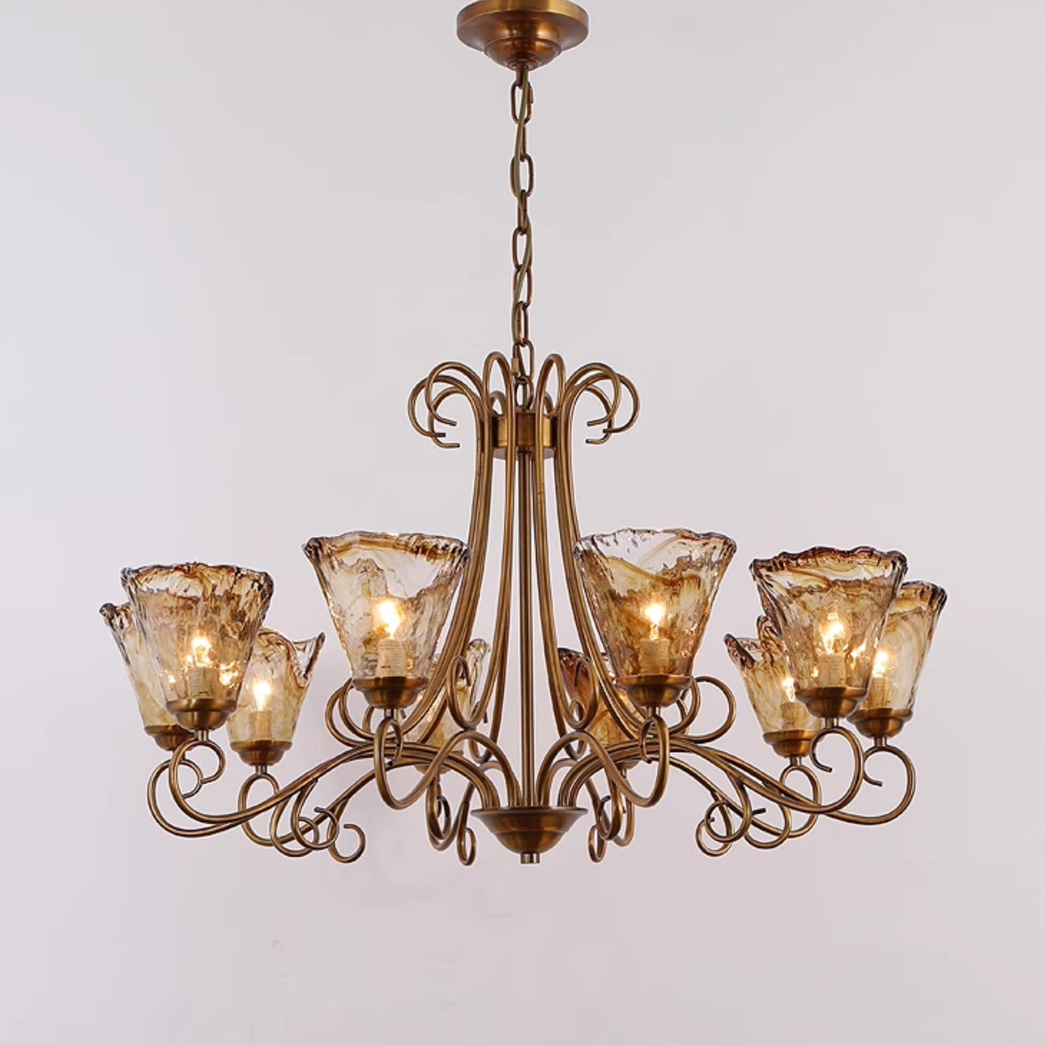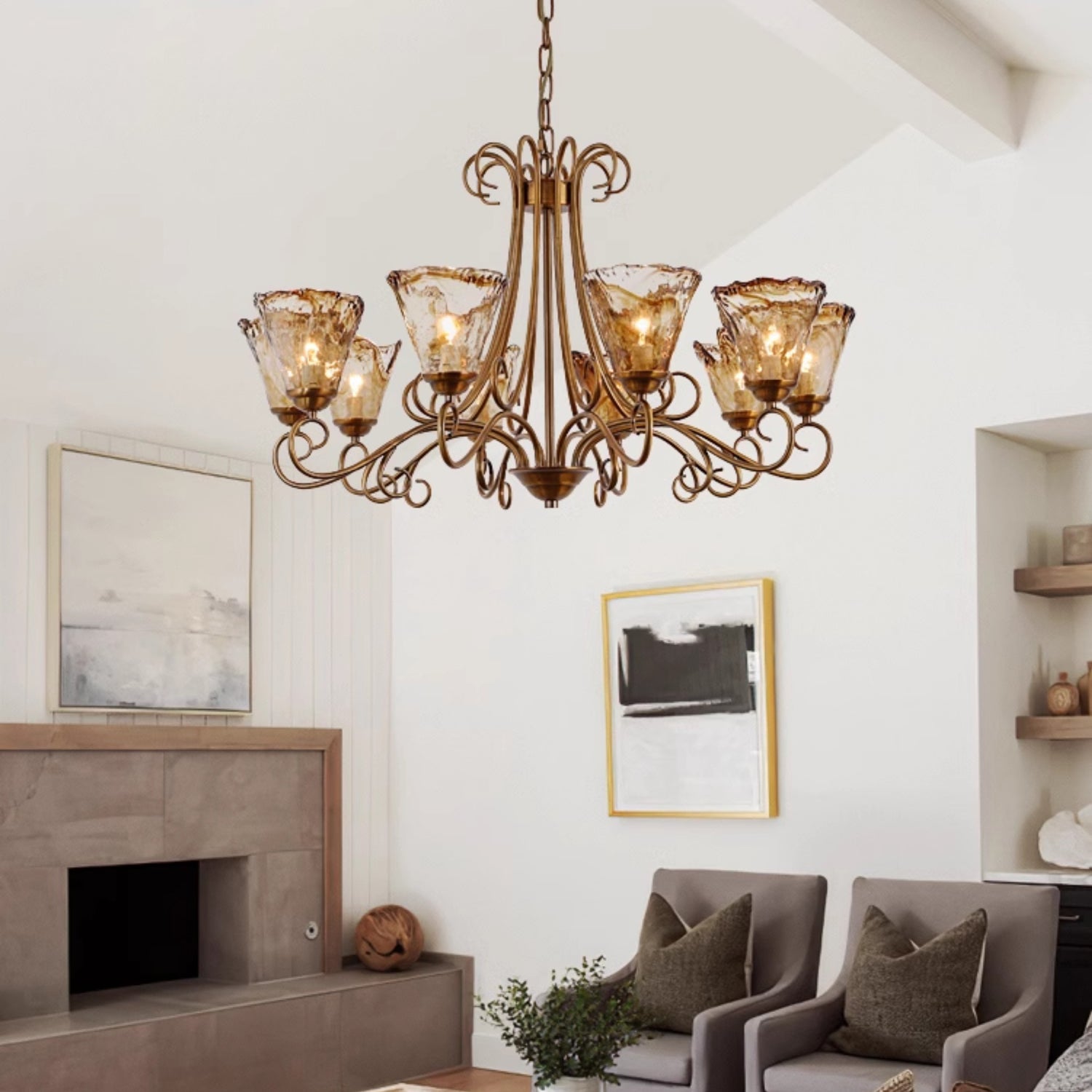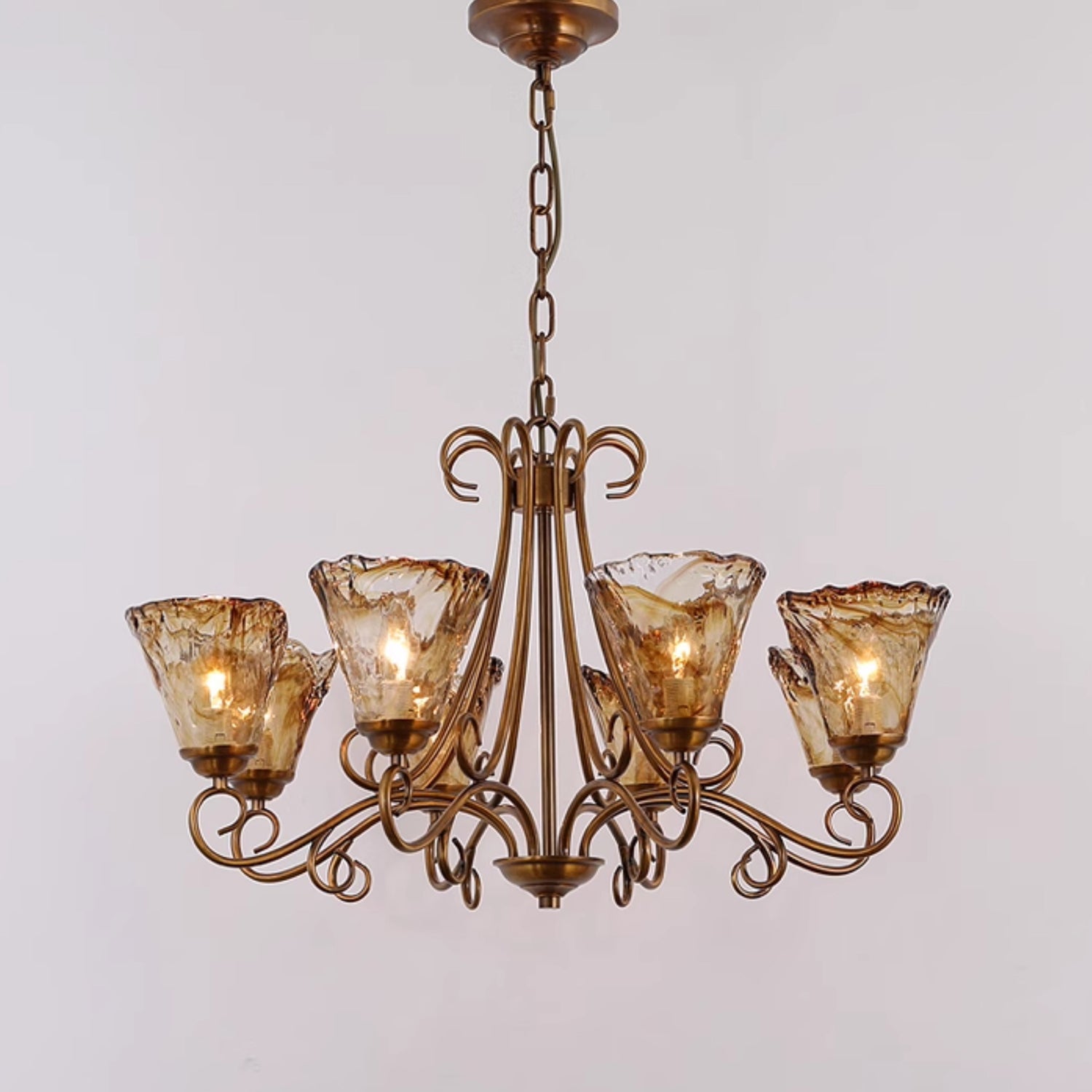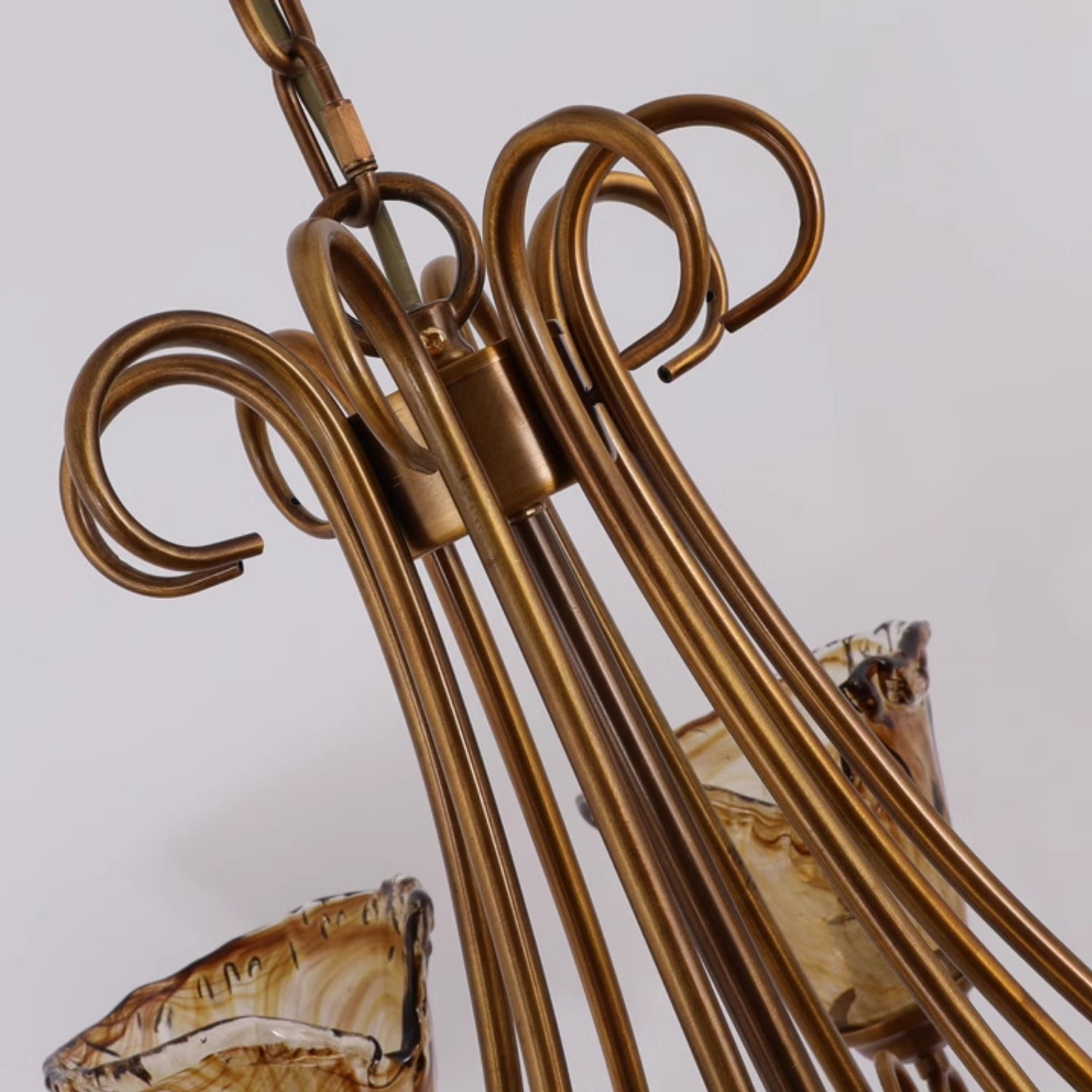 The Fratelli Chandelier by Mooijane blends classic elegance with refined artistry. Featuring gracefully curved metal arms in an antique brass finish, it exudes timeless sophistication. Each hand-blown amber glass shade is uniquely crafted, with natural ripples that create a soft, golden glow when illuminated. Ideal for dining rooms, living spaces, or traditional interiors, this chandelier brings warmth, romance, and vintage charm to any setting.