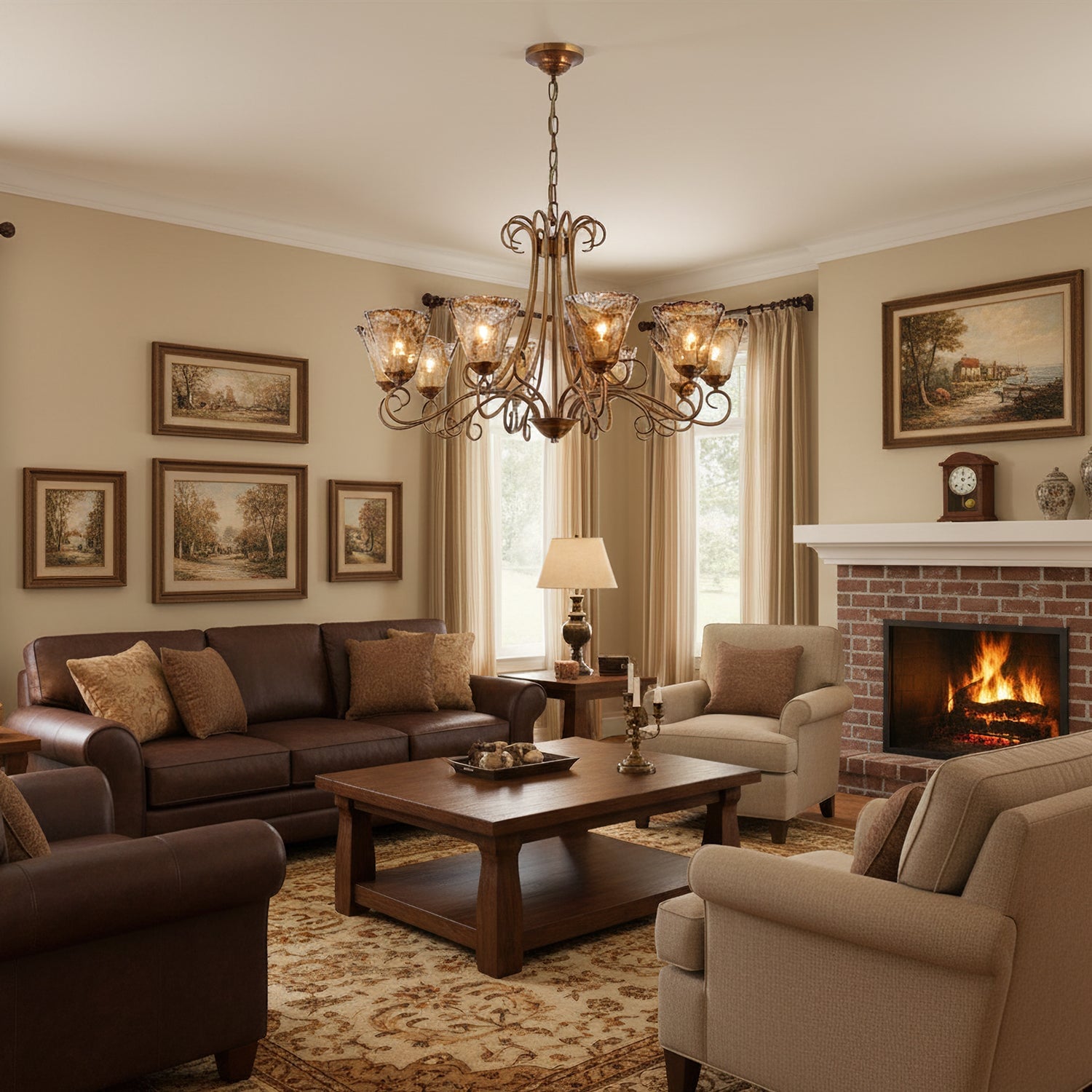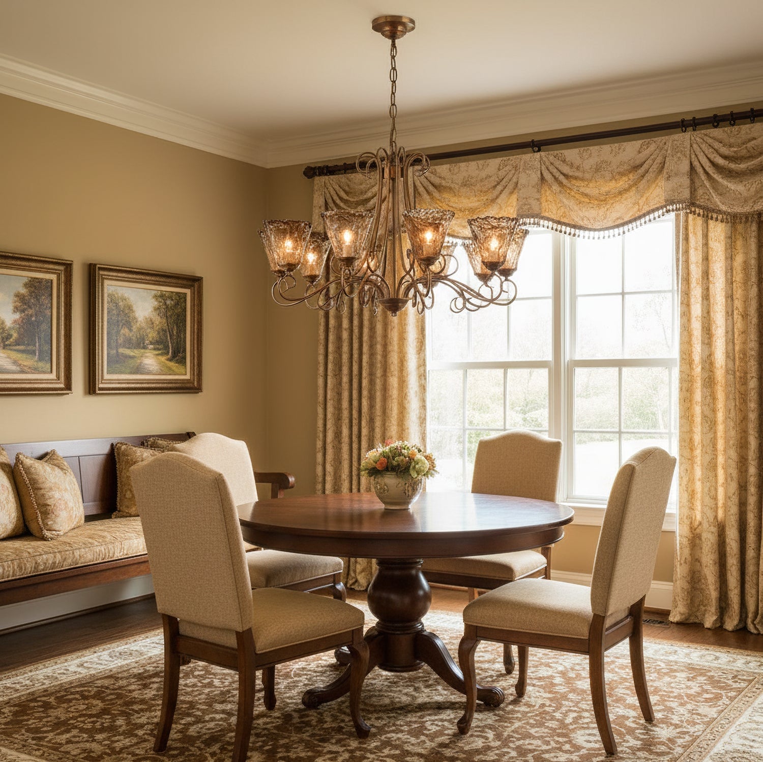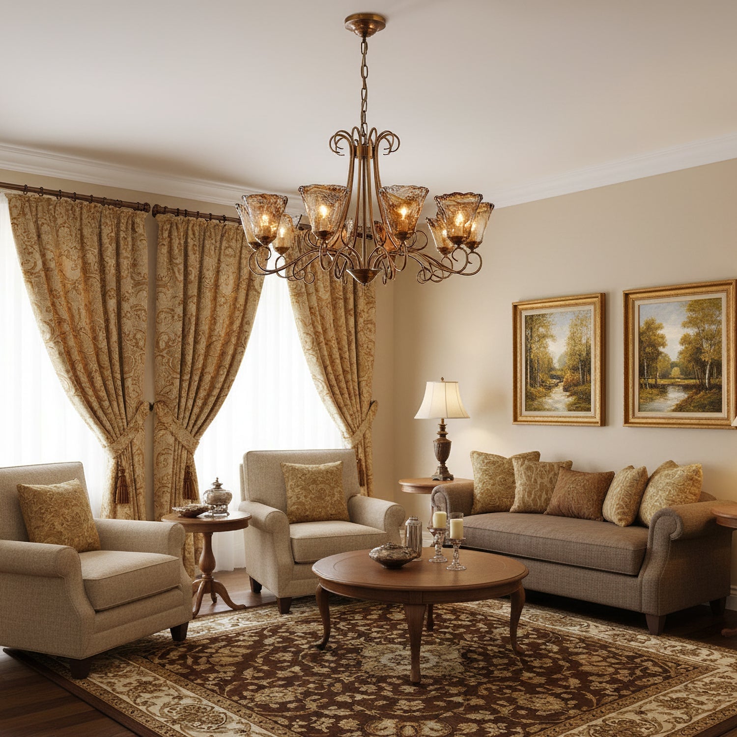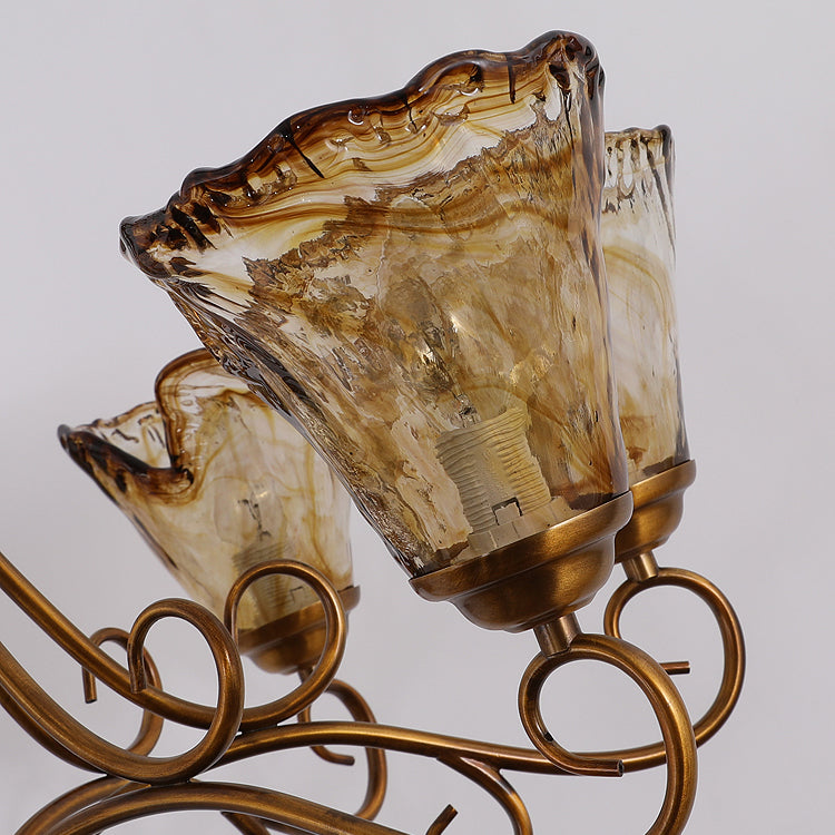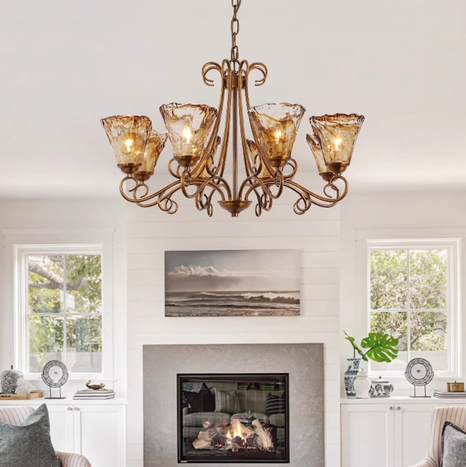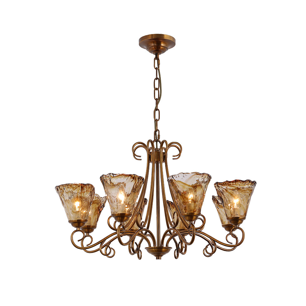 The Fratelli Chandelier by Mooijane blends classic elegance with refined artistry. Featuring gracefully curved metal arms in an antique brass finish, it exudes timeless sophistication. Each hand-blown amber glass shade is uniquely crafted, with natural ripples that create a soft, golden glow when illuminated. Ideal for dining rooms, living spaces, or traditional interiors, this chandelier brings warmth, romance, and vintage charm to any setting.